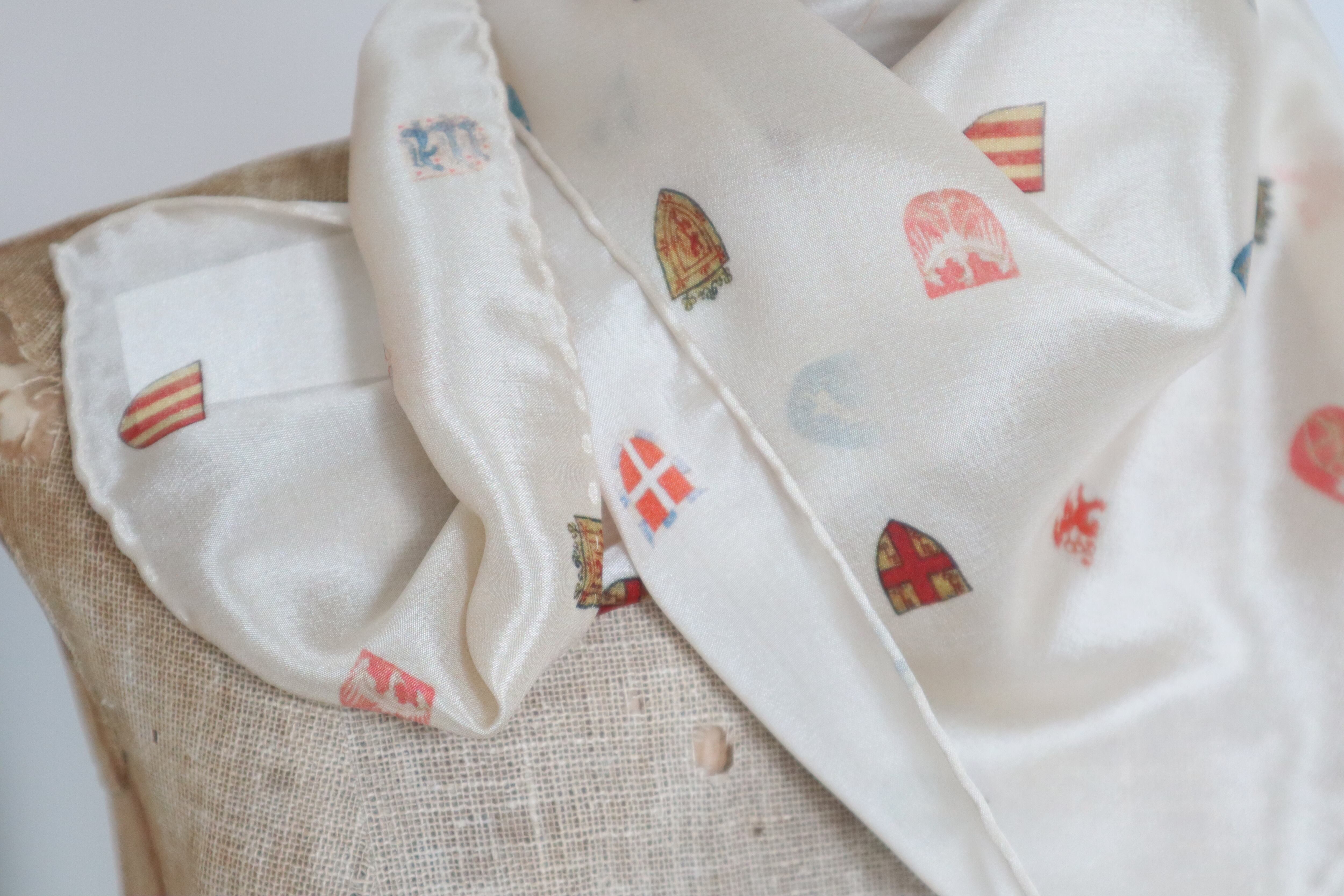 COAT OF ARMS SILK SCARFは、様々な勲章が華やかにプリントされたシルクスカーフです!高級感溢れるシルク素材は、なめらかな肌触りで、首元に優しくフィットします。多彩なデザインは、コーディネートのポイントとしても最適で、シンプルな装いに華やかさをプラスしてくれます。日常使いはもちろん、特別な日の装いにもぴったりです。自分へのご褒美や大切な方へのギフトにも喜ばれること間違いなしです!