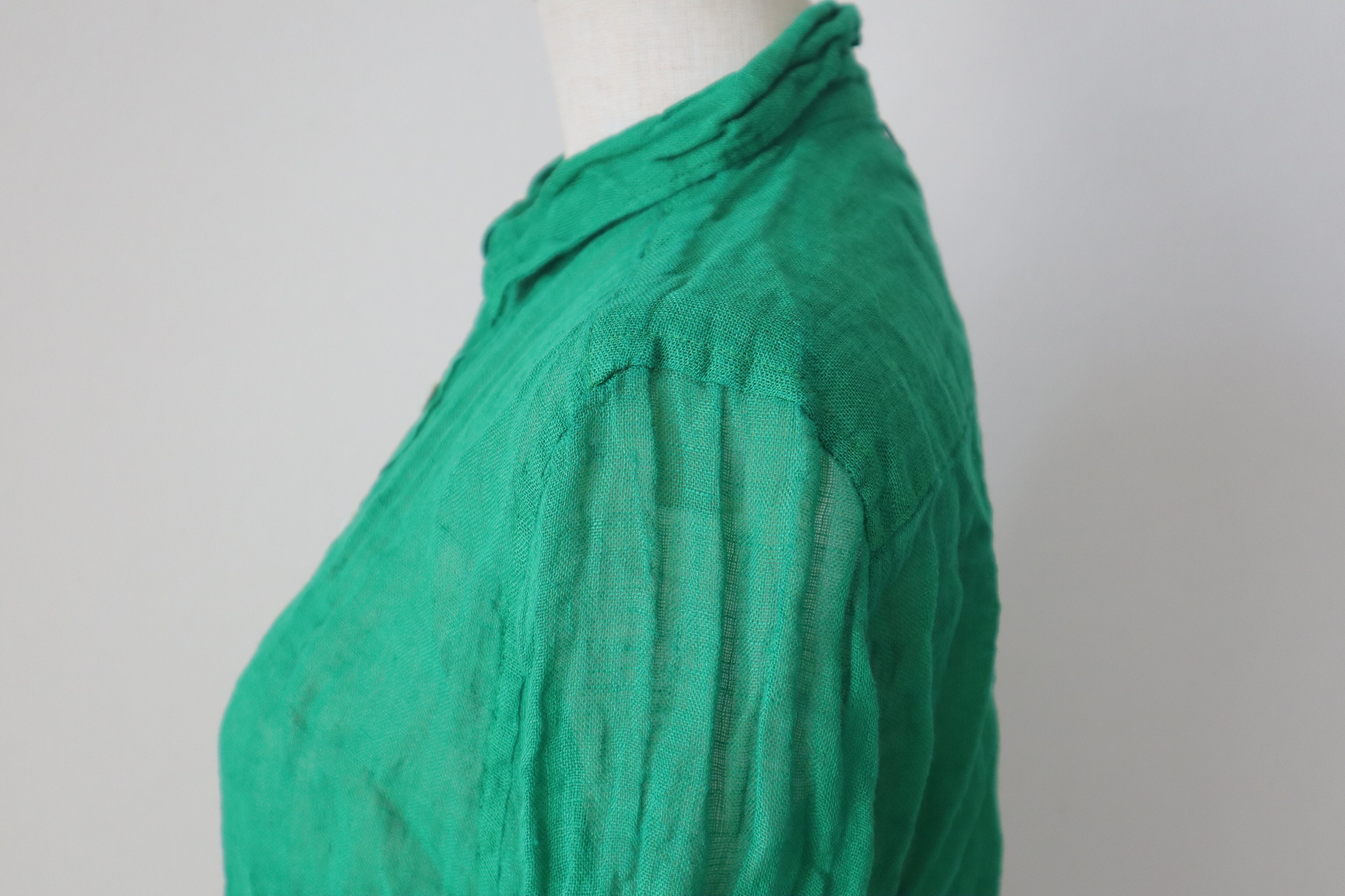 デンスリーガーゼリネン素材を使用した鮮やかなグリーンのシャツです。デンスリーガーゼリネン素材のさらりとした肌触りで、通気性も良く、暑い季節にも快適です。着て行くと風合いも柔らかくなり馴染んで行きます。