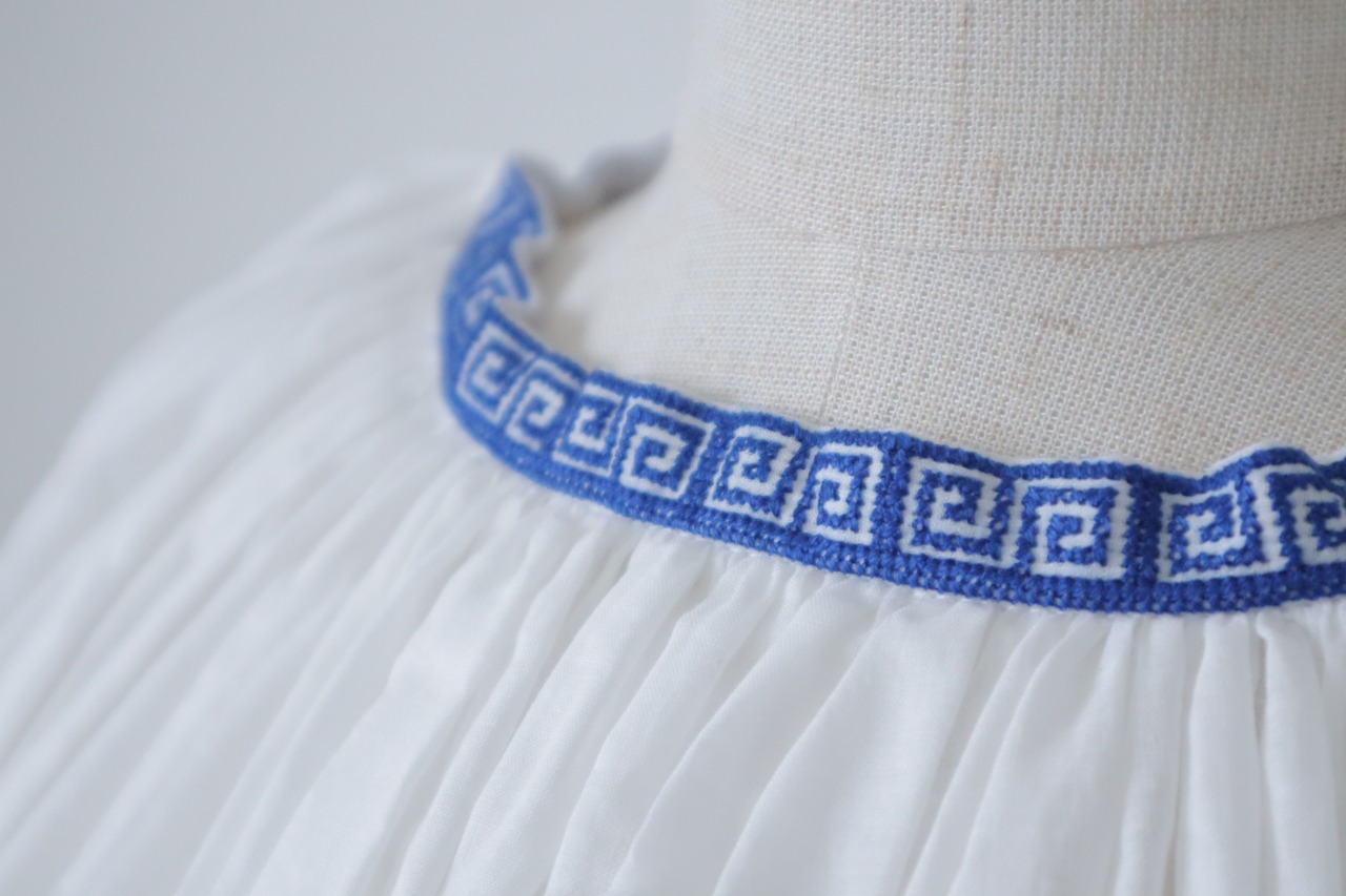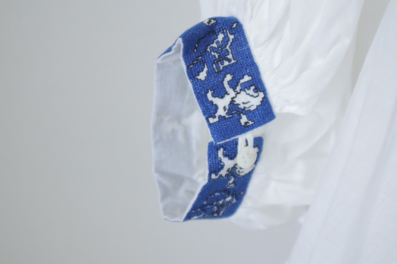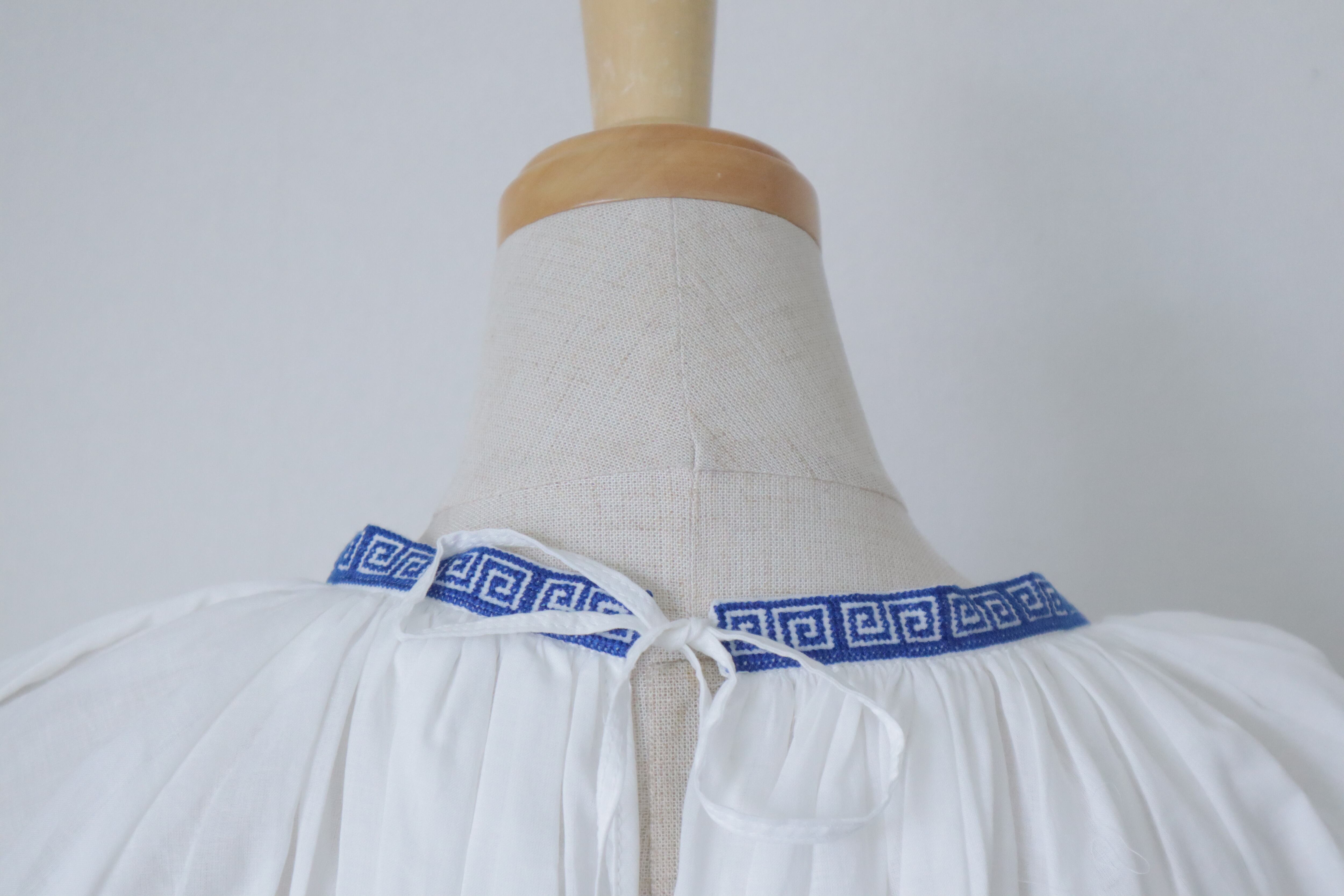 涼しげなブルーとホワイトの美しい刺繍が施されたギャザースモックです。襟とお袖の刺繍が綺麗。
