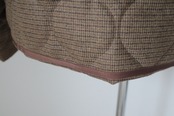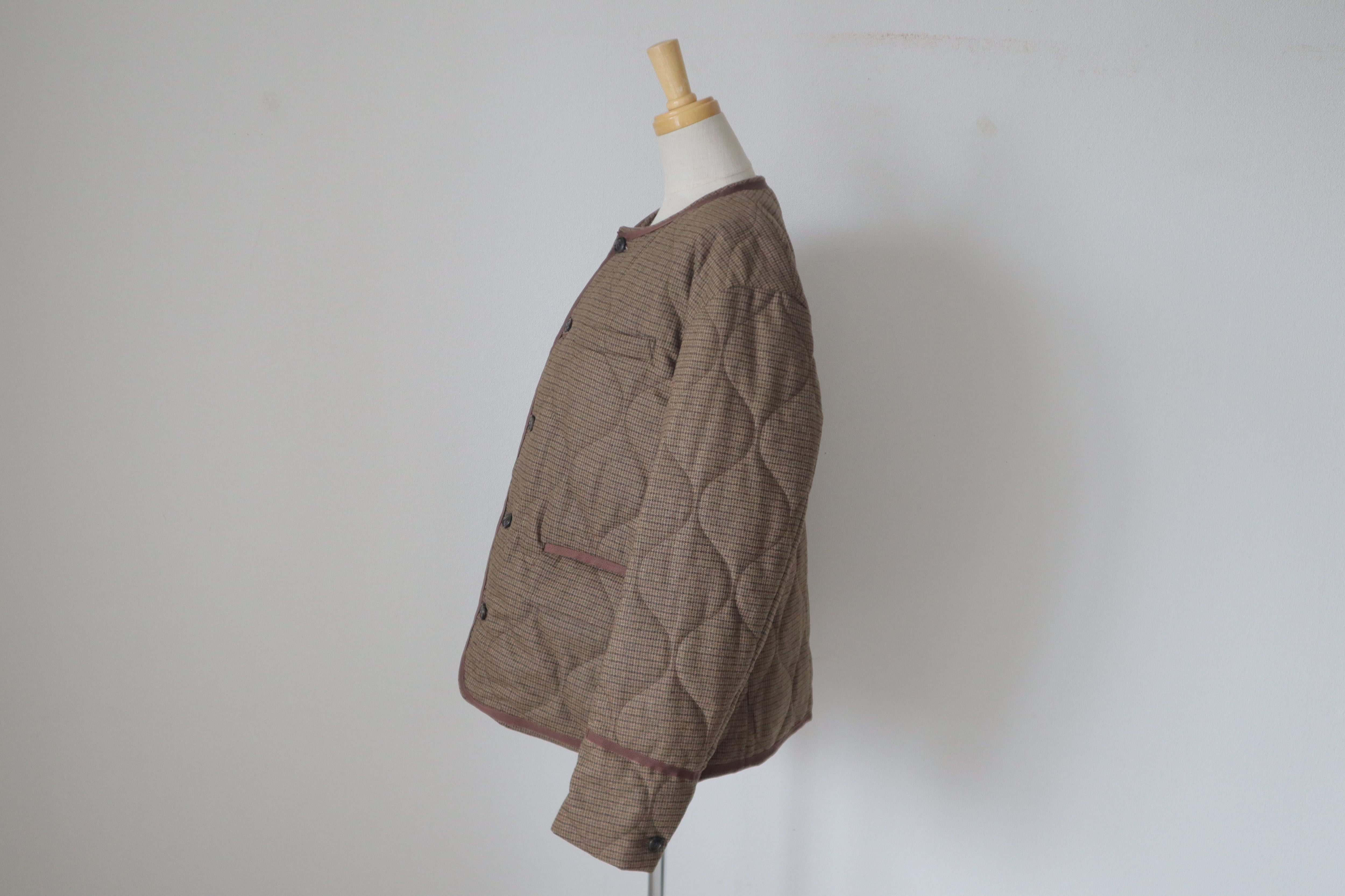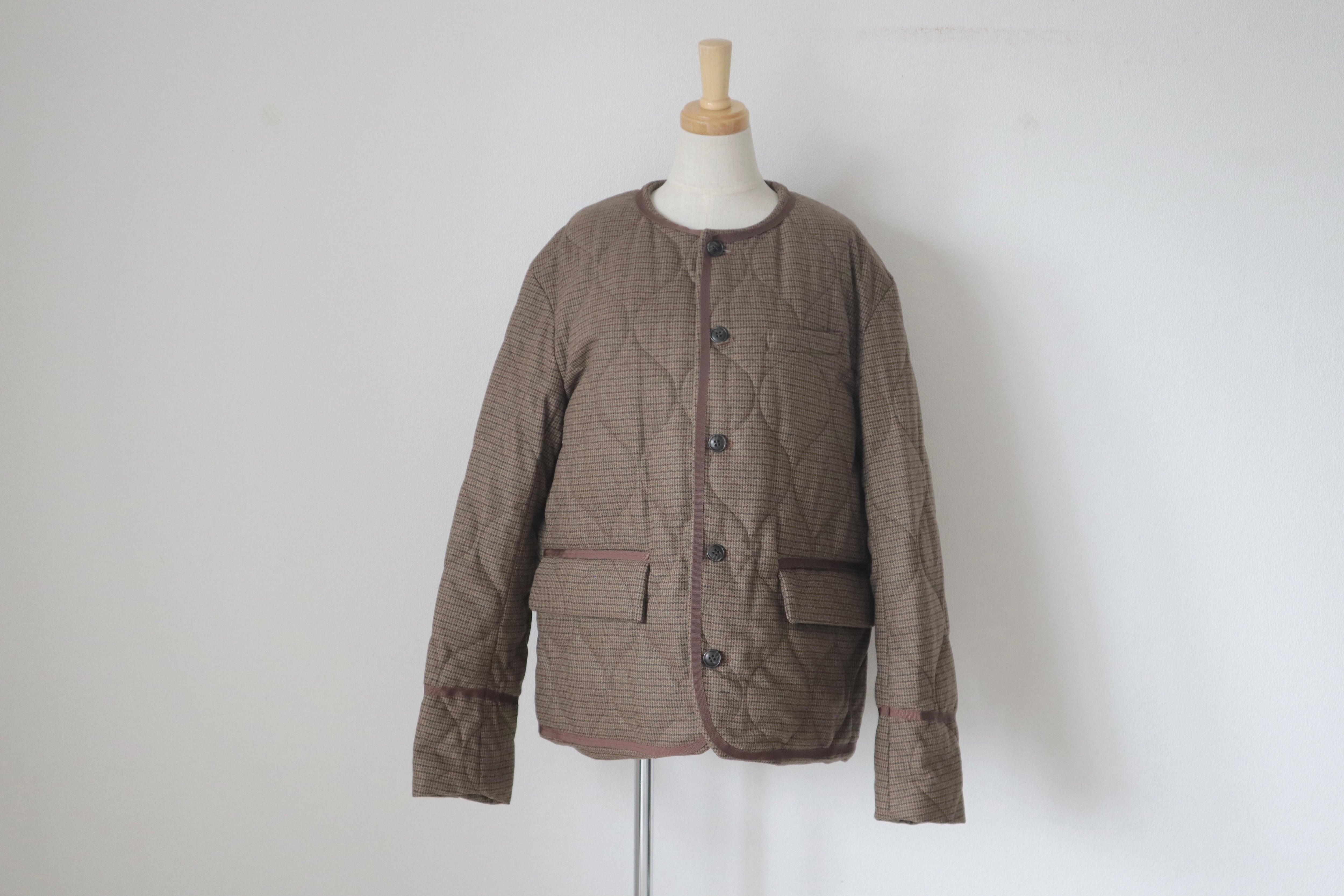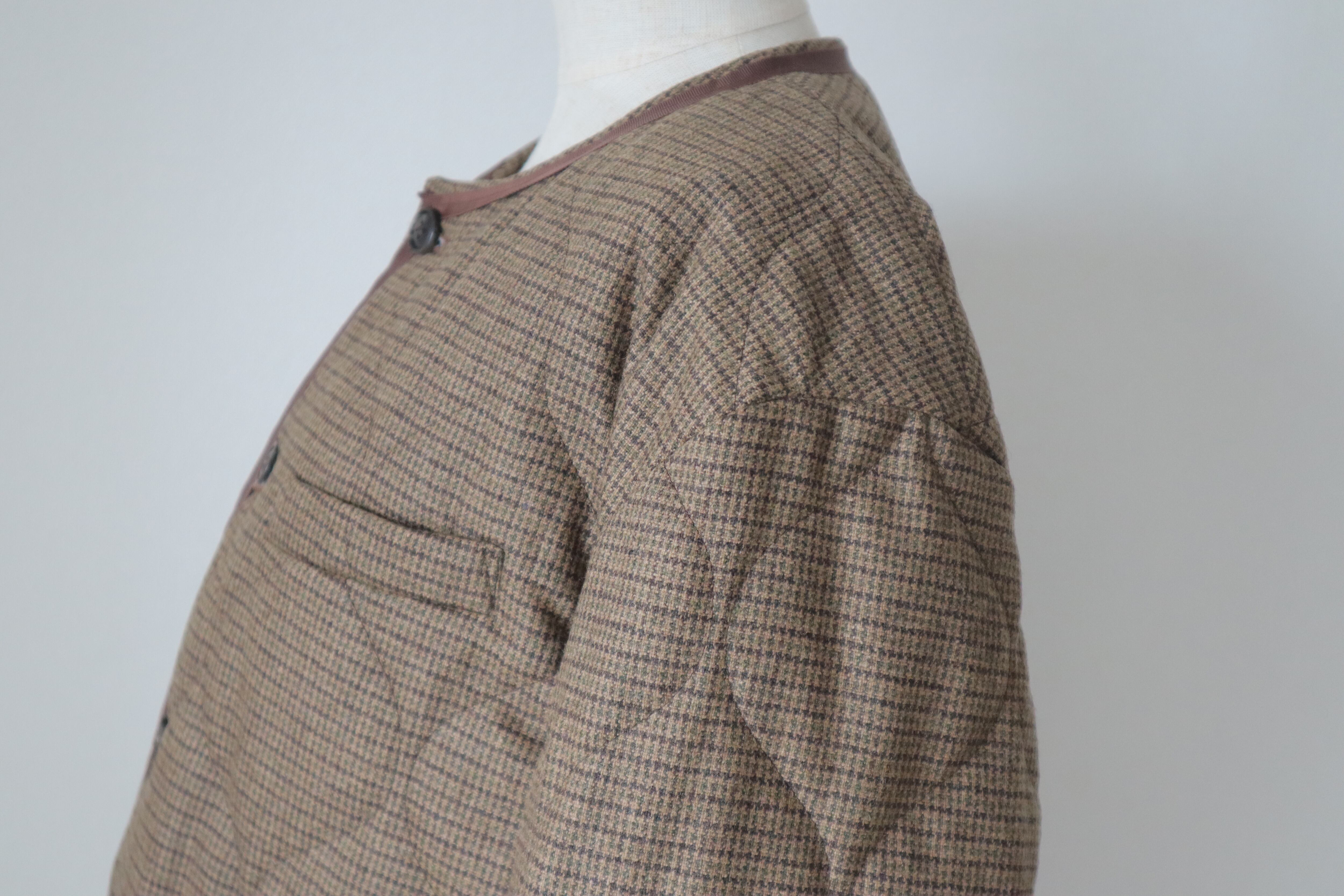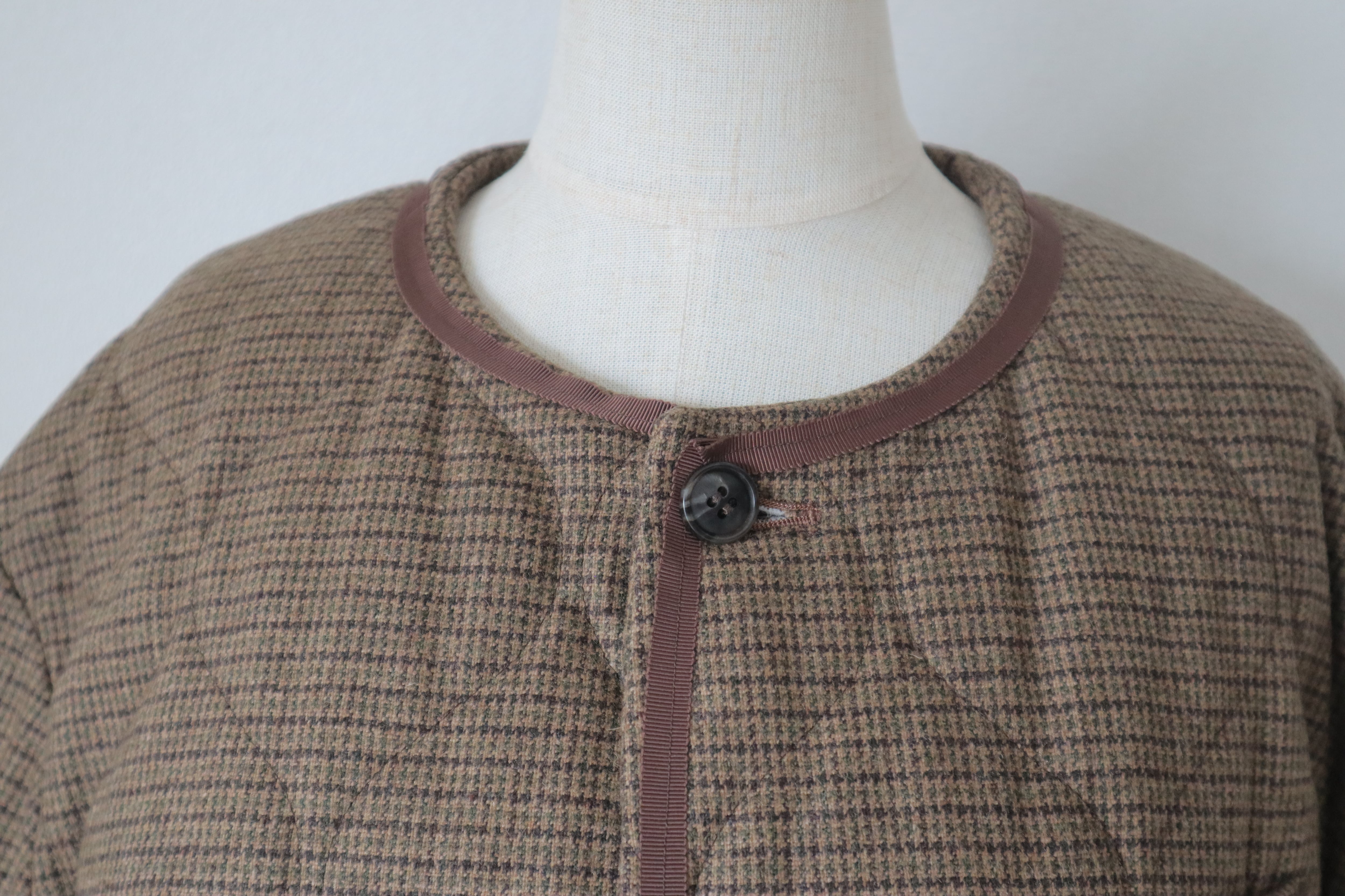メンズブランド、オールドマンズテーラーの軽やかなキルティング素材で仕立てられたブラウンチェックのノーカラージャケットです。