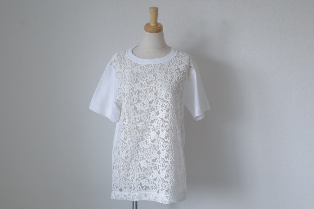 華やかなレースが特徴的なCROWN MOTIF LACE DOCKING H/T SHIRTです。身頃には美しいレースが施され、背中と袖はコットン素材で仕上げられています。