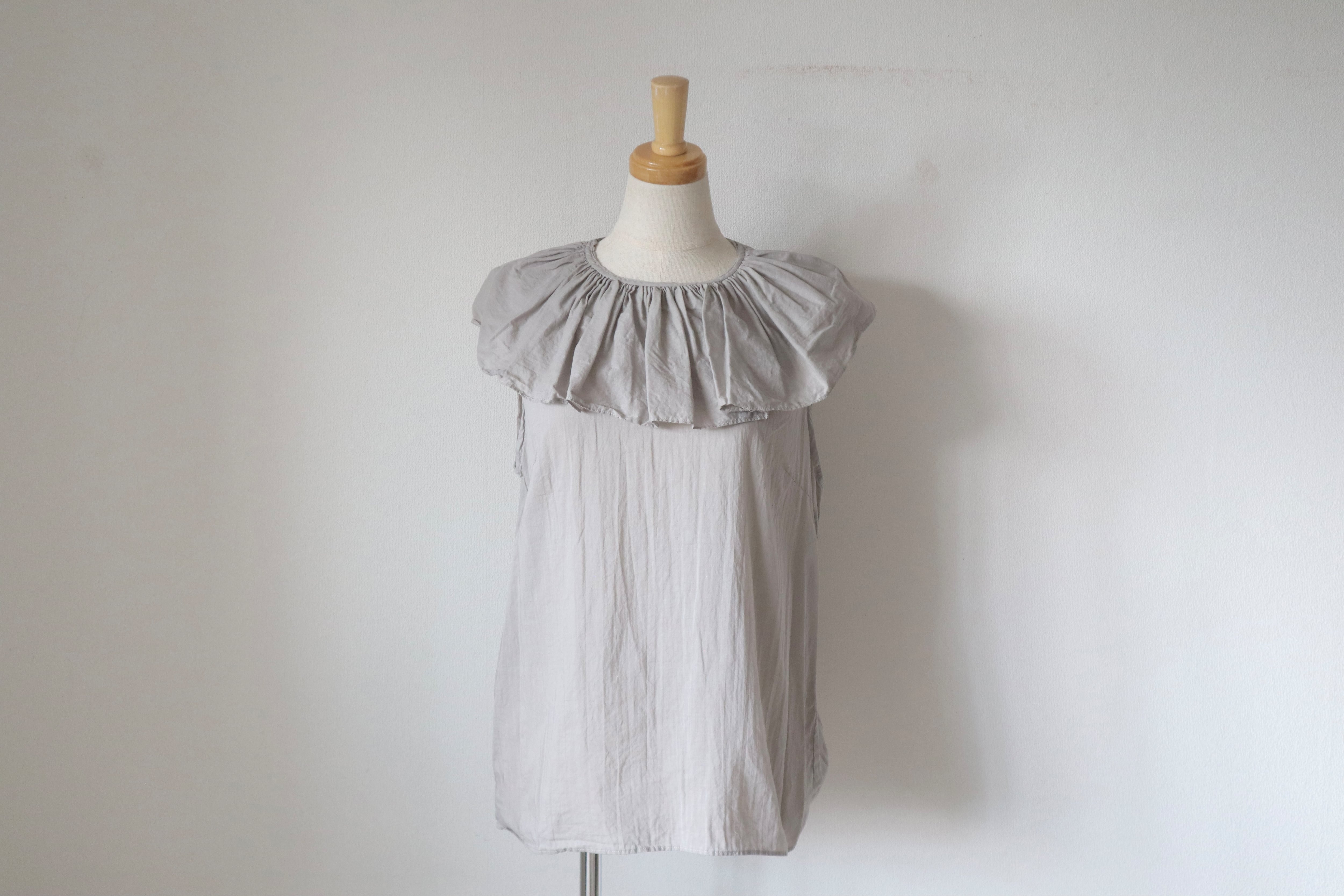 淡いグレーが優雅に柔らかい肌触りのローン素材のノースリーブブラウスです。ピエロカラーの襟がポイントで肩も隠れますのでノースリーヴ初心者の方にめ安心して着れます。後ろに一つボタンがついていて