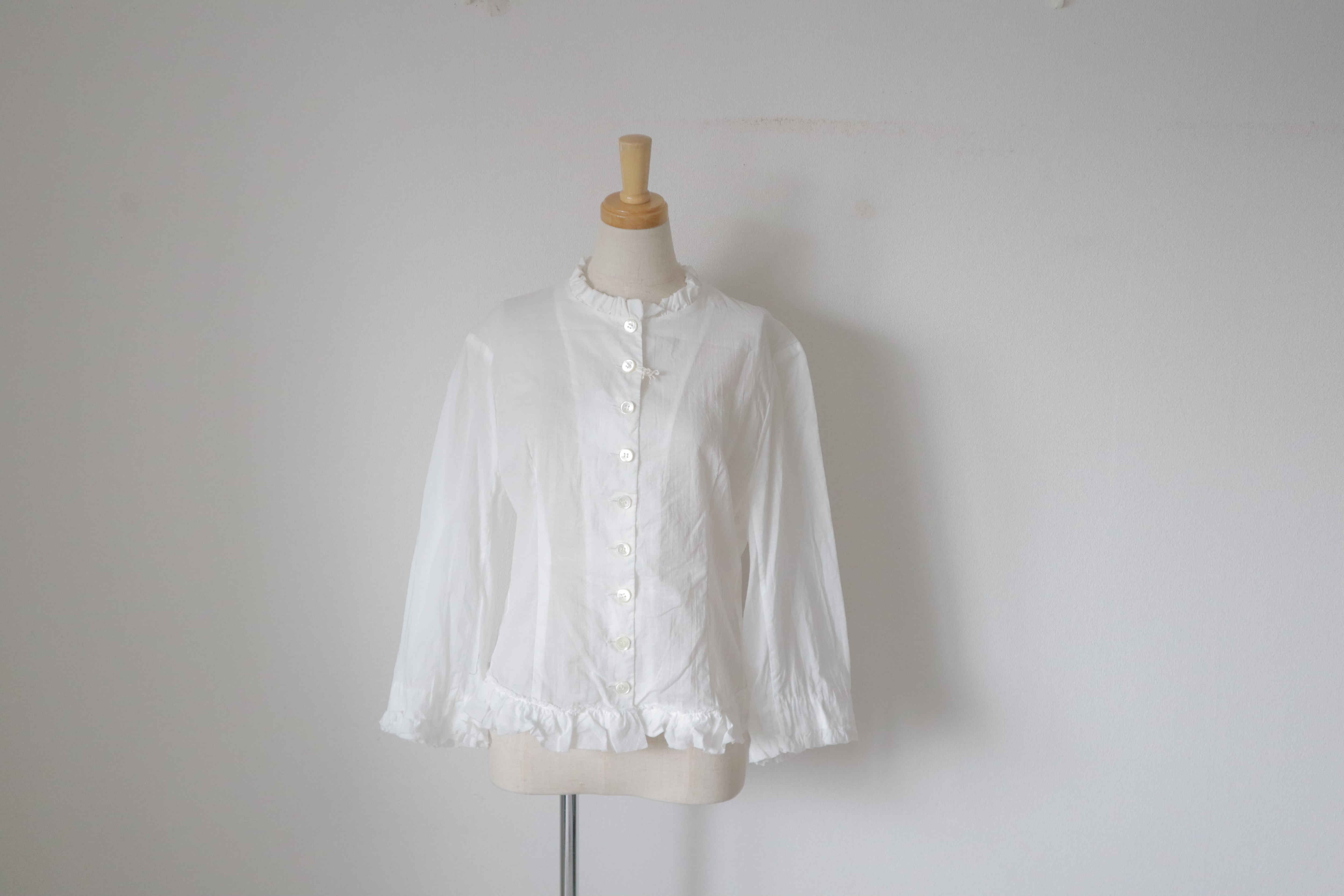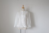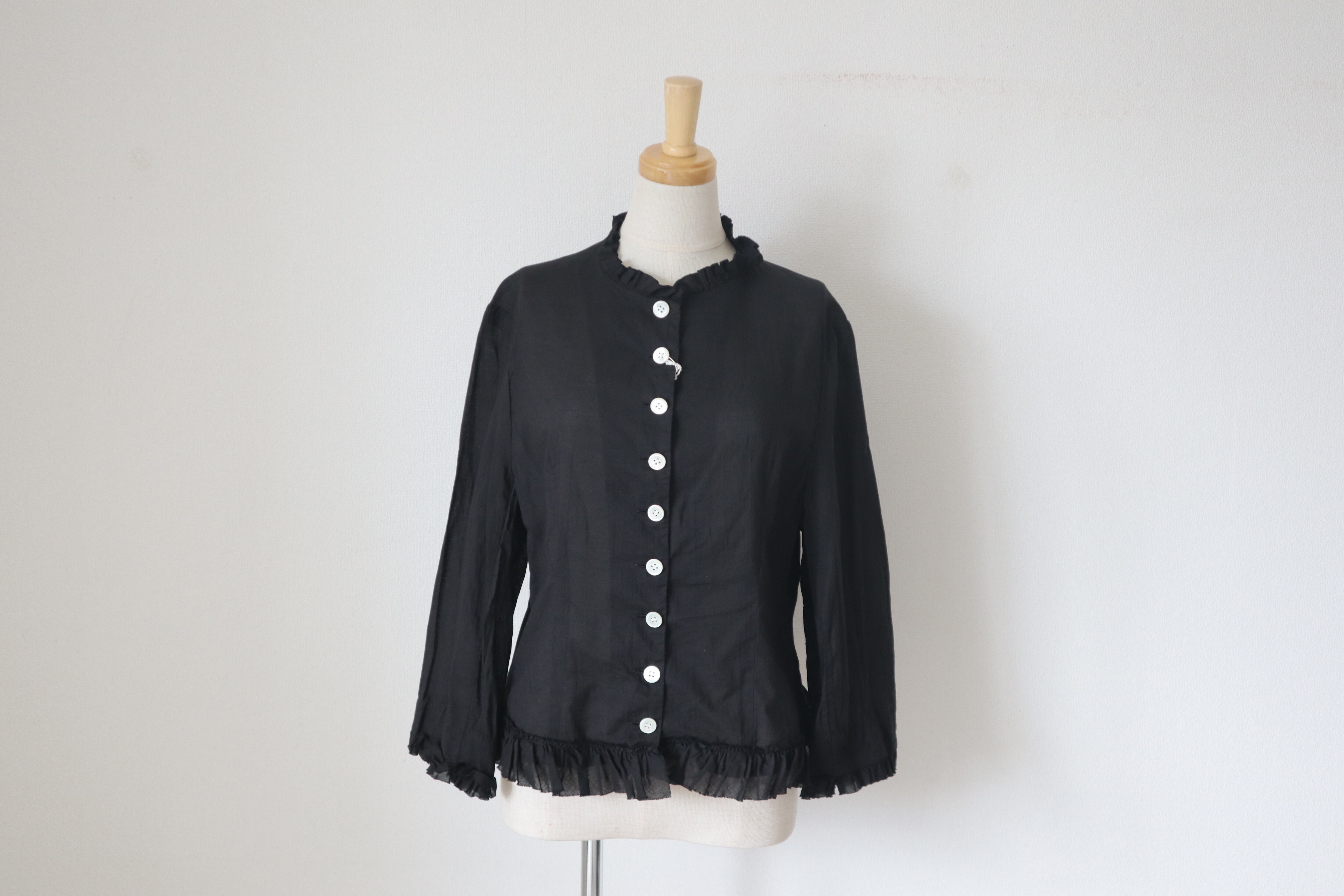 GARMENT DYE LAWN FRLL JACKETは、柔らかな肌触りのコットンのローン素材を使用したフリルジャケットです。襟、袖、裾に施されたフリルが素敵。前ボタンでクラシックな雰囲気。
