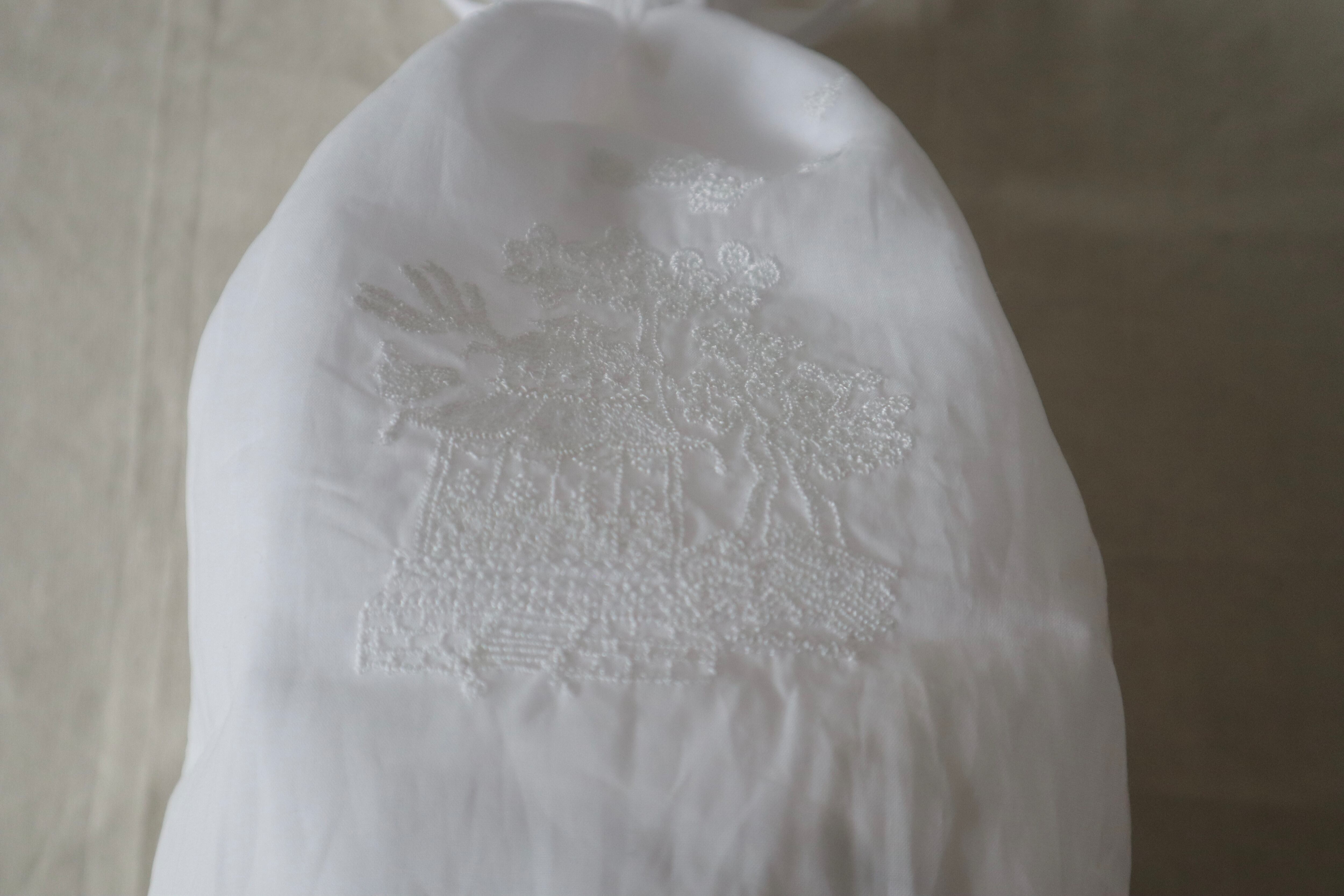 C.O WILLOW PATTERN DRAWSTRING BAGは、美しい刺繍が施された巾着バッグです。軽やかなコットンオーガンジー素材を使用された美しい巾着です。