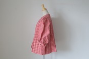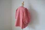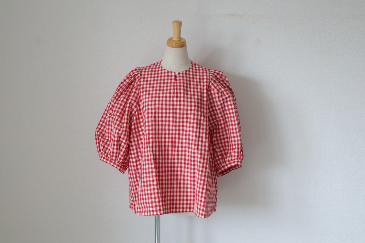 GINGHAM CHECK BIG BALLOON SLEEVE BLOUSEは、バルーンスリーブのギャザーが綺麗なギンガムチェックのブラウスです。前には小さなボタンが付いており、着脱もスムーズ。コットンとリネンを使用したしっかりとした布地に、少しシルクが入って上品な光沢があるブラウスです。