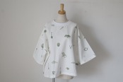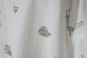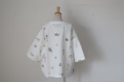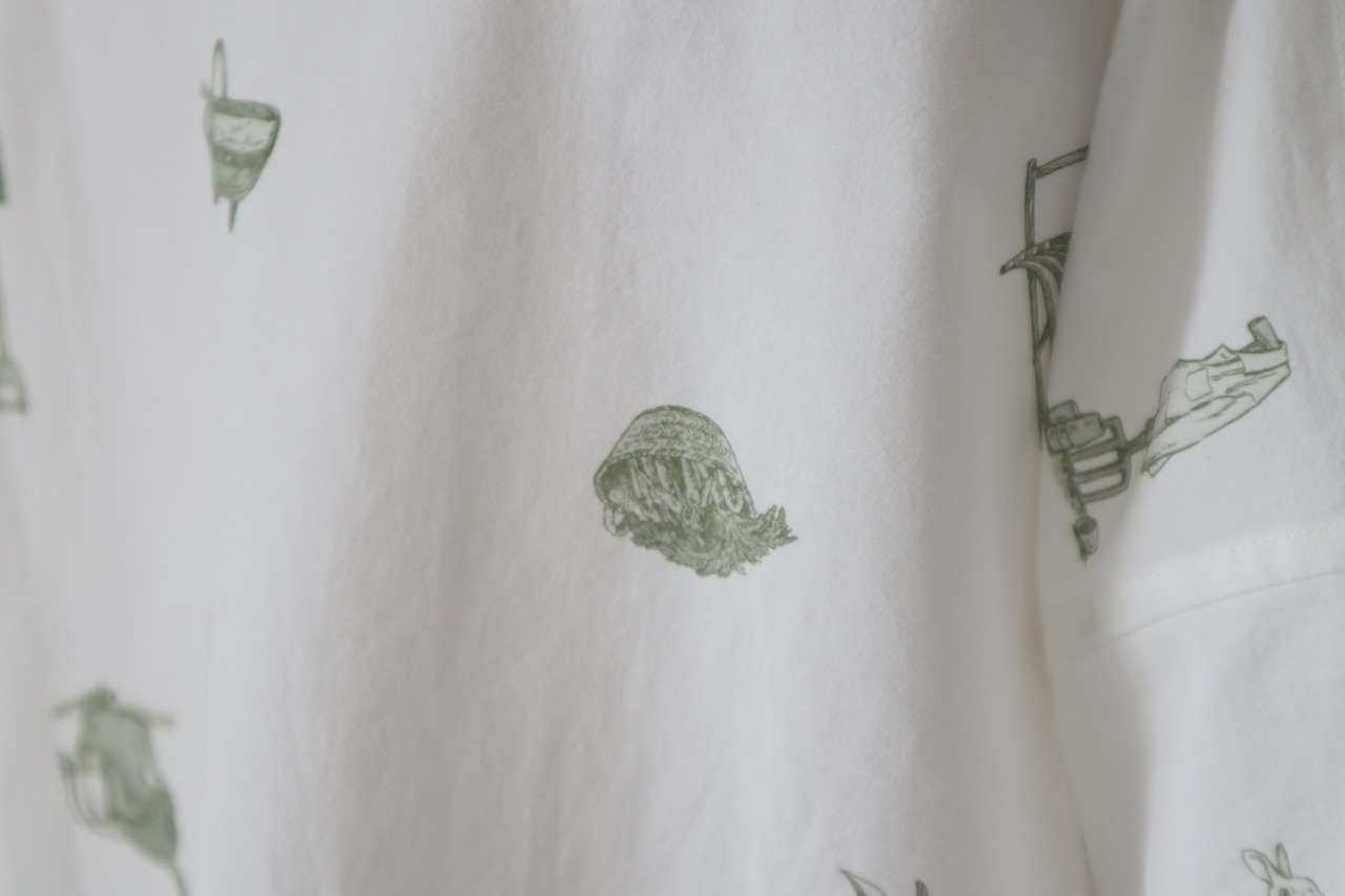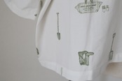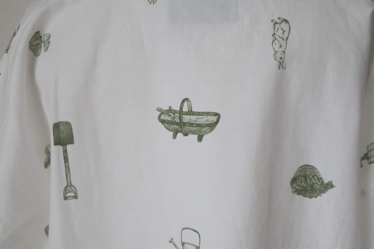 C/L G.G.T DOCKING T-SHIRTは、襟周りにリブ素材を使用したデザインが特徴のTシャツです。コットンとリネンの混紡素材で、肌触りが良く、涼しさも感じられます。ガーデングッズや犬、うさぎなどのかわいらしいプリントが施されています。