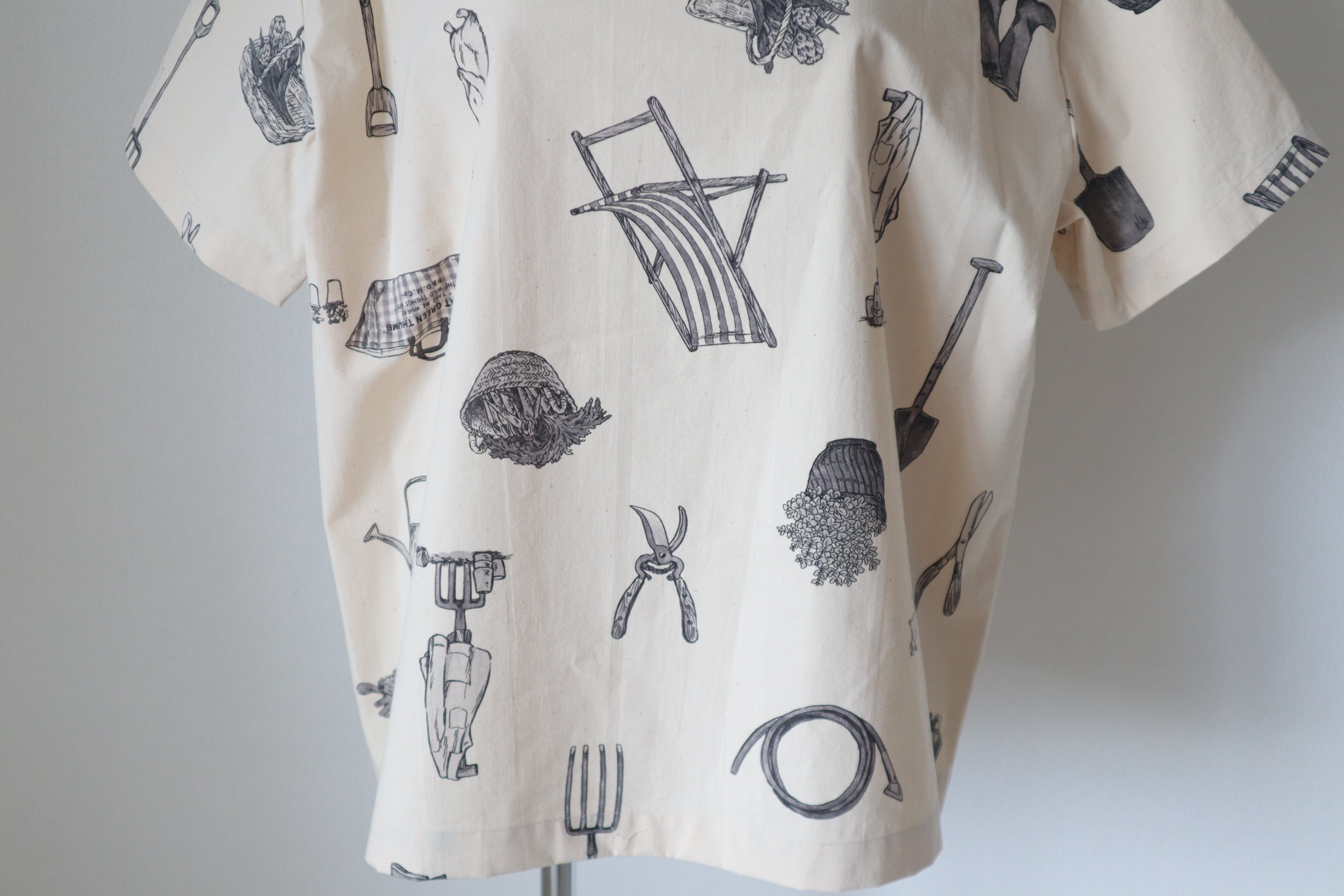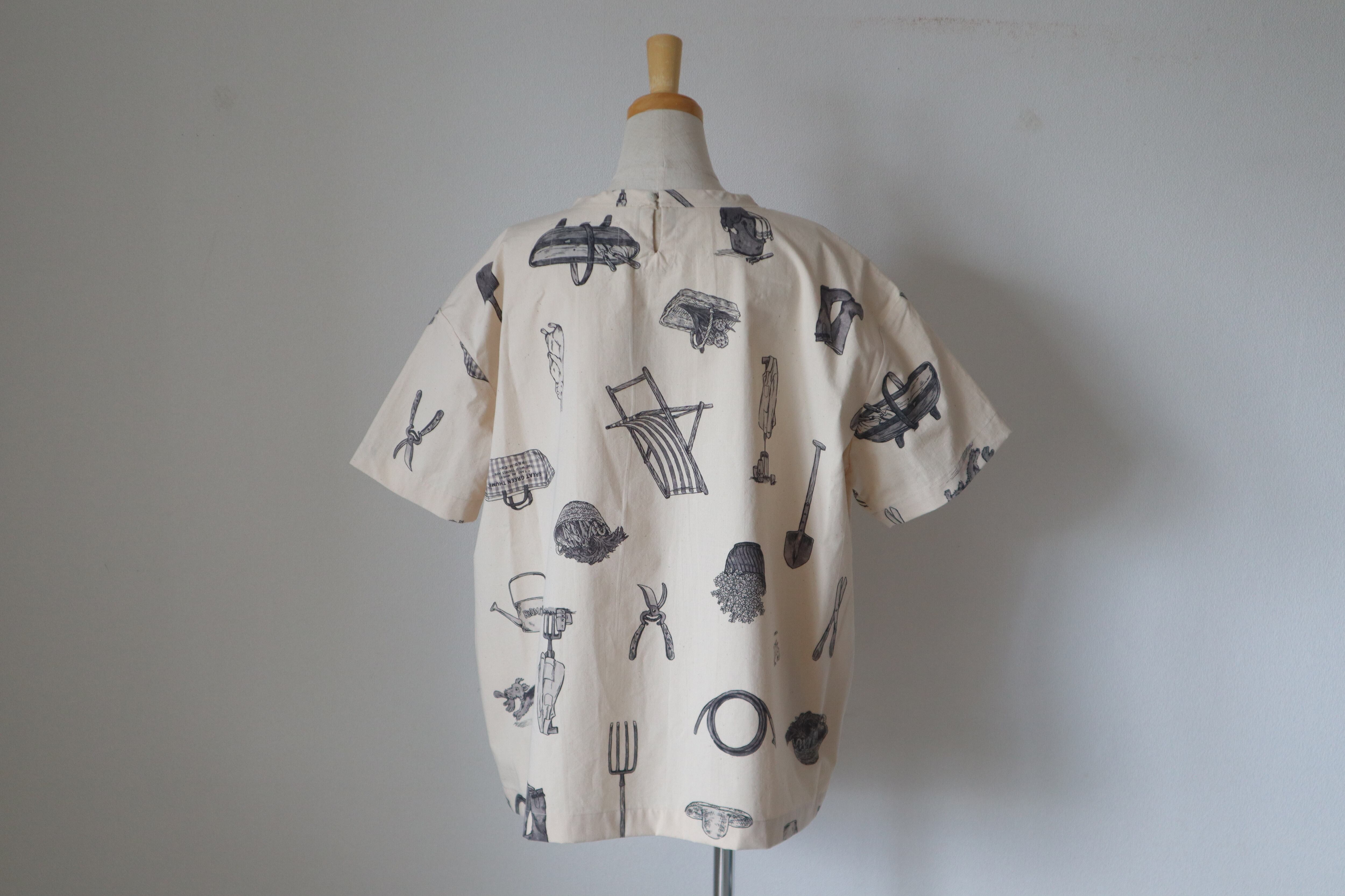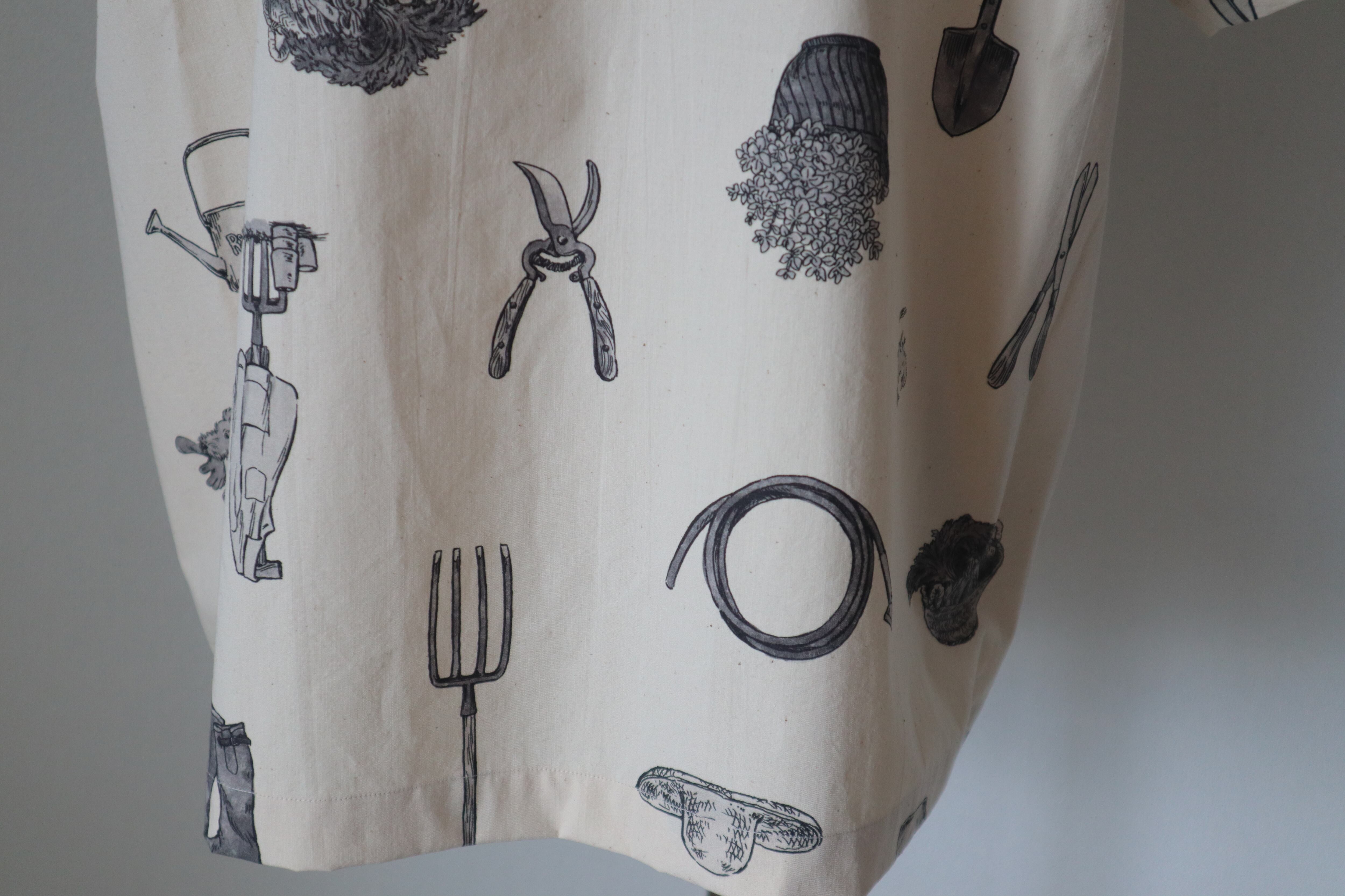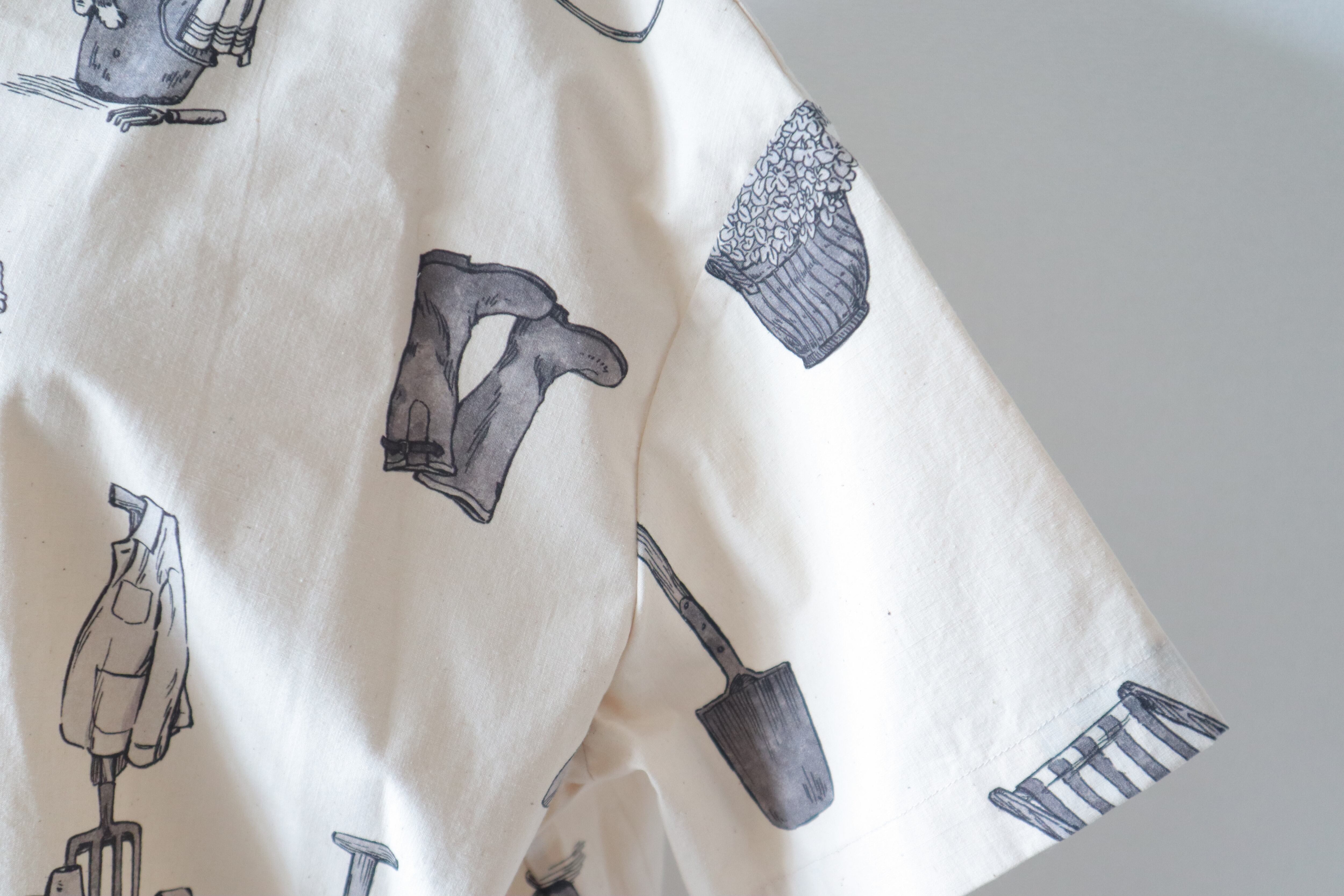 G.G.T HALF SLEEVE SHIRTは、シーチングのようなしっかりとしたコットン100%で作られた、ガーデングッズがモノトーンで描かれた半袖シャツです。