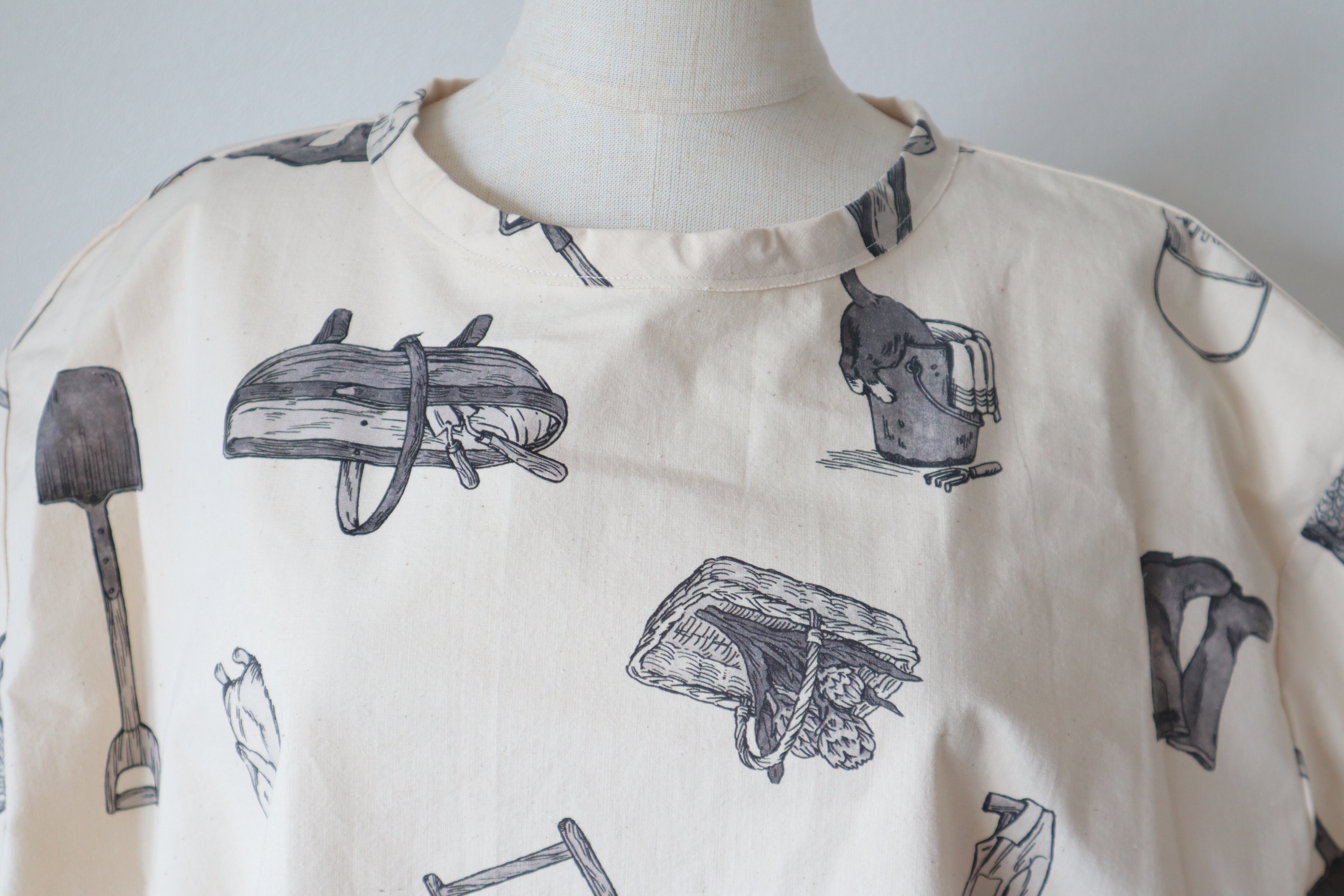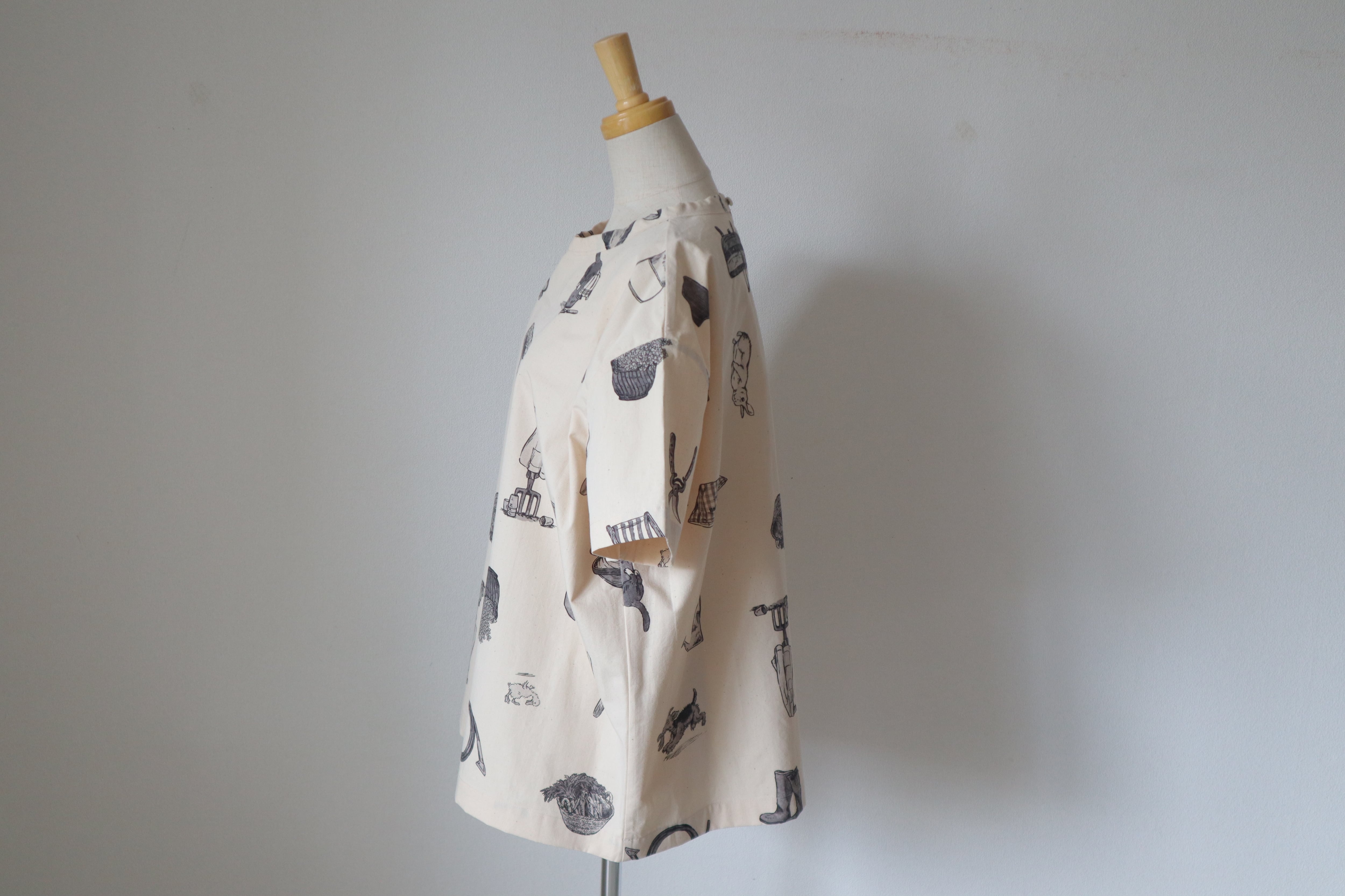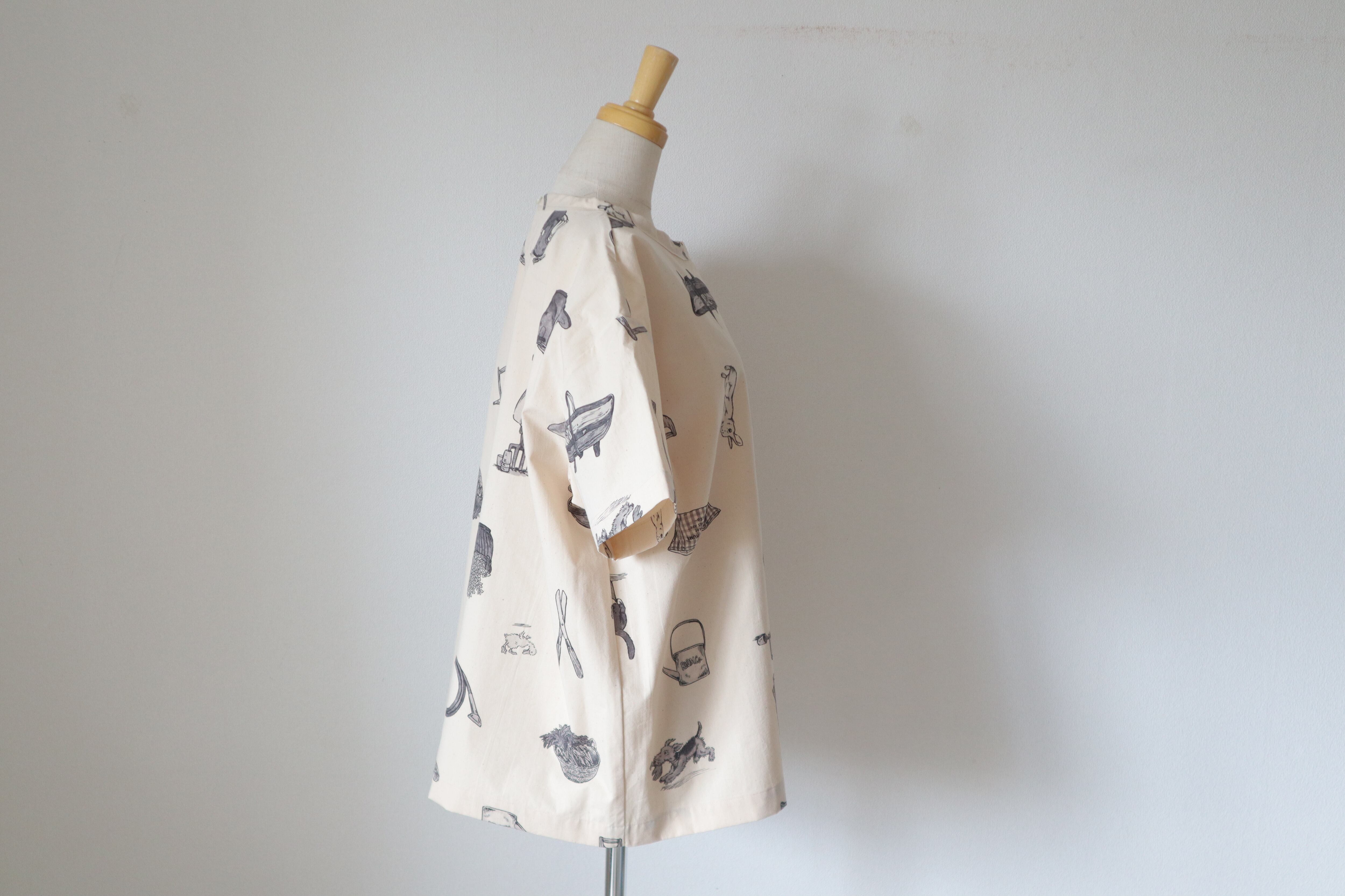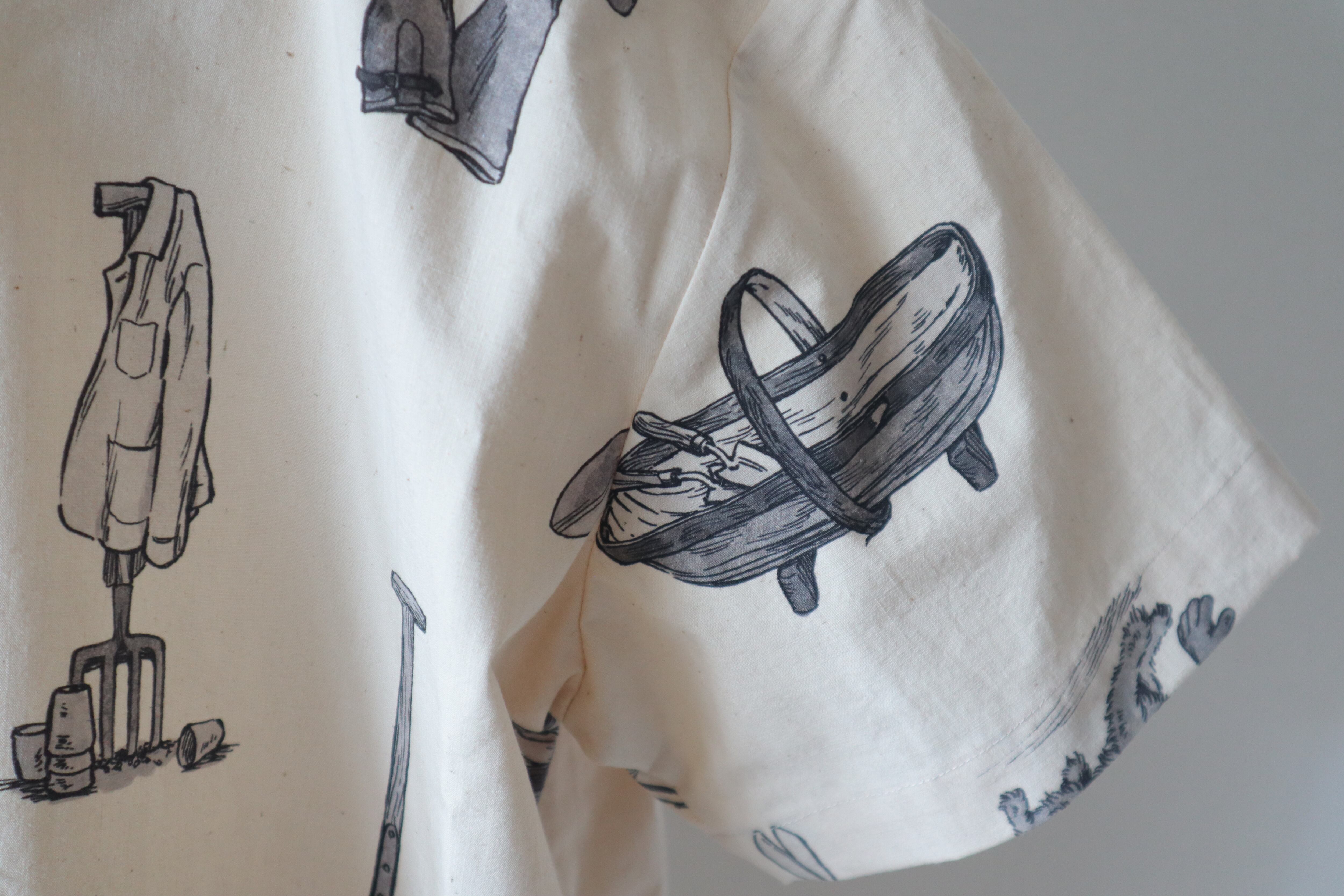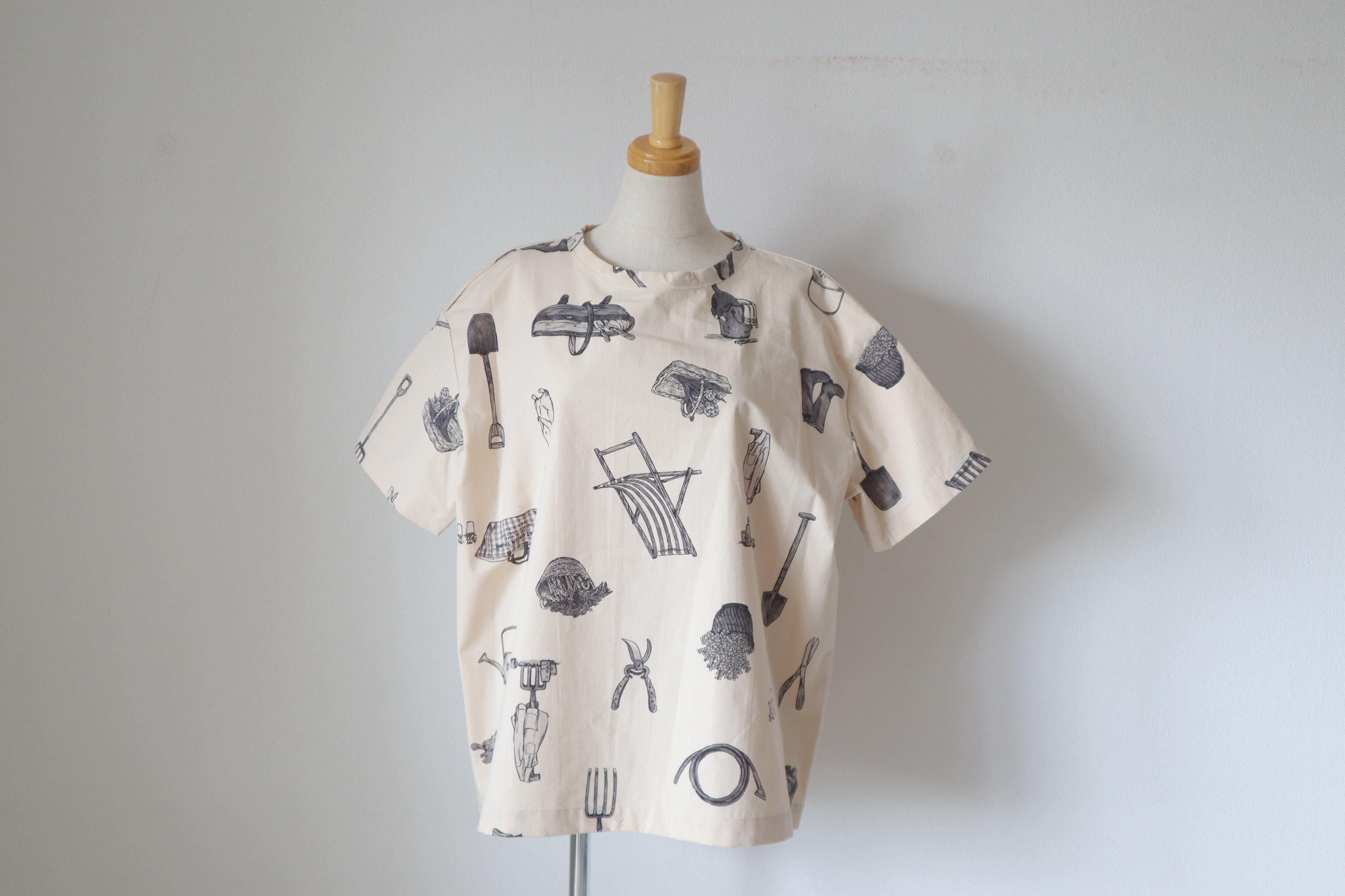 G.G.T HALF SLEEVE SHIRTは、シーチングのようなしっかりとしたコットン100%で作られた、ガーデングッズがモノトーンで描かれた半袖シャツです。