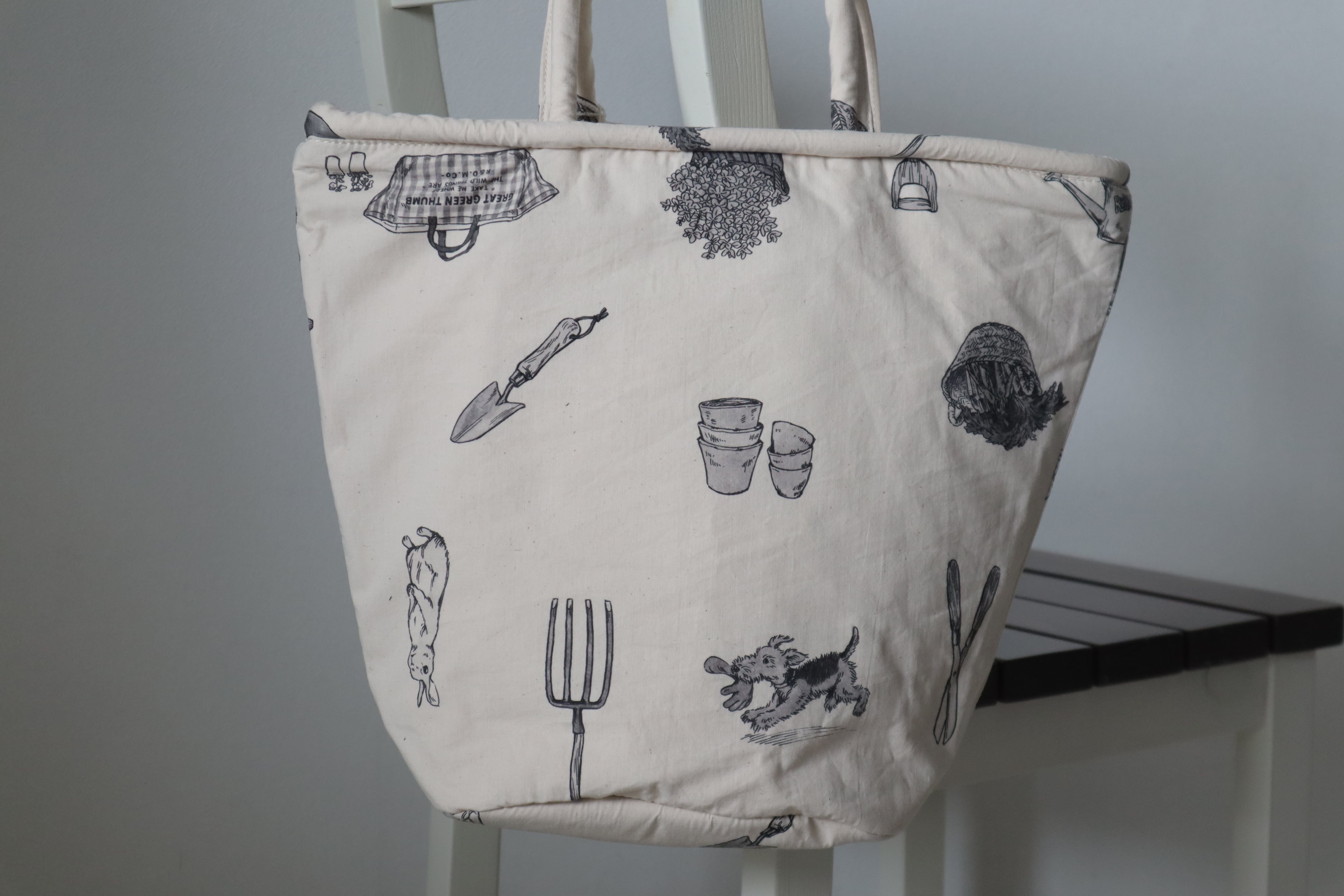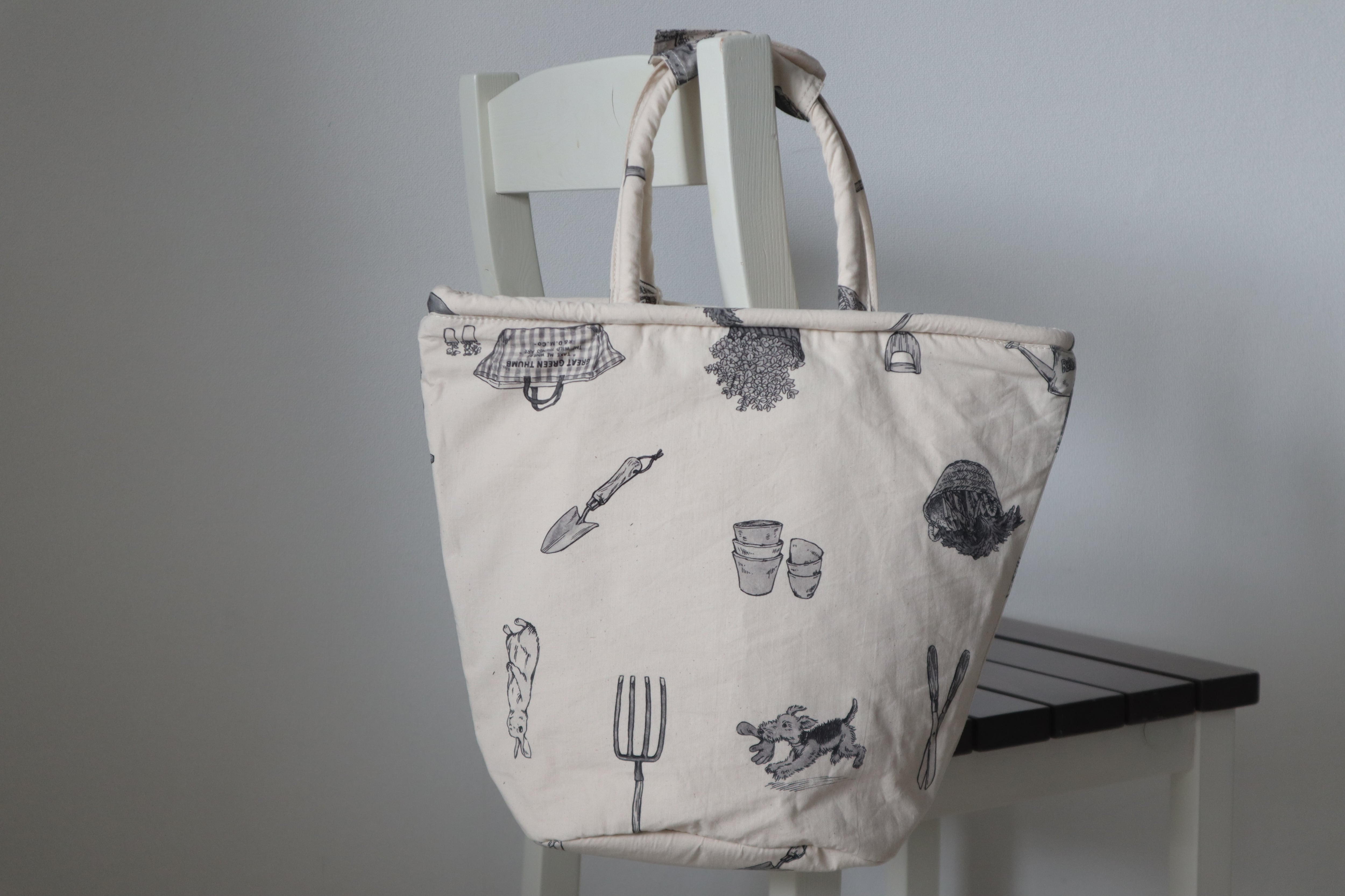 G.G.T MARCHE BAG(TALL)は、ガーデングッズがモノトーンで描かれた縦長のマルシェバッグです。お買い物や普段使いにも。