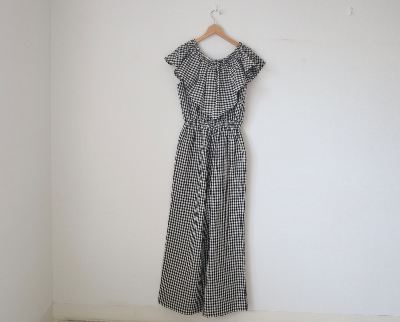 G.C SCAF COLLAR COMBINATIONは、コットン、リネン、シルクの混紡で作られたギンガムチェック柄が特徴のスカーフカラーの襟がついたコンビネーションです。ウエストにゴムが入っていてパンツはストレートでスッキリと。