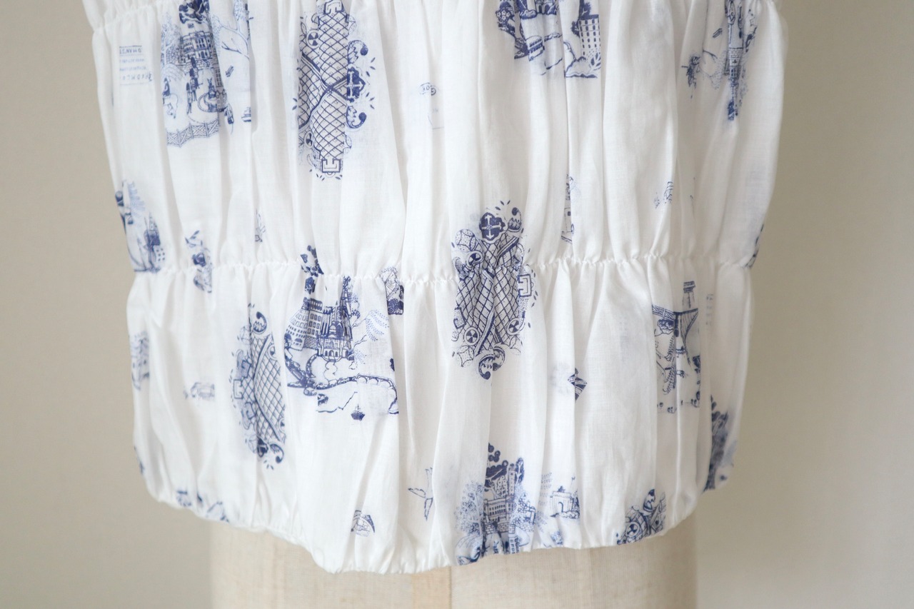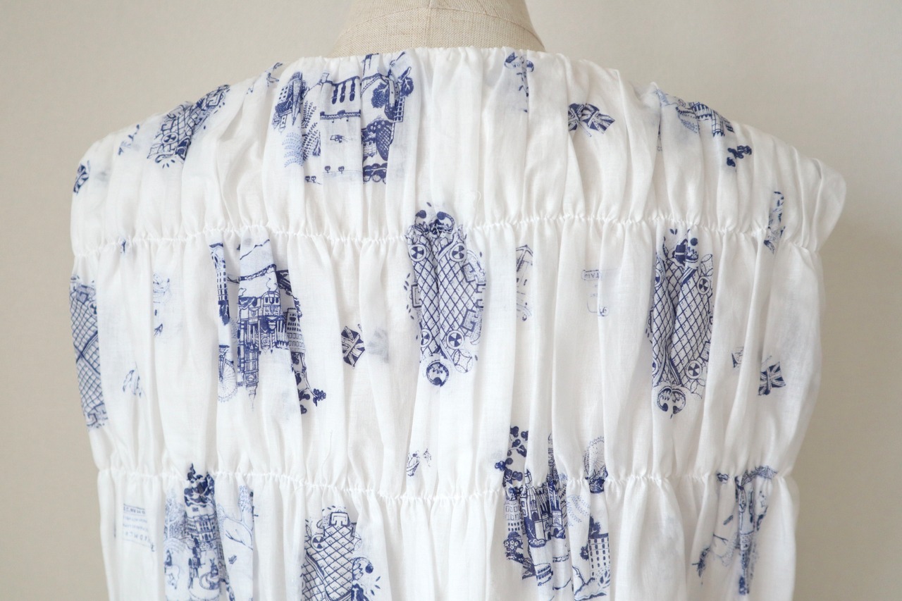 TRELLIS C.S SHIRRING VESTは、白地にブルーが映えるロンドンウィロー柄の美しいデザインが目を引くベストです。前身頃にはTRELLISステッチが施され、後ろ身頃はギャザー、前あきのジップ付き。