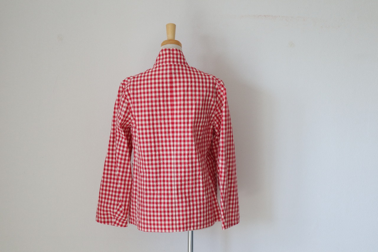ギンガムチェック柄の一枚仕立てのジャケットです。コットン、リネン、シルクの混紡素材を使用しており、軽やかに羽織ることができます。