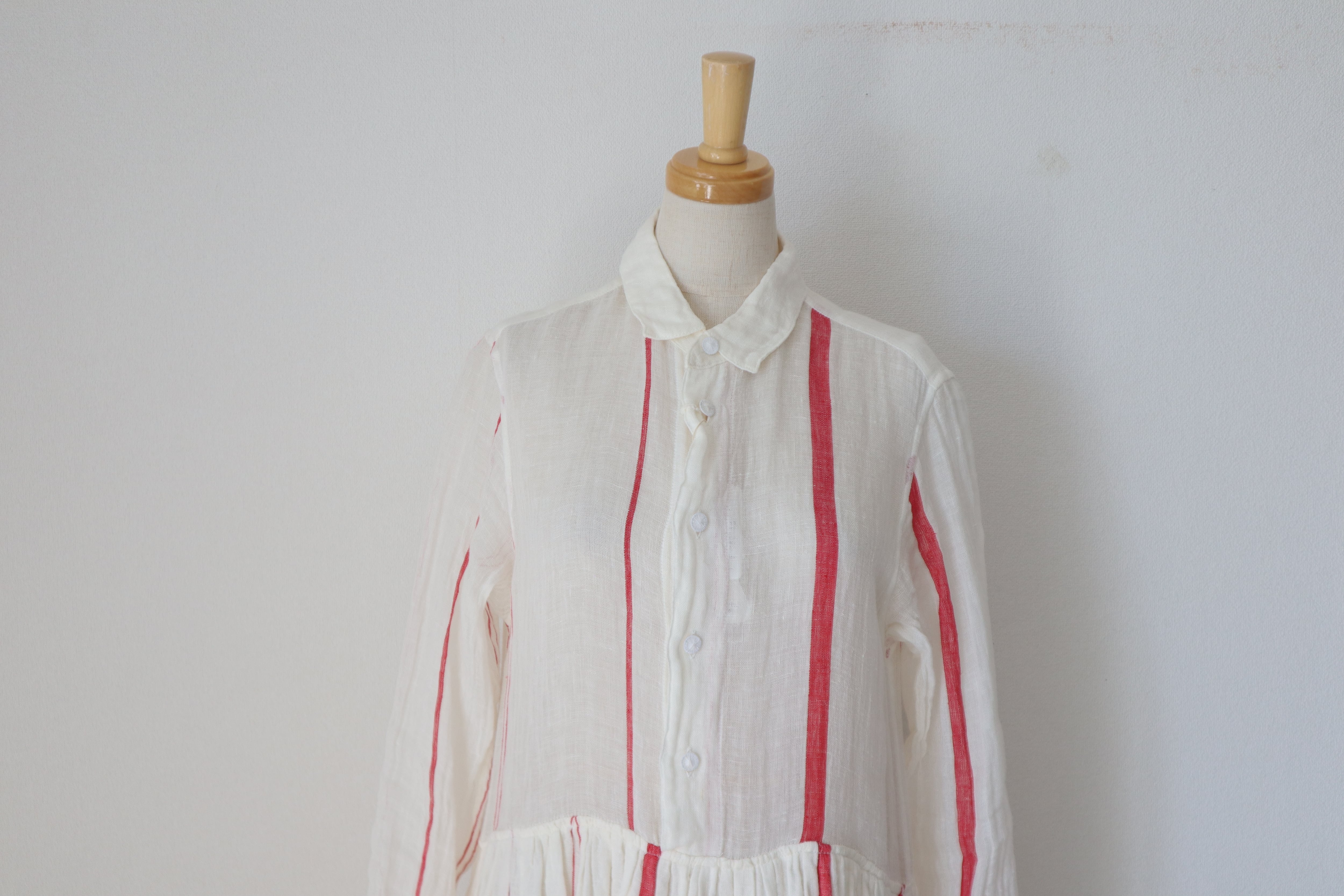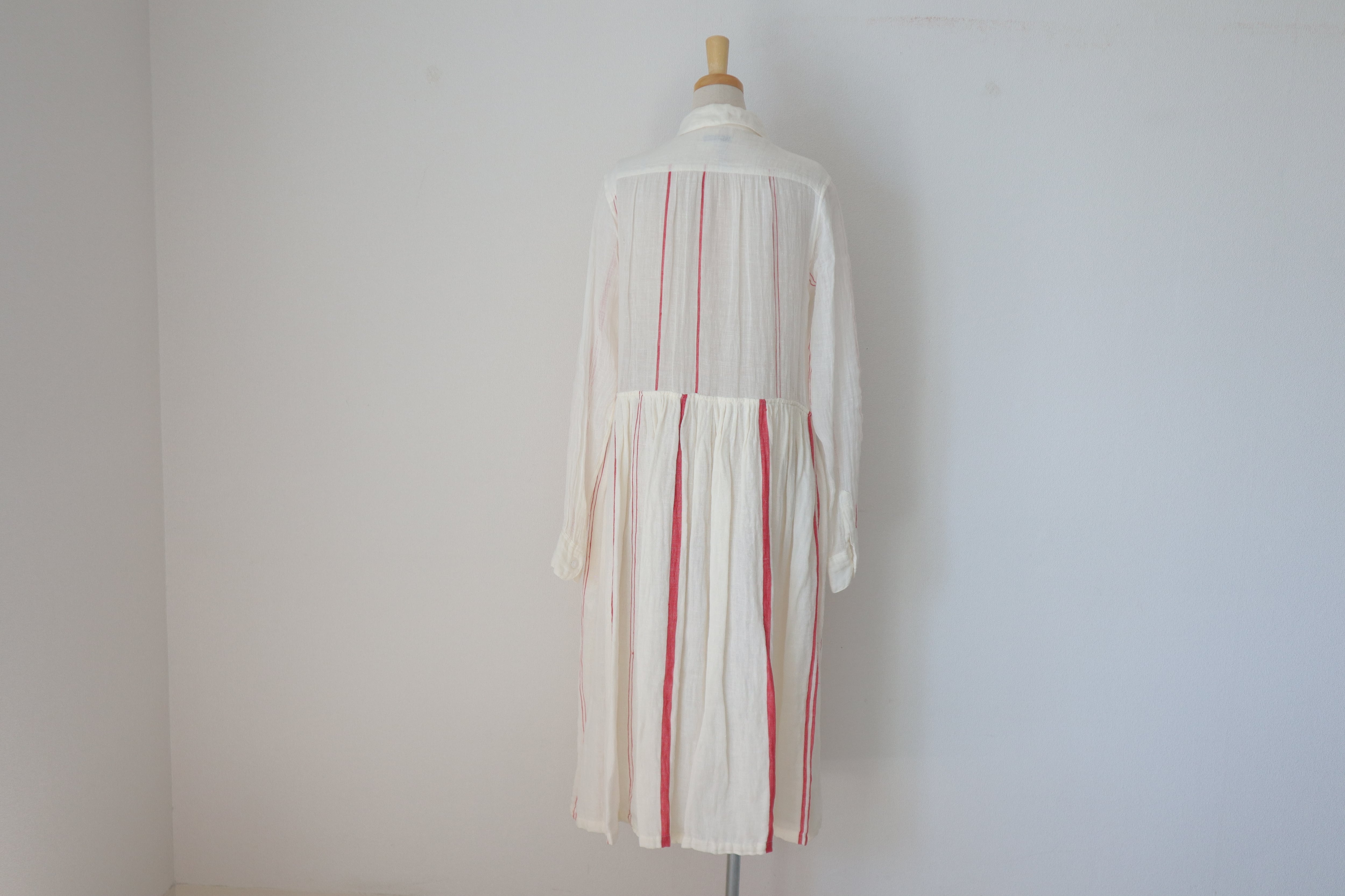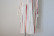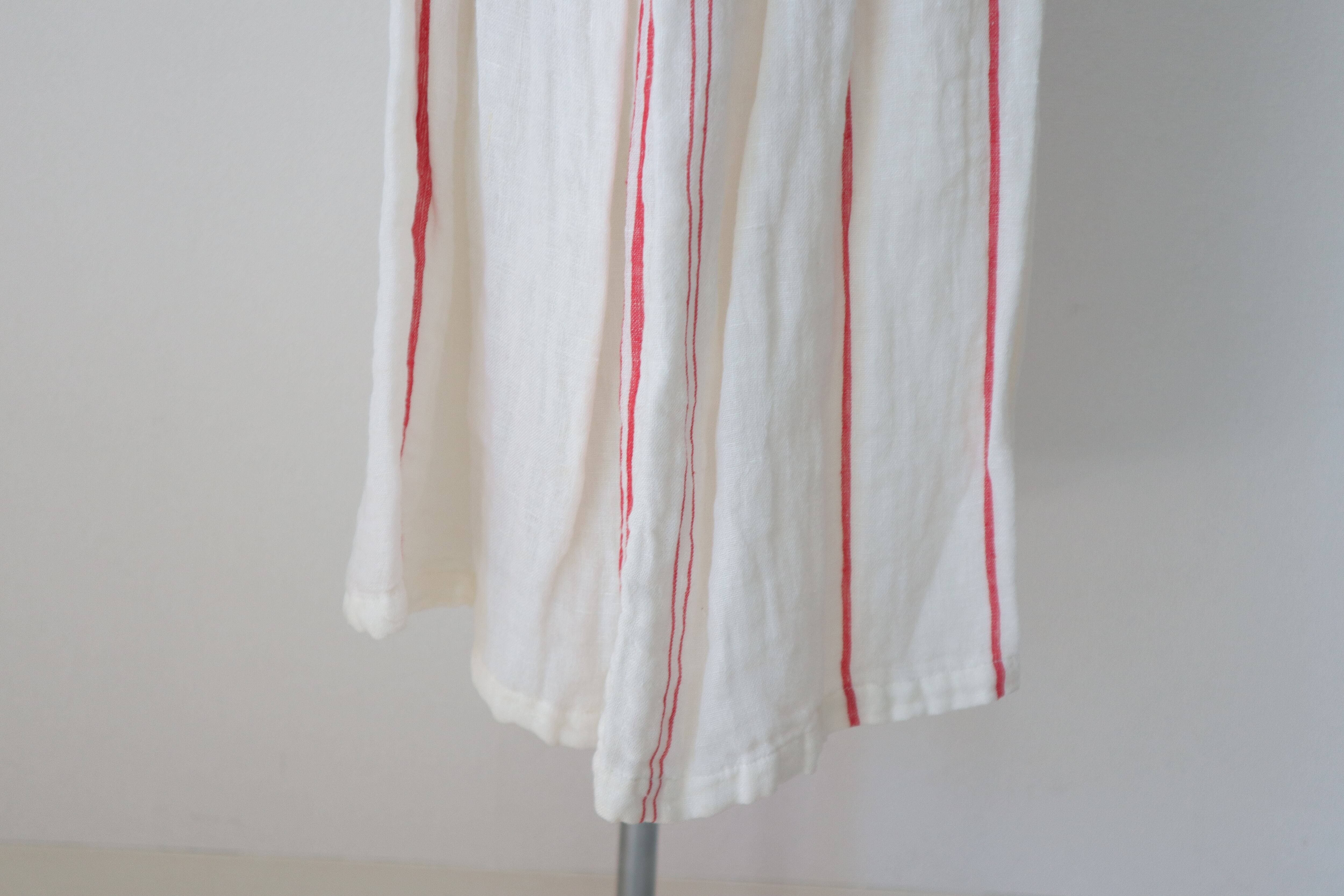 アンティークホワイトに赤のストライプがポイント。膝丈のペチコートを履いて頂くと透け感も気にならず安心。デニムと合わせても素敵。