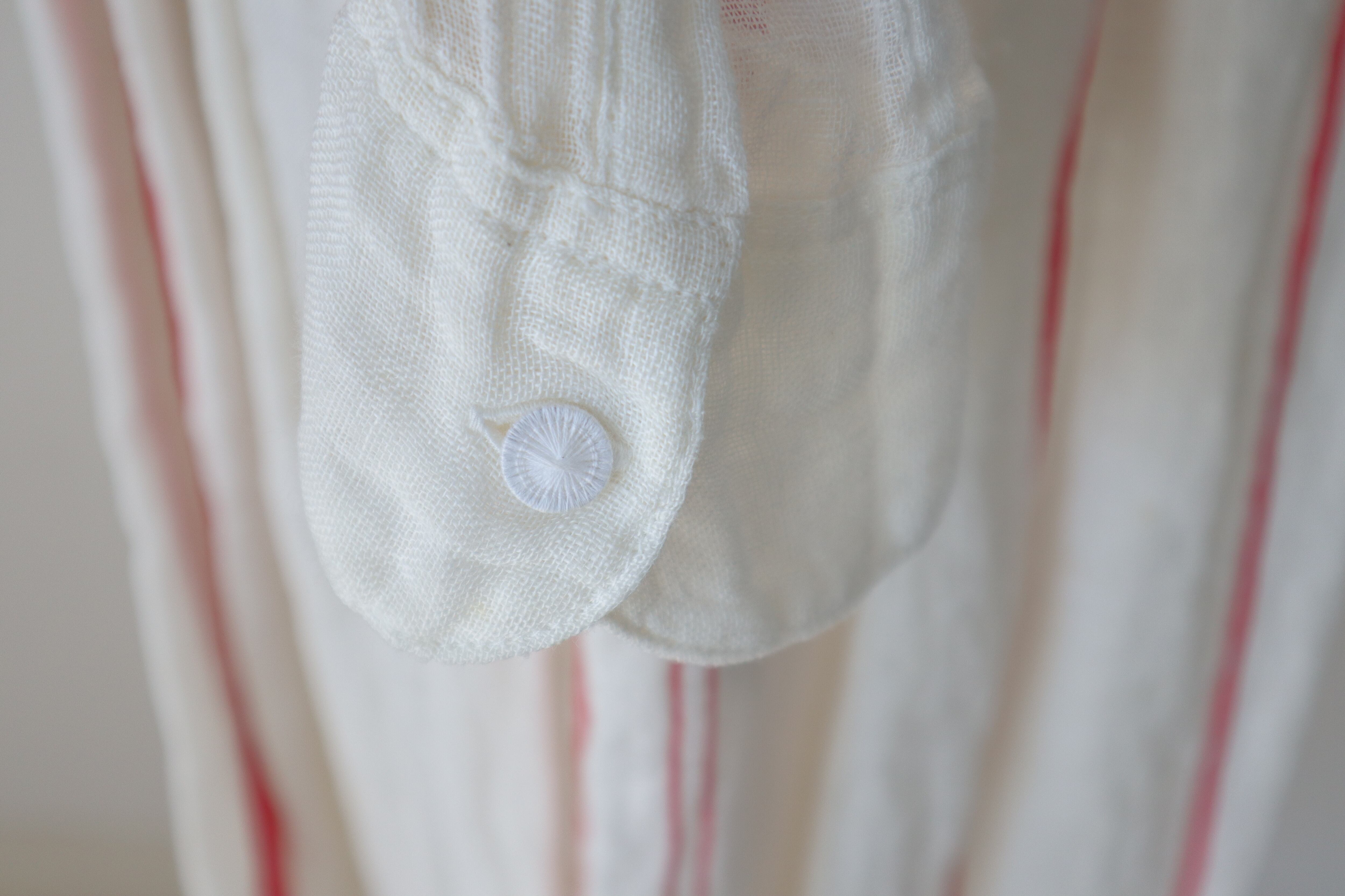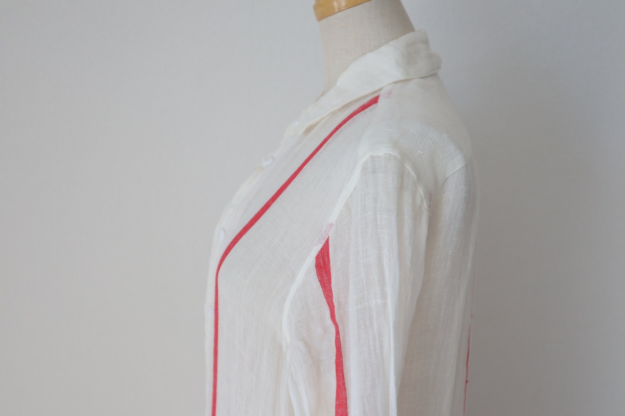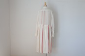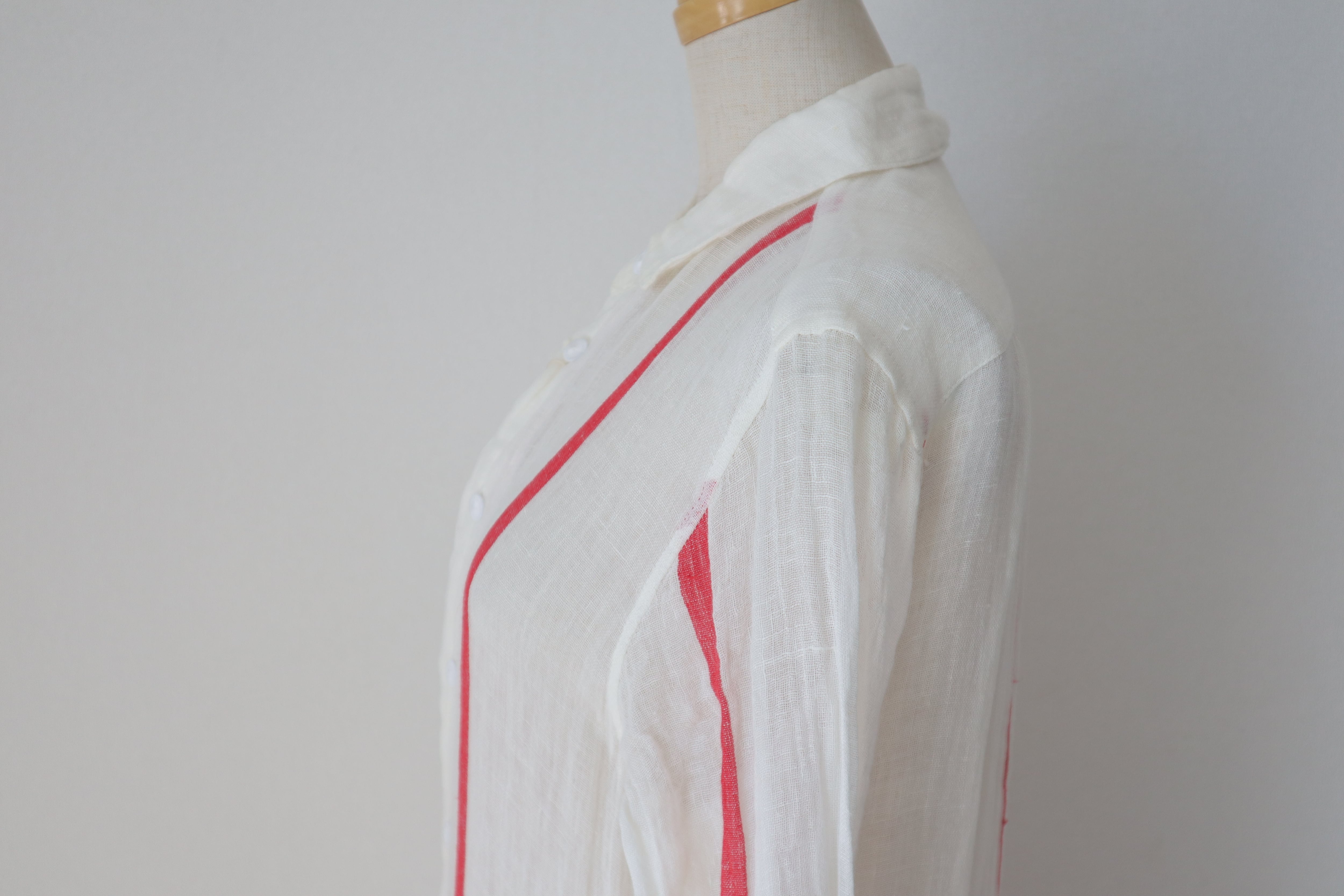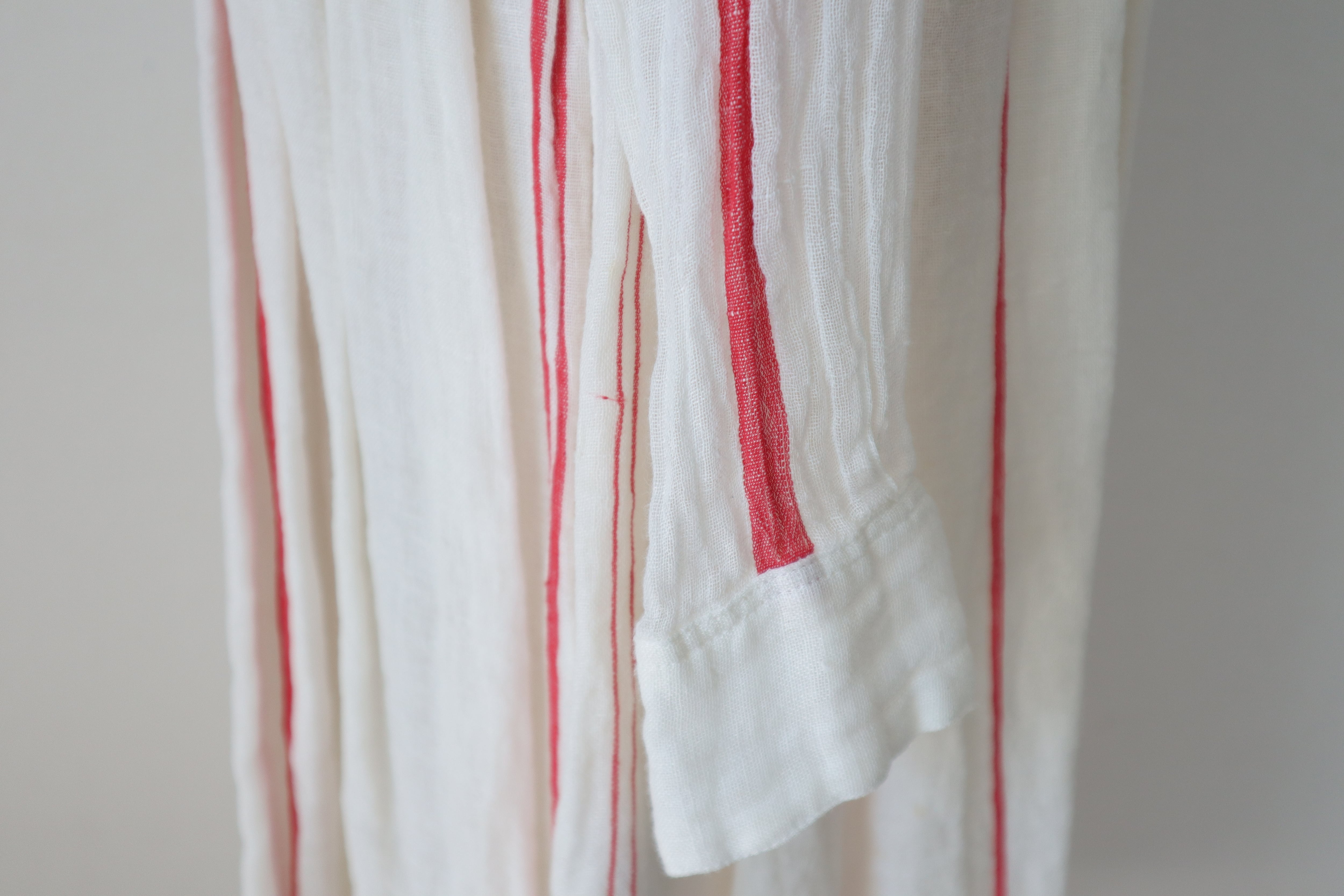 アンティークホワイトに赤のストライプがポイント。膝丈のペチコートを履いて頂くと透け感も気にならず安心。デニムと合わせても素敵。