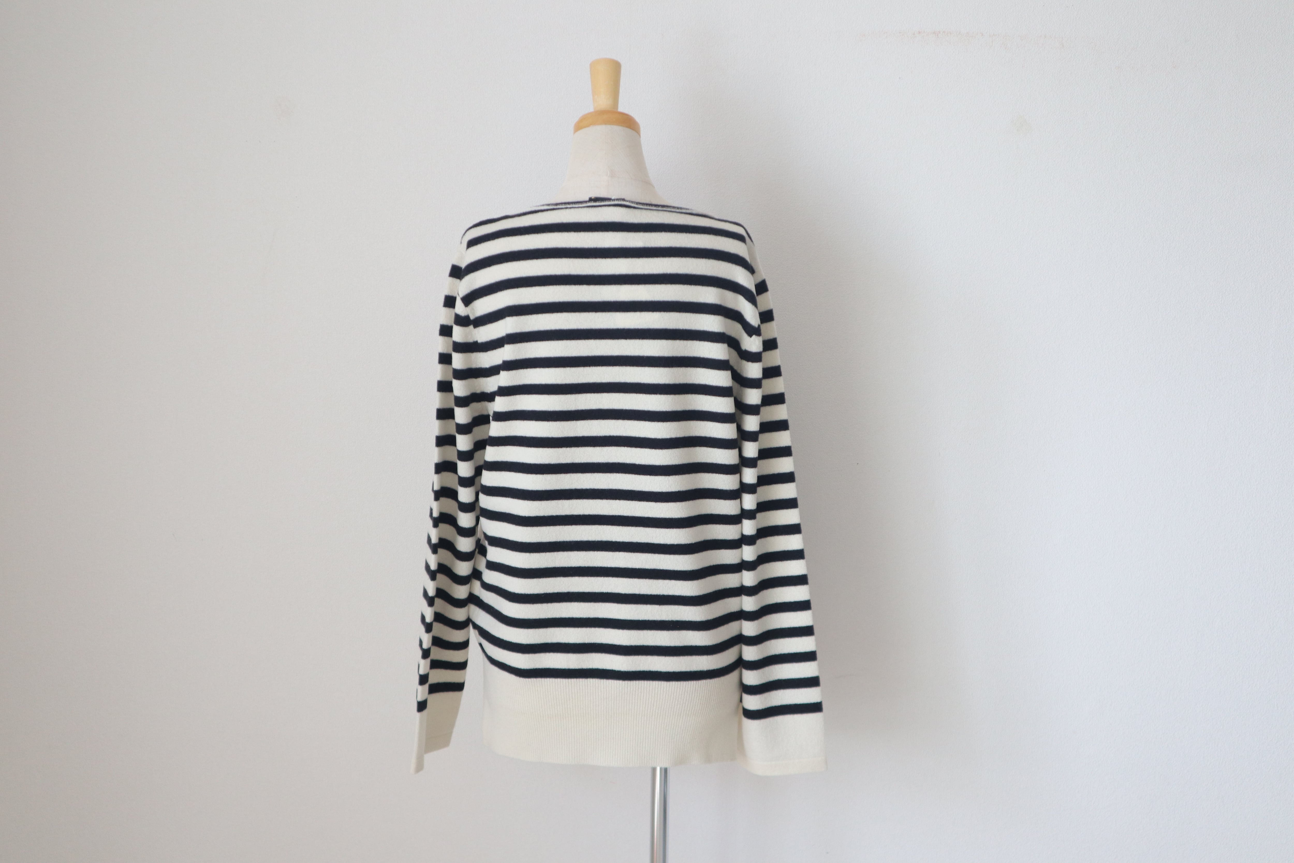ウール100%の滑らかな肌触りが魅力の薄手のボートネックセーターです。