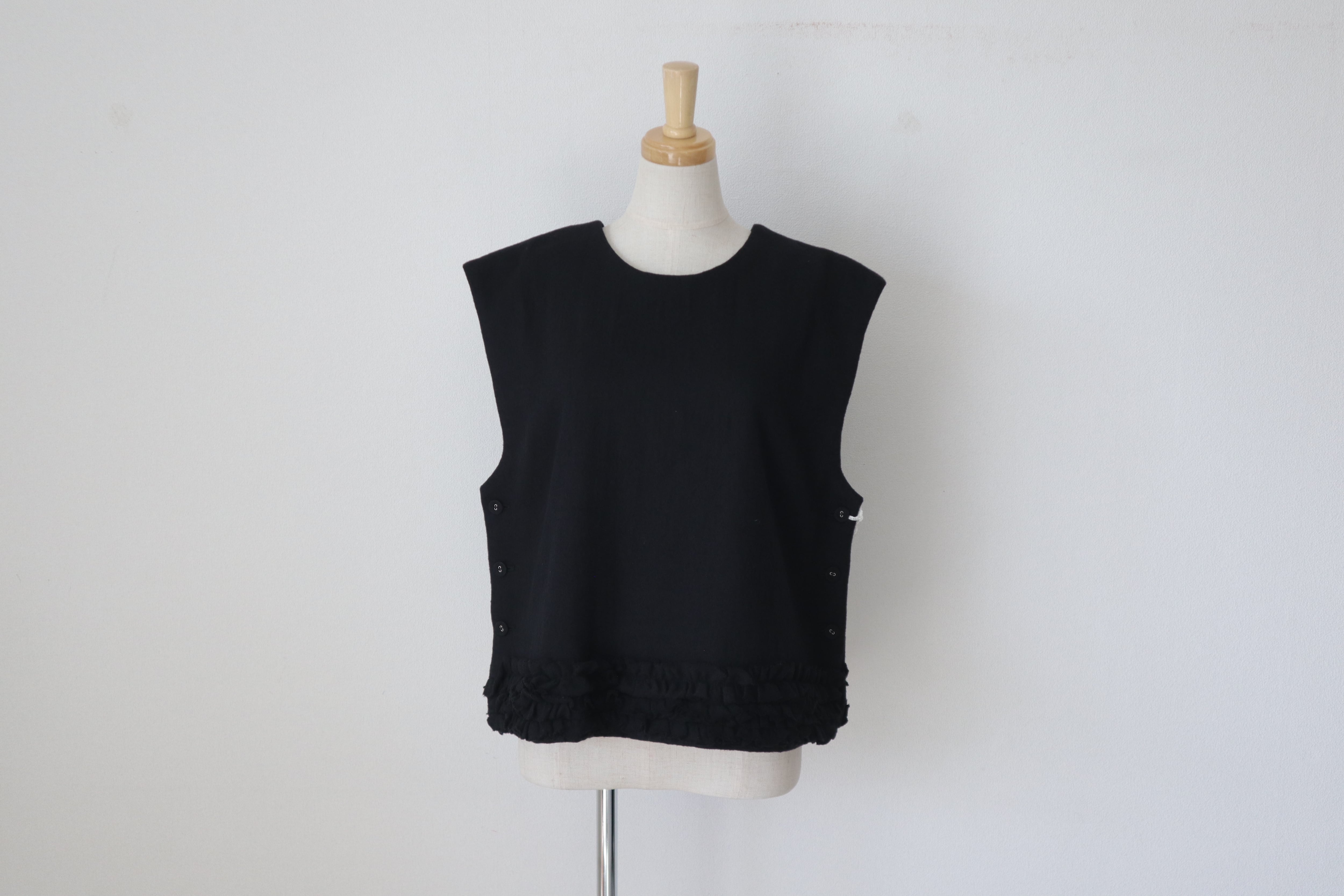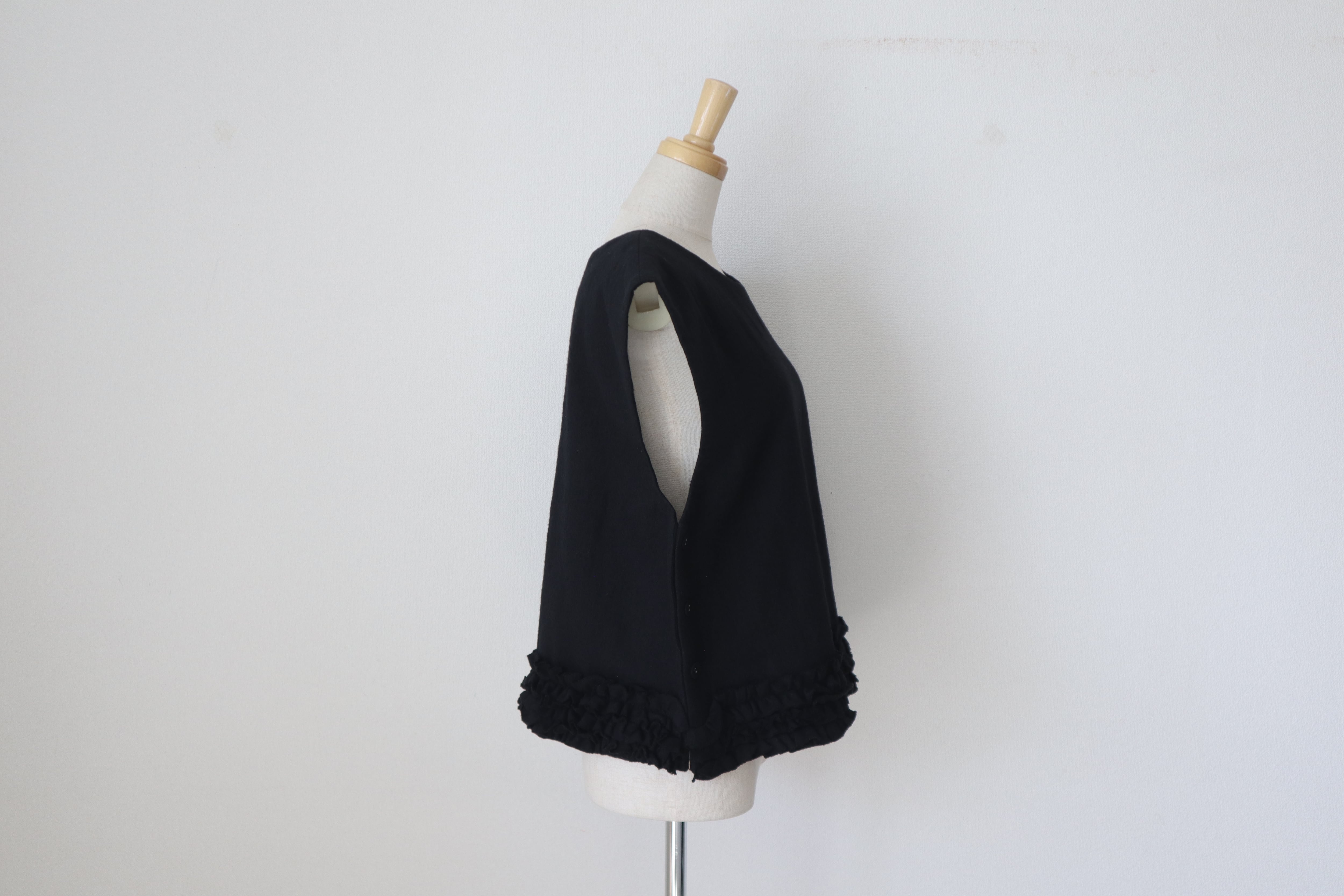 コットンウール混紡で裾がフリル、サイドにはボタンが付いています。カットソーやセーターに合わせても良いですよ。