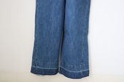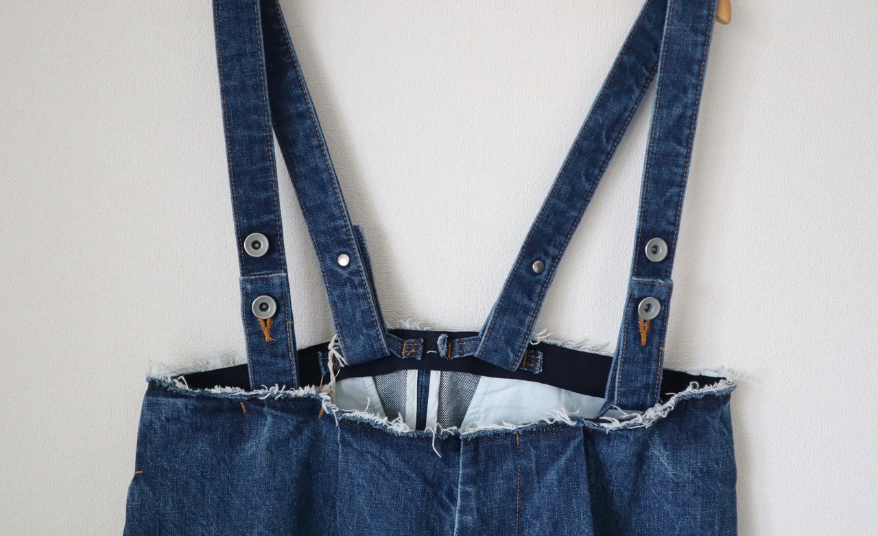 裾とウエストが切りっぱなしのデザインが特徴のデニムのサスペンダーパンツです。