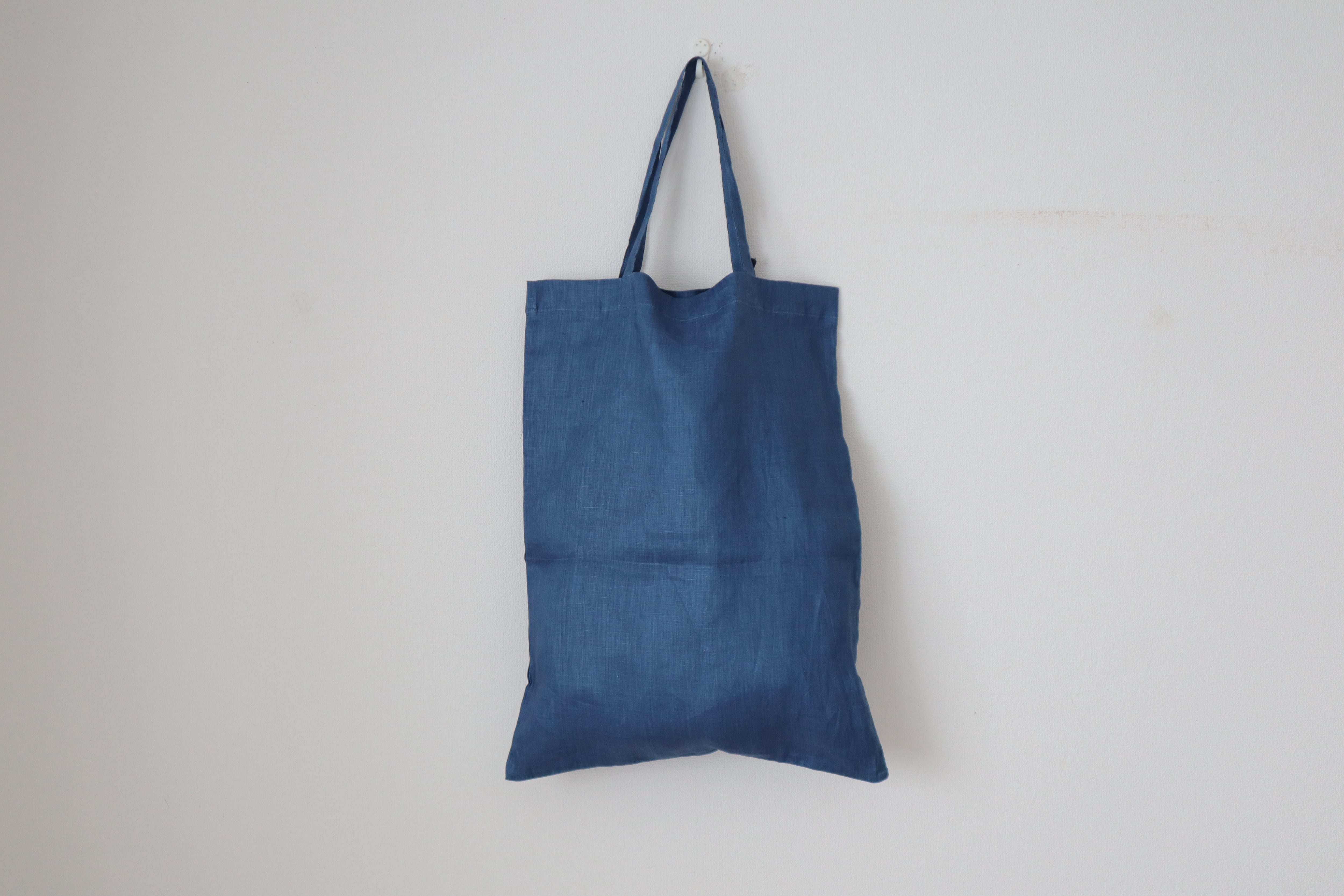 鮮やかなブルーが印象的なリネン素材のトートバッグです。