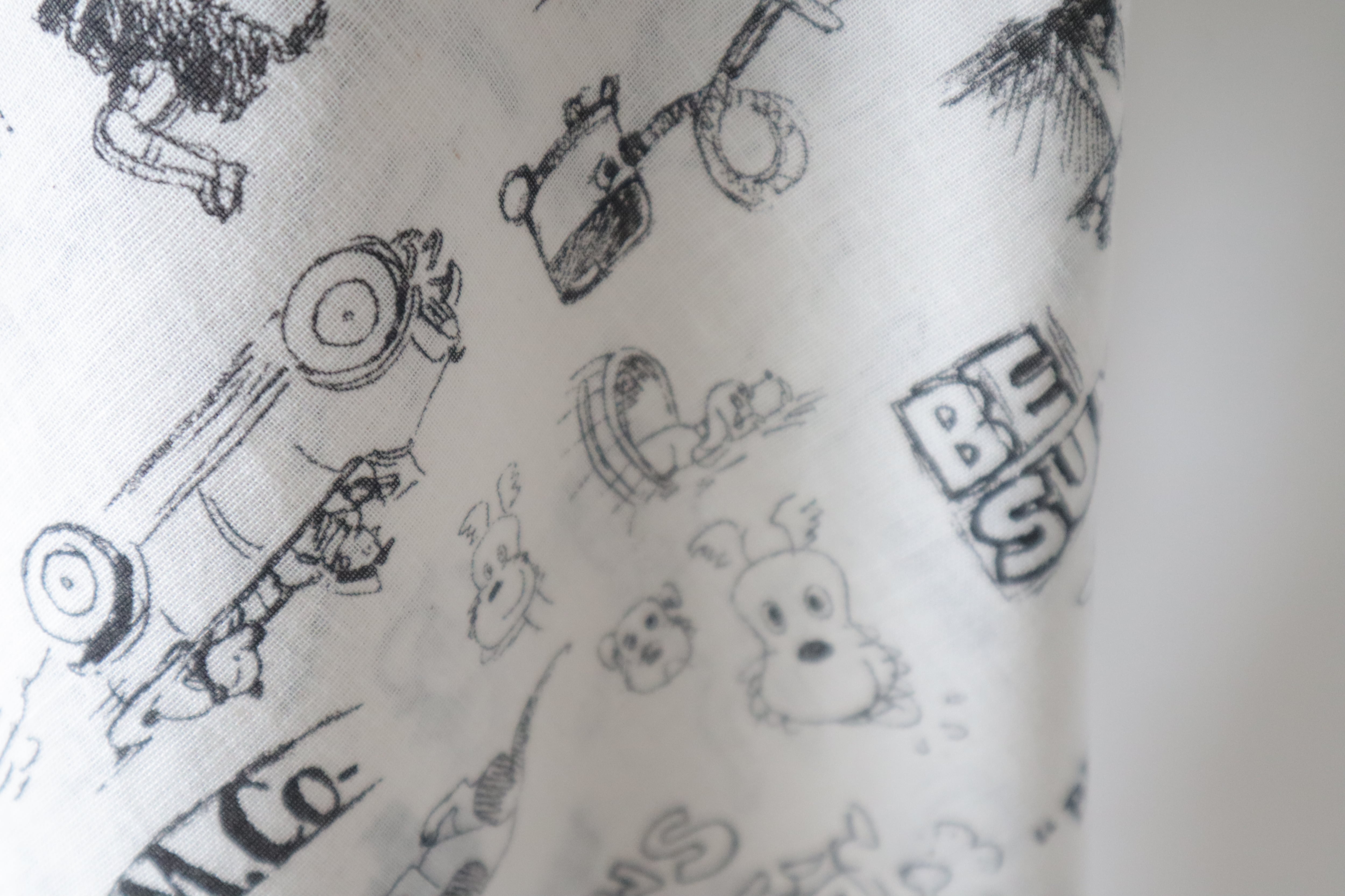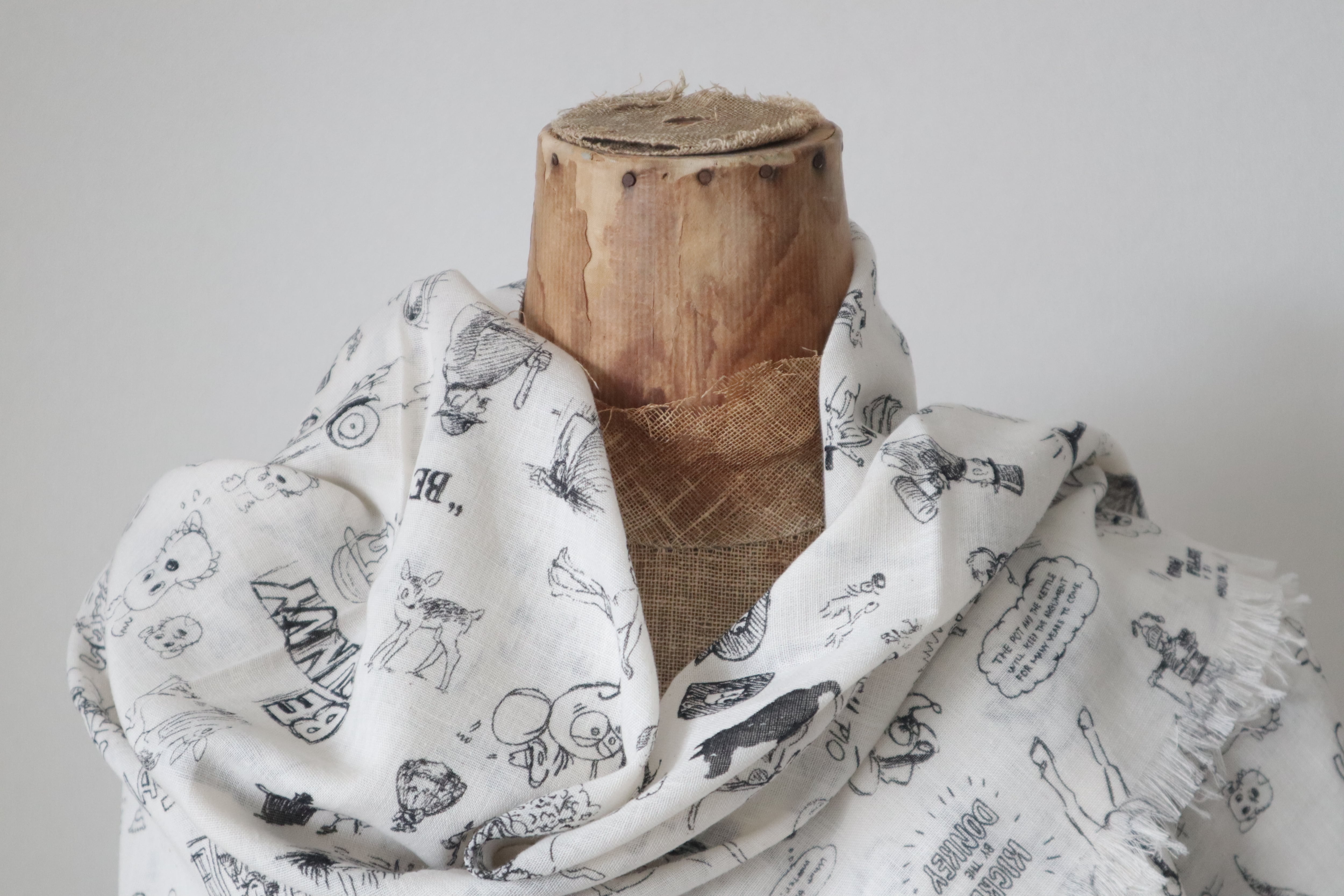 サニージムやロバや犬が楽しそうにラフに描かれたコットンガーゼ素材のGRAFFITI GAUZE SHAWLです。軽やかで柔らかな肌触りで、季節を問わず活躍します。