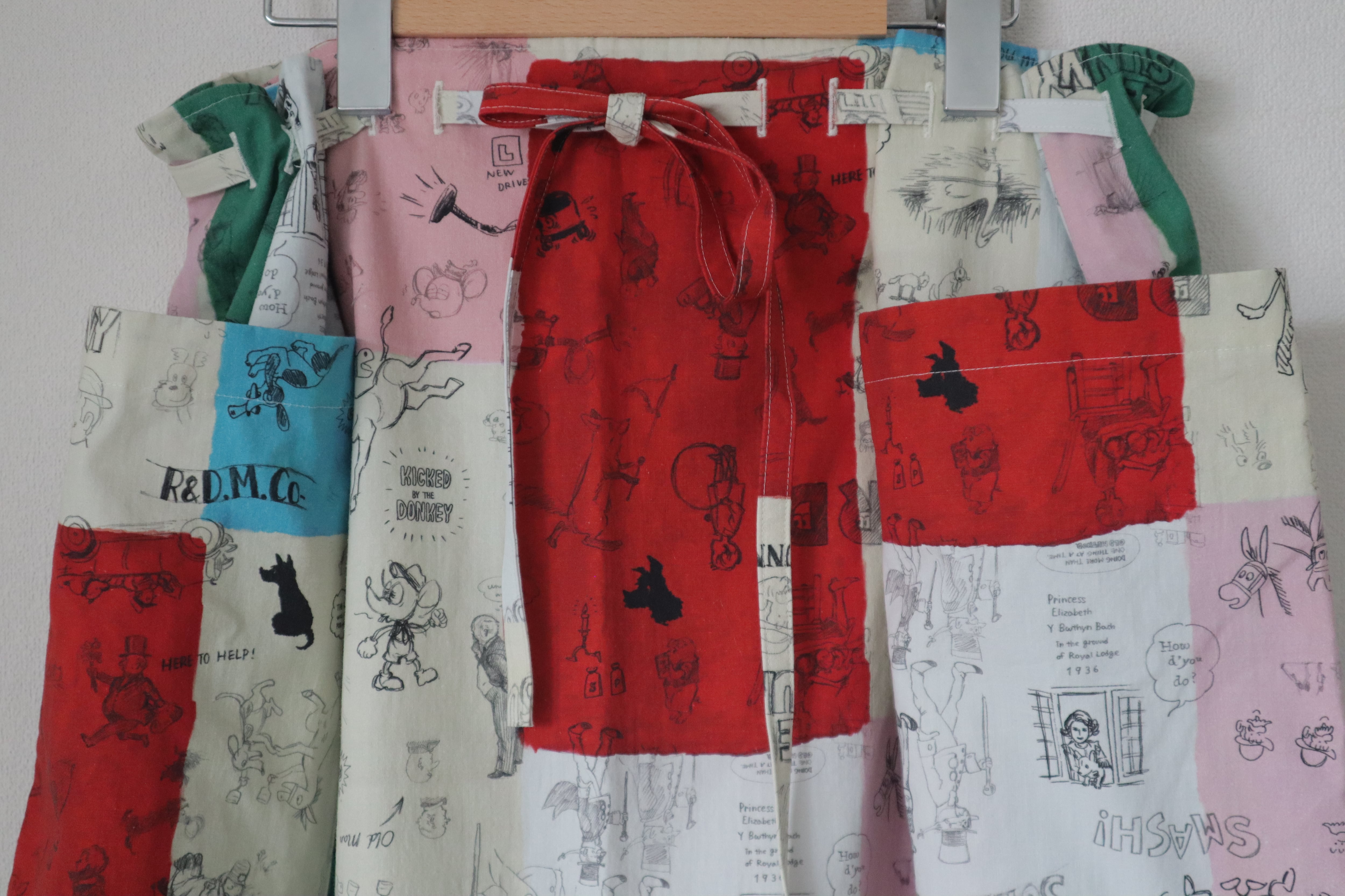 ラフなスケッチ風に描かれたユニークなイラストが印象的なMOSAIC GRAFITI STRING SKIRTです。パッチワークのようなプリントでシンプルなトップスと合わせてるとより引き立ちます。