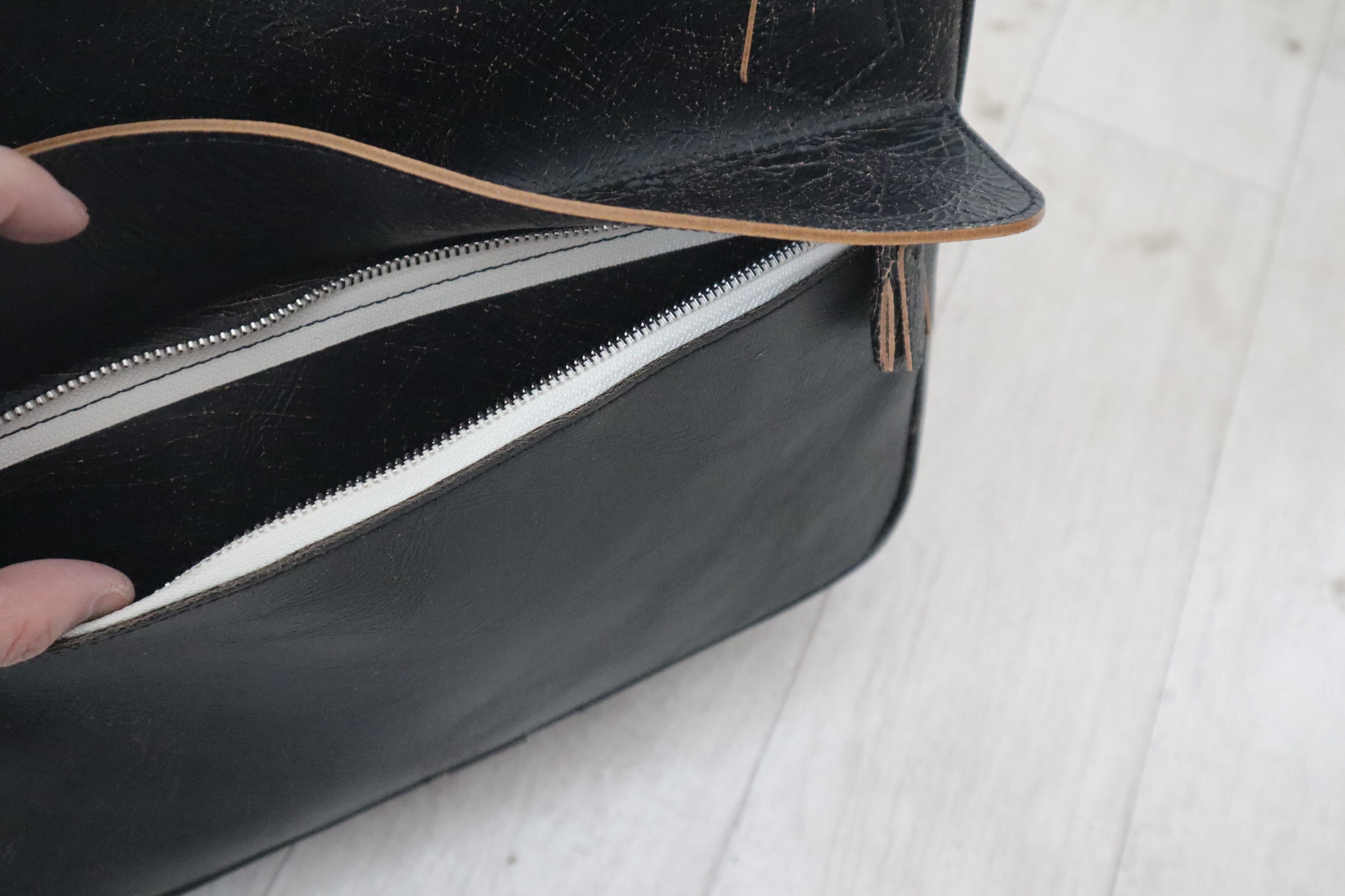 クラッキング加工された牛革を使用し、使い込むほどに味わいが増す美しいデザインが魅力です。また、後ろ部分には便利なファスナー付きの収納スペースがあり機能性も抜群です。