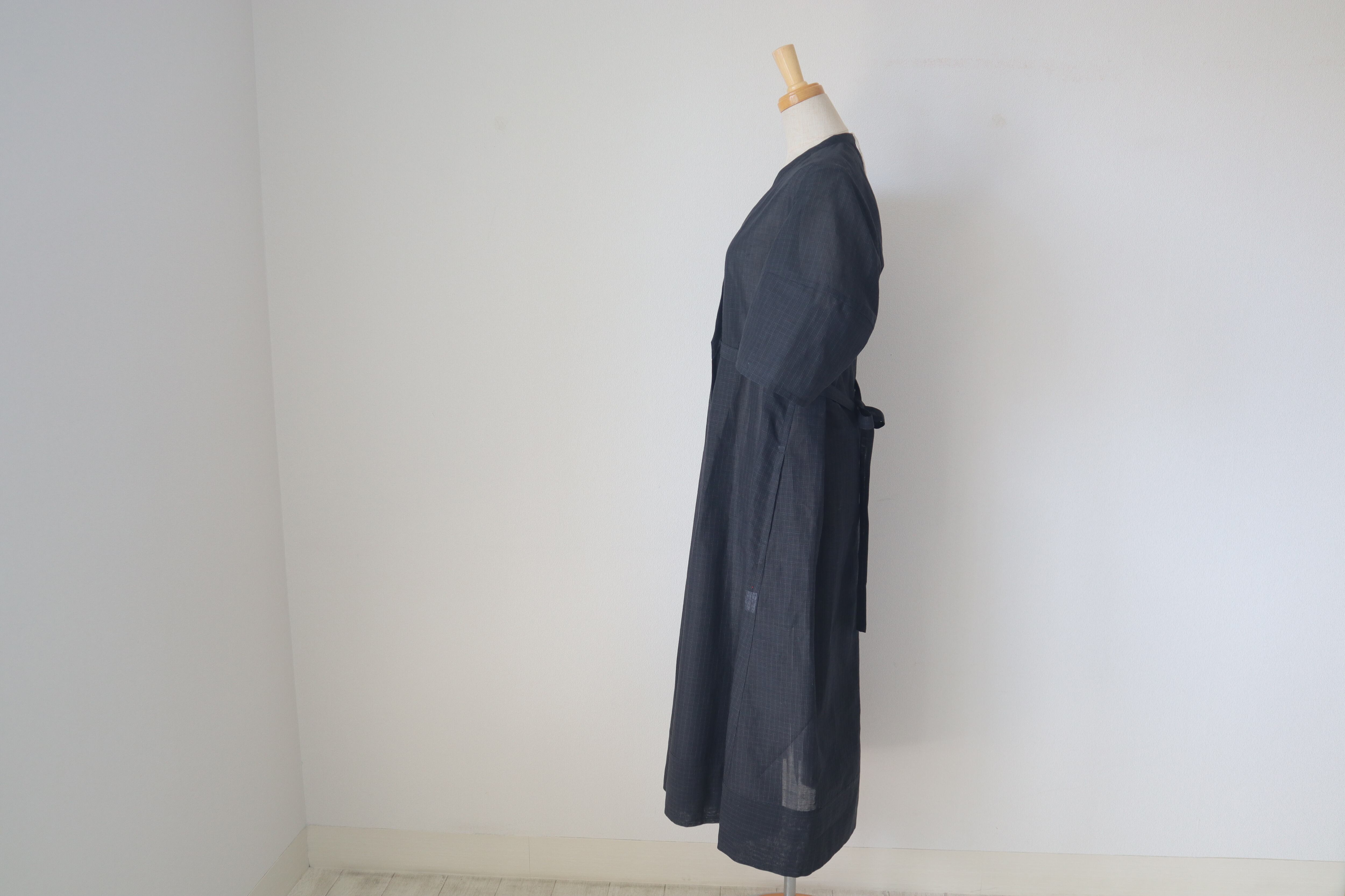 シックな色合いネイビー、グレーの小さなチェック柄に。パンツスタイルにコート風に羽織ったり、