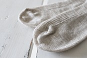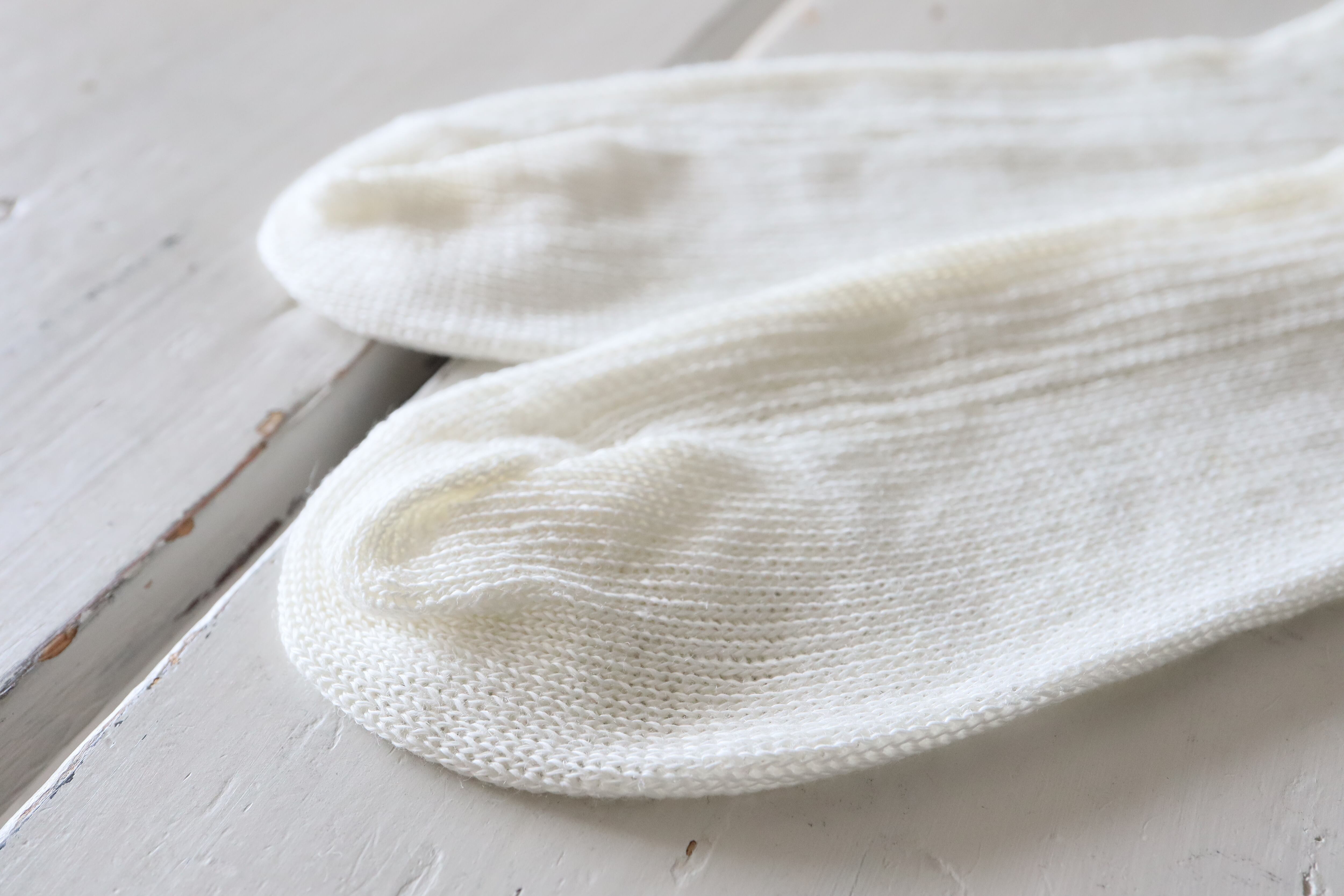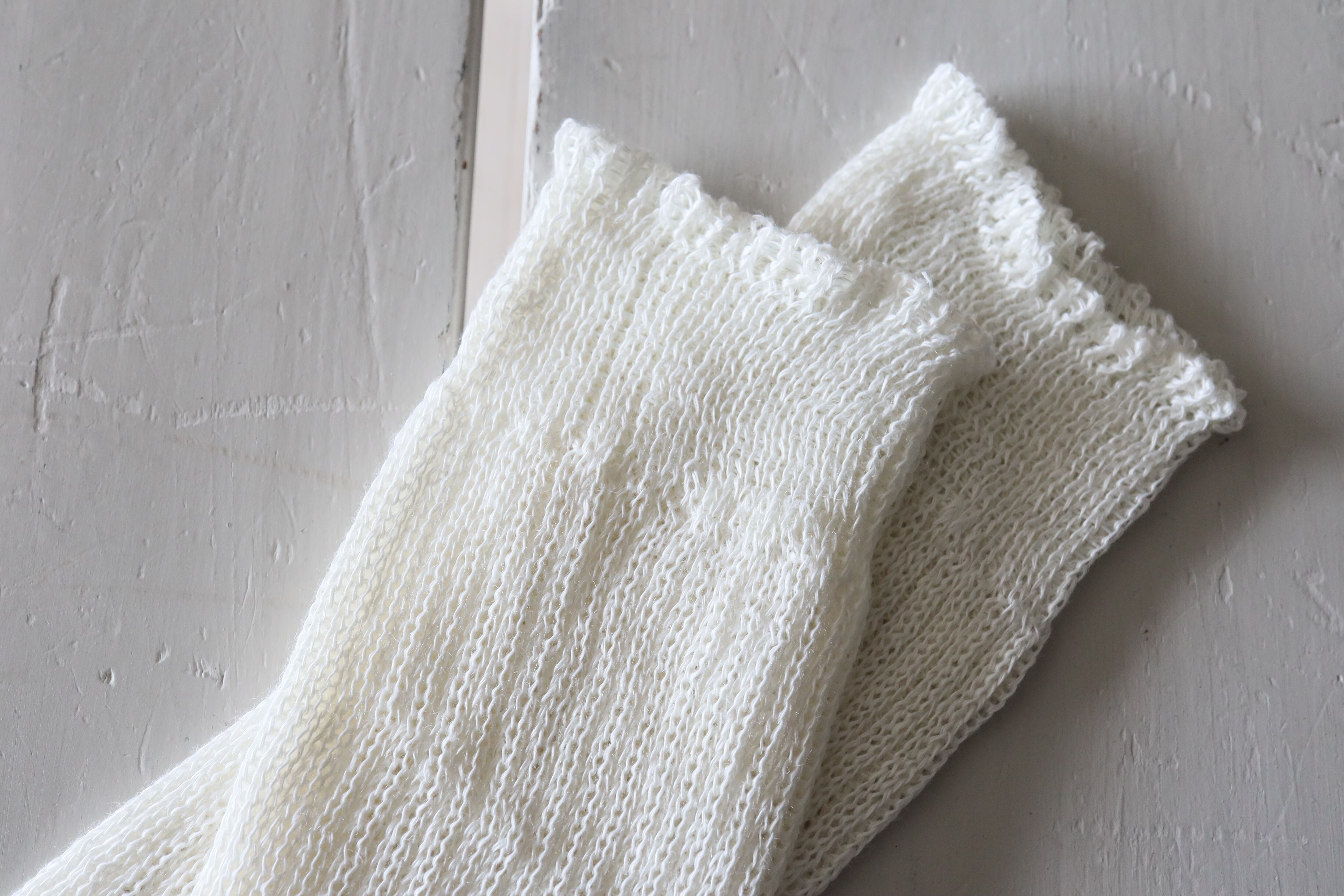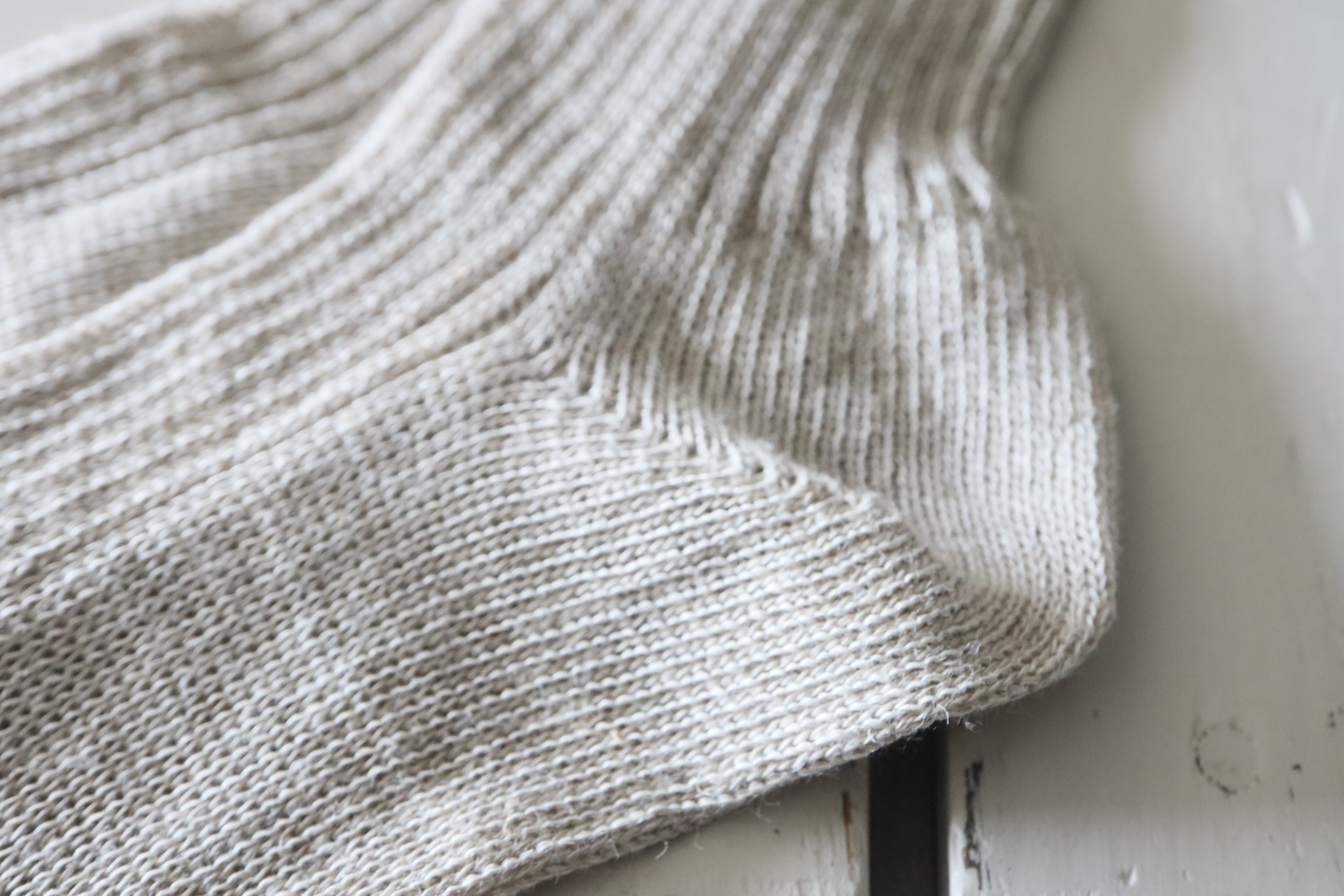 リネン100%で肌触りがよく、吸湿性も抜群。リブ編みで足首の締め付け感のない穿き心地が魅力的、
