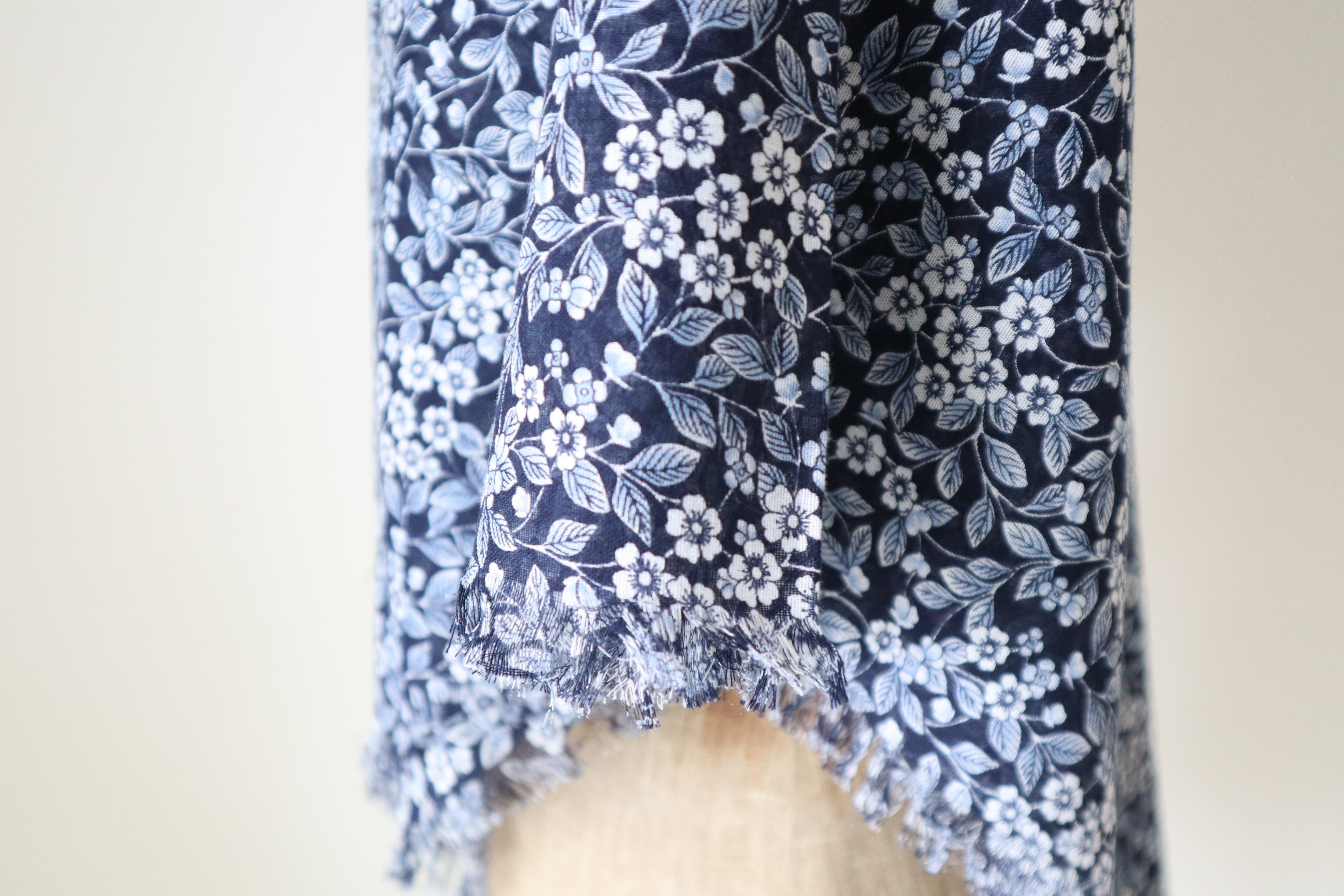 「アイリッシュ」と名付けらた紺の濃淡だけで表現されたプリント柄です。生地一面に草花が広がり凛とした雰囲気と甘くない花柄が絶妙。ふんわりとしたコットンガーゼは肌ざわりもやわらかく季節の変わり目にも活躍するアイテム。