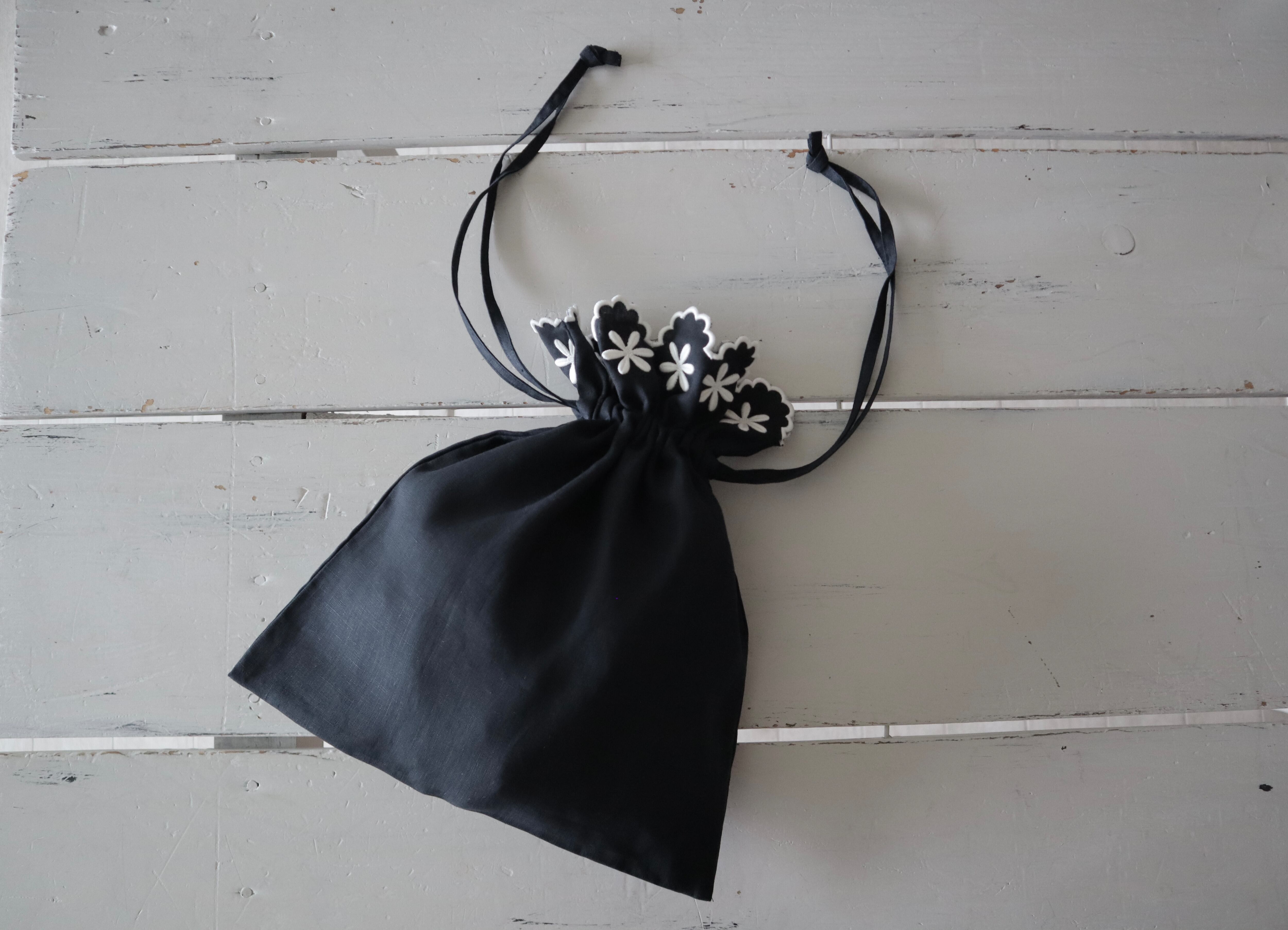 可愛らしいフラワーモチーフとスカラップエッジが特徴のドローストリングバッグです。コンパクトながらも十分な収納力を持ち、さまざまなシーンで活躍します。また、引き締めることでバッグ内の荷物をしっかり保護し、安心してお使いいただけます。