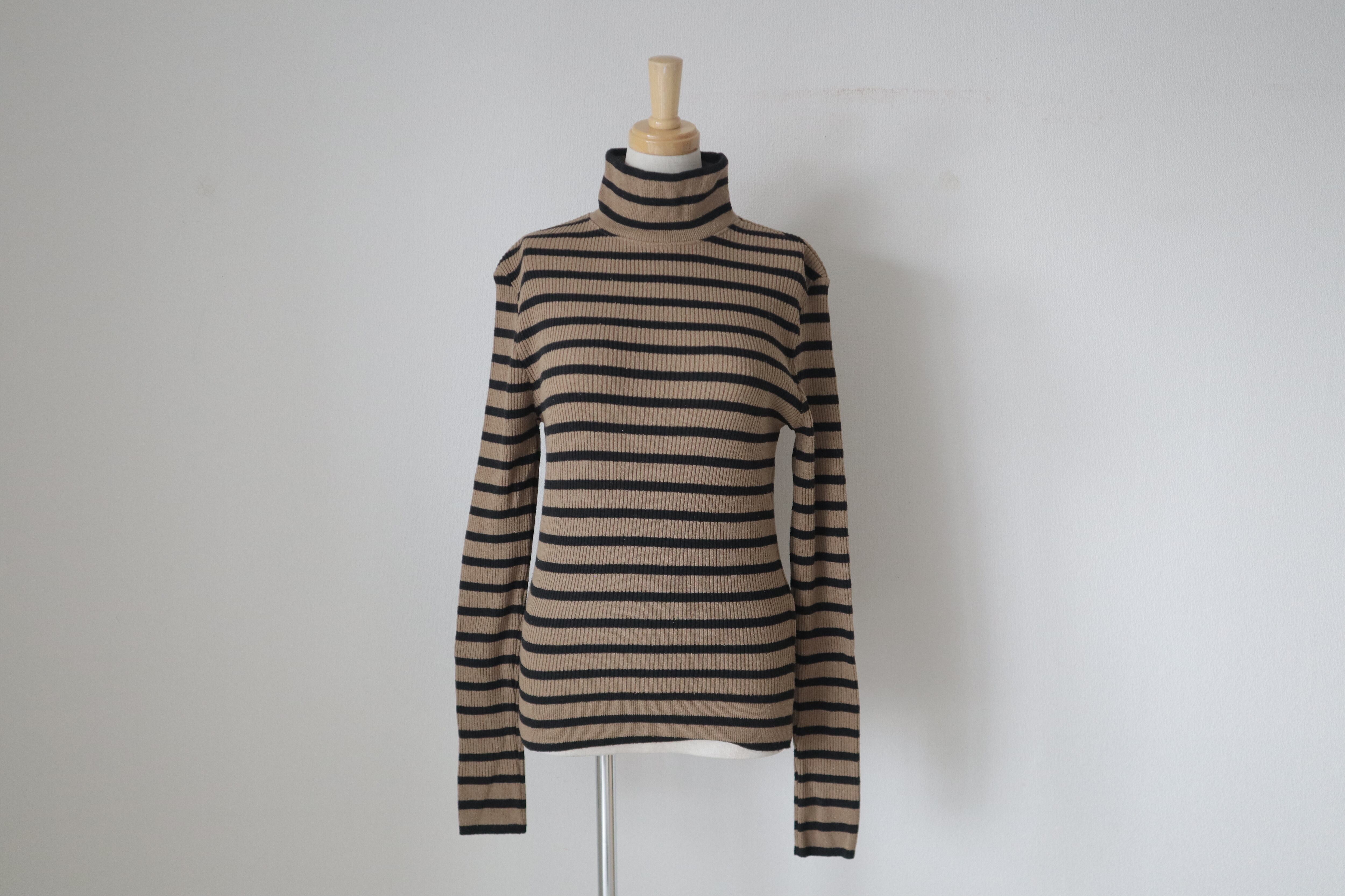 上質な素材が融合した一枚です。リブニット素材が体のラインに沿ってフィットし、シルエットを美しく引き立てます。シックなハイネックデザインと、ボーダーパターンがおしゃれな印象を与えます。