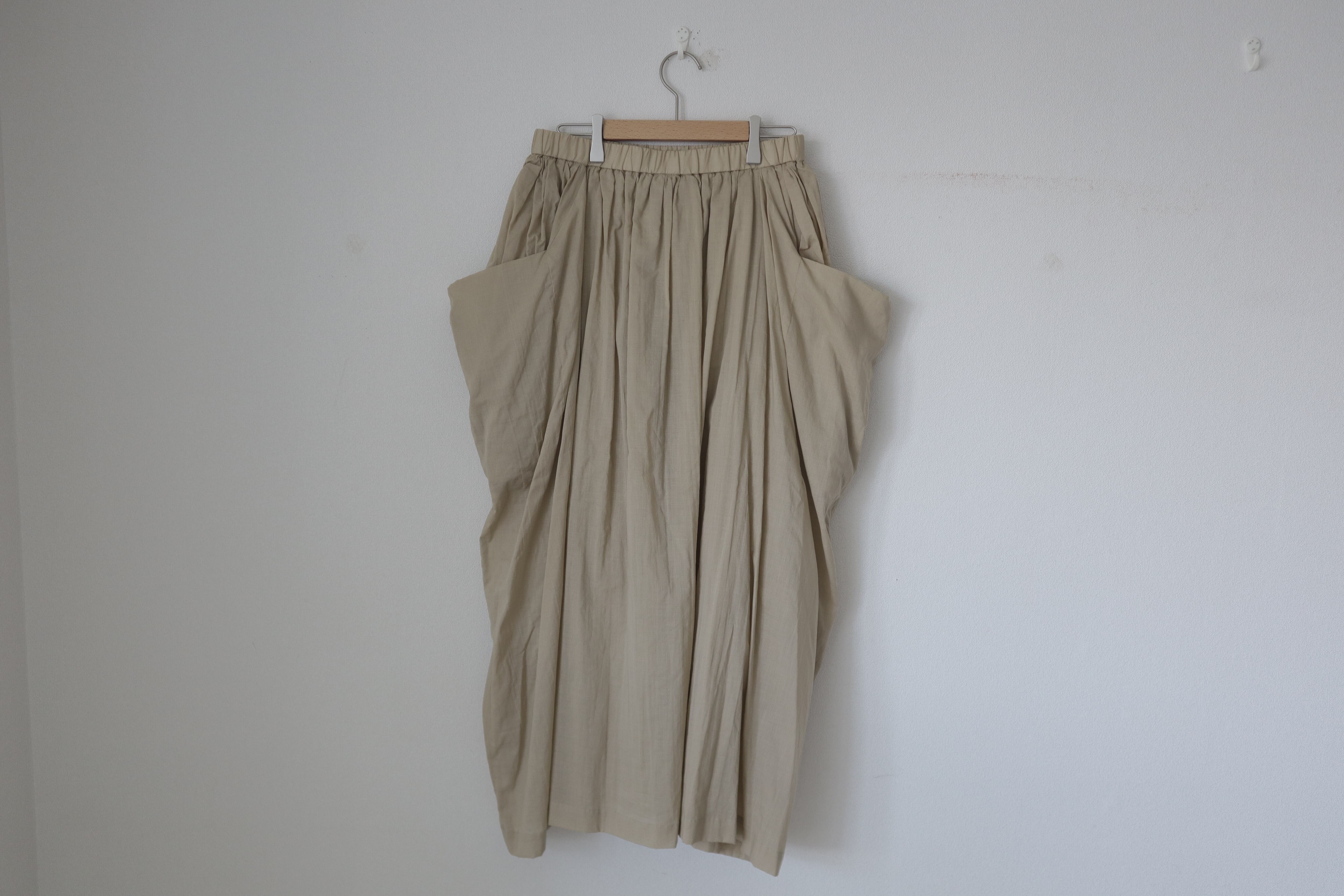 ポケットがポイントのスカート、WRINKLES POCKET SKIRT。シンプルでありながら個性的なポケットデザインがおしゃれな一枚です。R&D.M.Co-こだわり、美しいライン、涼しげさも感じるロングスカートです。PEASANT SLEEVE BLOUSE とおそろいになりますのでセットアップで是非着てみてくださいね。