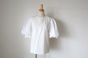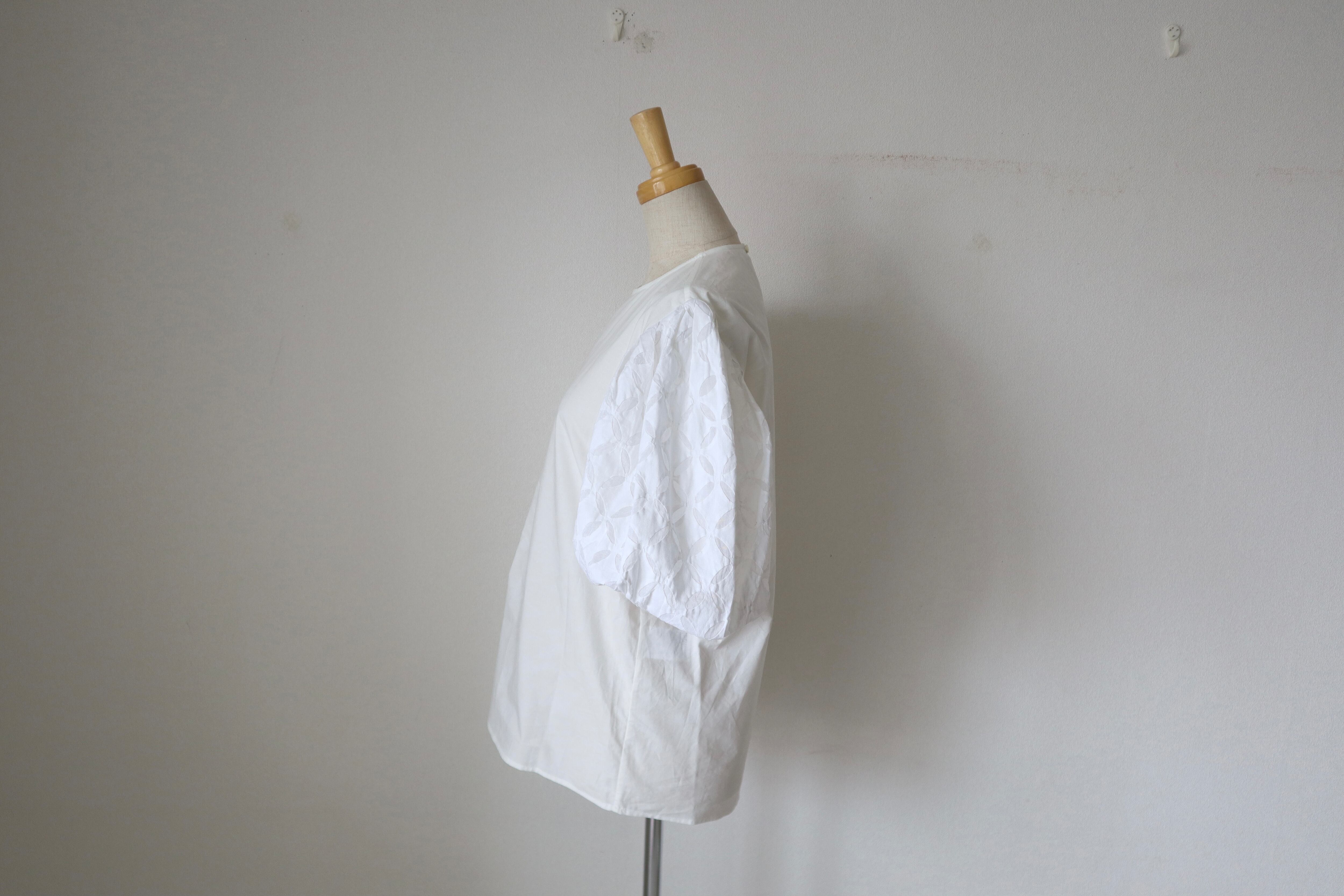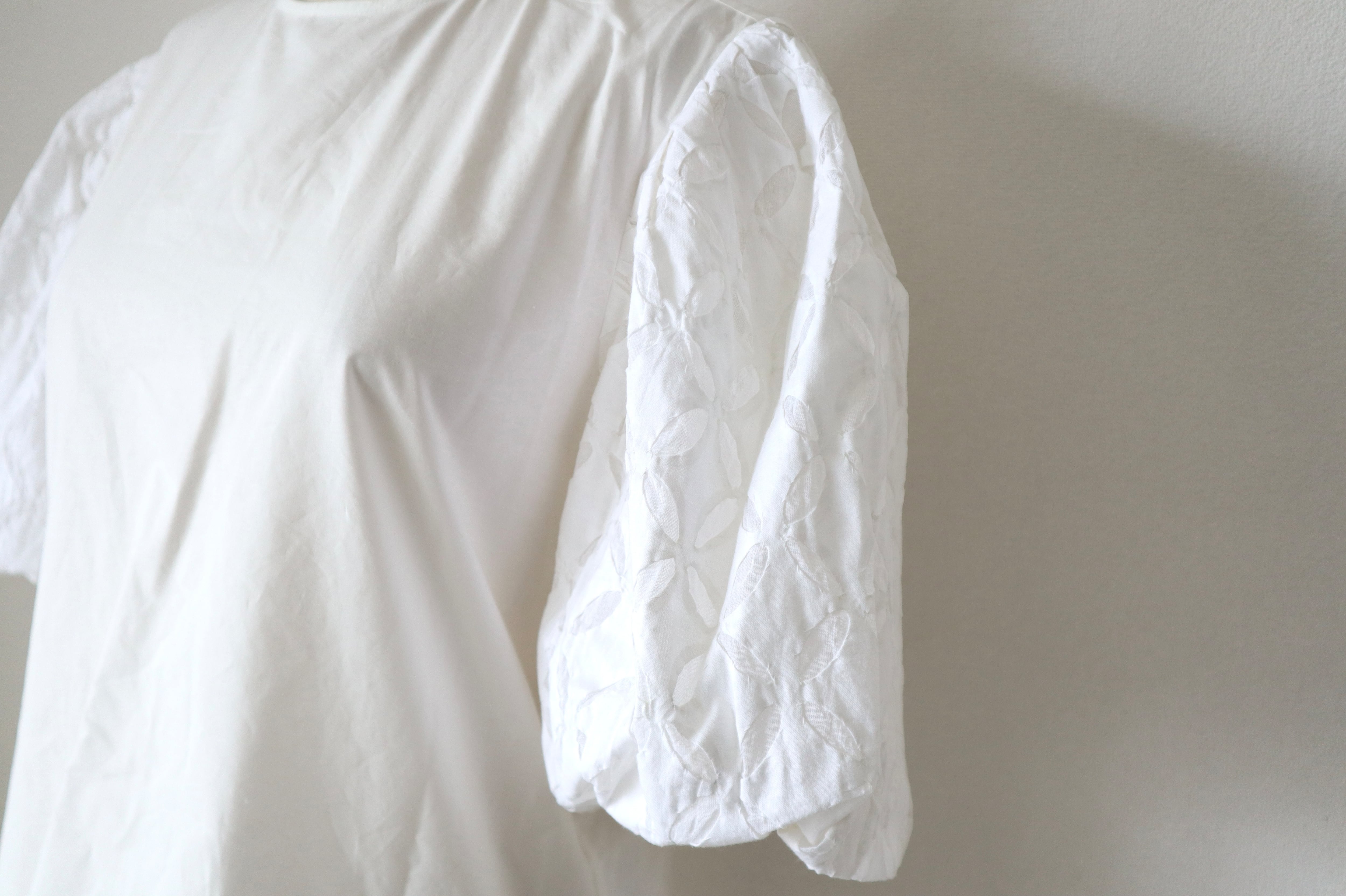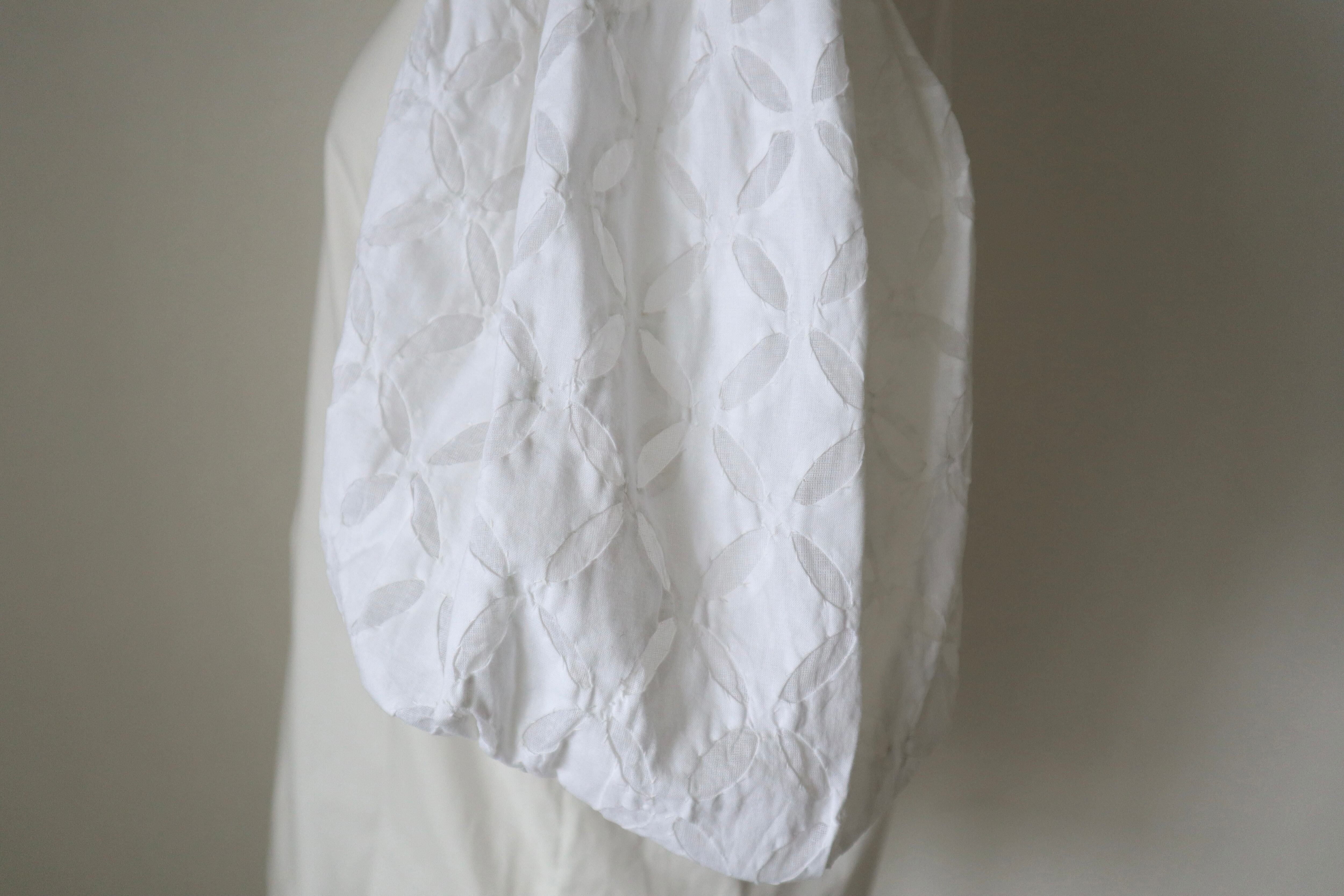CIRCLE FLOWER APPLIQUE BALOON SLEEVE BLOUSEは、袖のデザインが綺麗なブラウスです。上品なフラワーアップリケが施されており、華やかさを演出します。コットン素材で着心地も抜群で、1枚で主役になれるアイテムです。