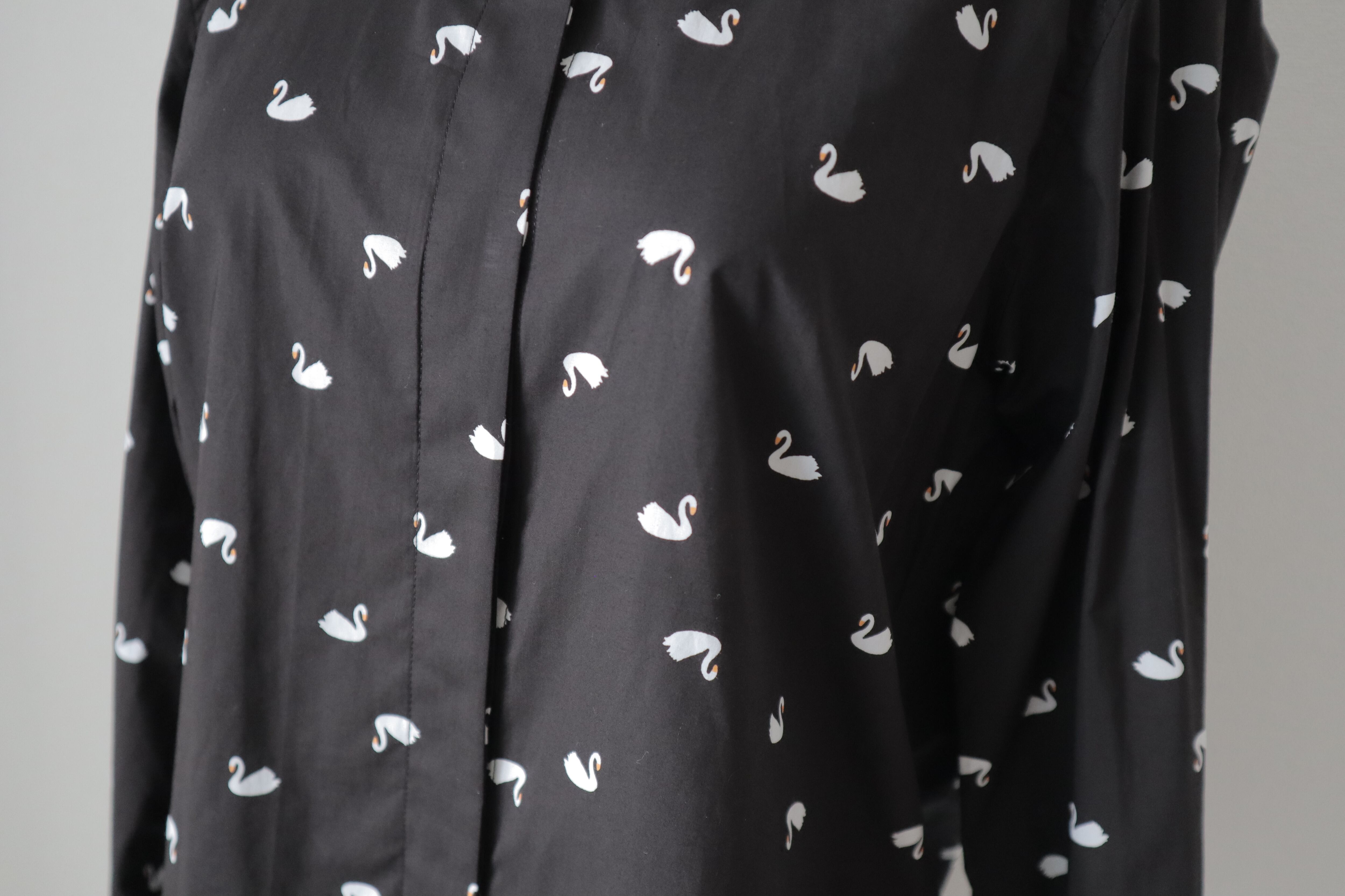 スワン柄のシャツでスタンドカラーデザインが首元をすっきりと見せ、上品な雰囲気を演出します。デイリーコーディネートにちょっとしたアクセントを添えることができる一枚です。