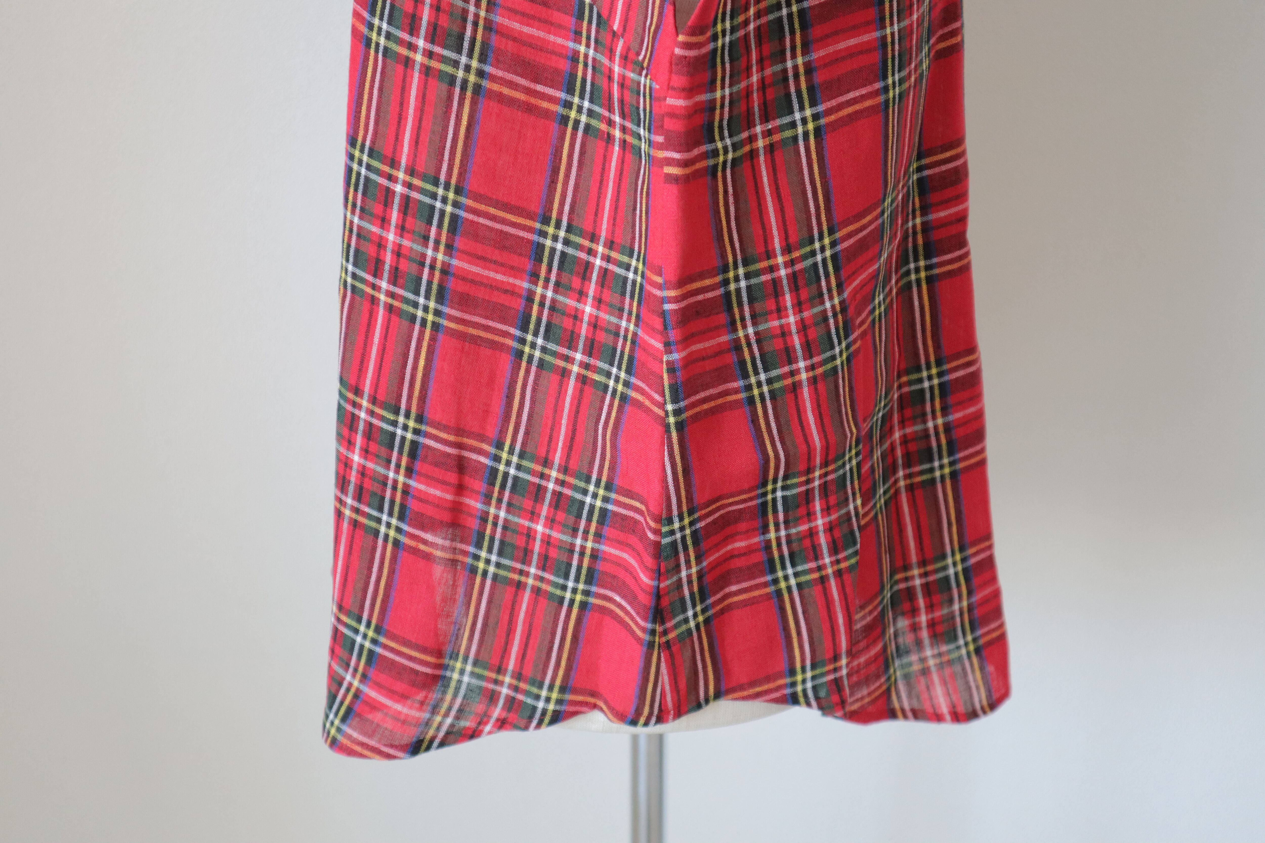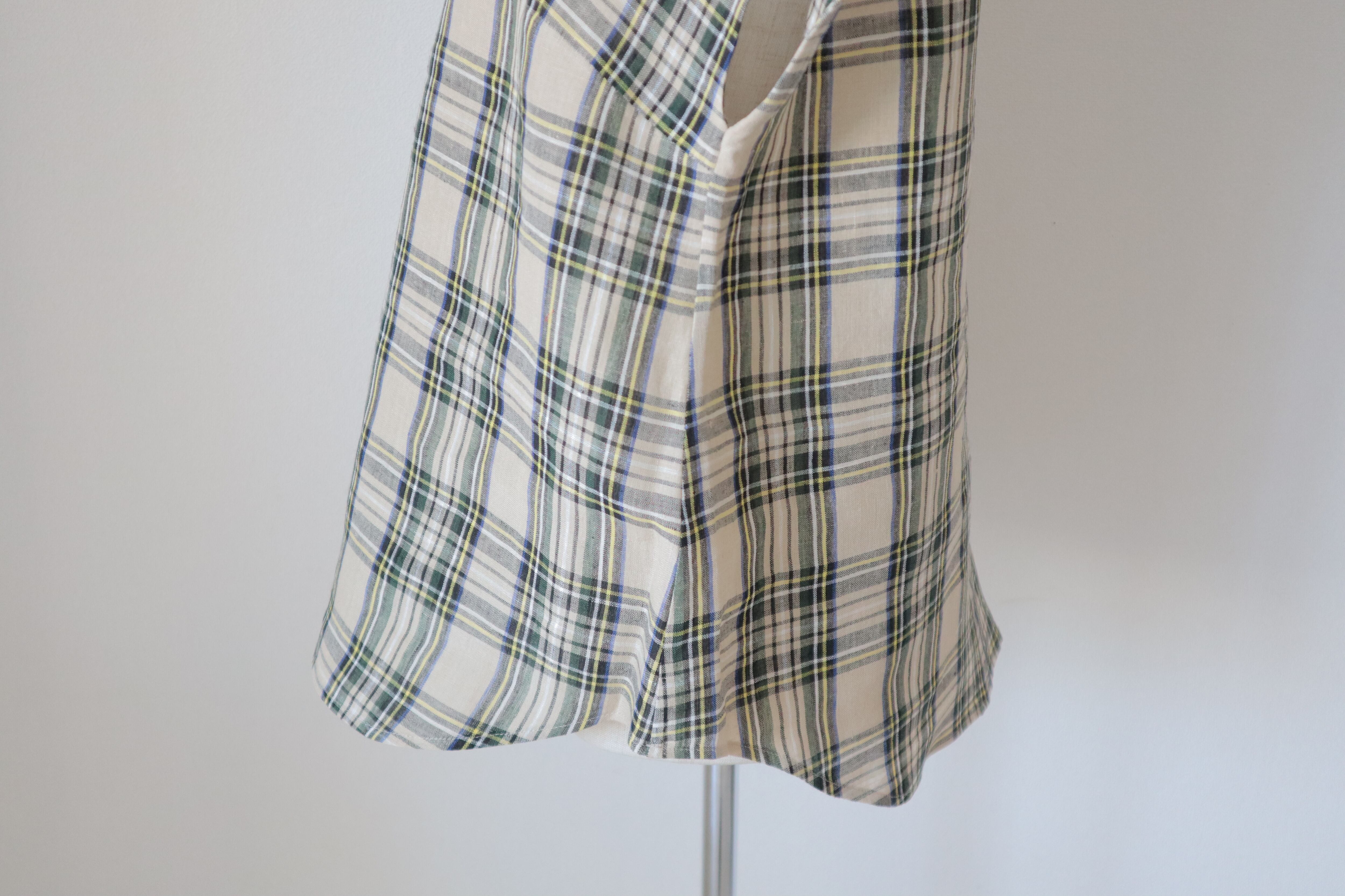 襟にベルベットが施されたクラシックなタータンチェックのノースリーブブラウス。上品な襟デザインが、シンプルなアイテムにエレガンスを加えてくれます。爽やかな素材感と暖かみのある柄使いは、季節問わずお使いいただけます。スカートやパンツに合わせて様々なスタイリングに合わせやすいのも魅力のひとつです。