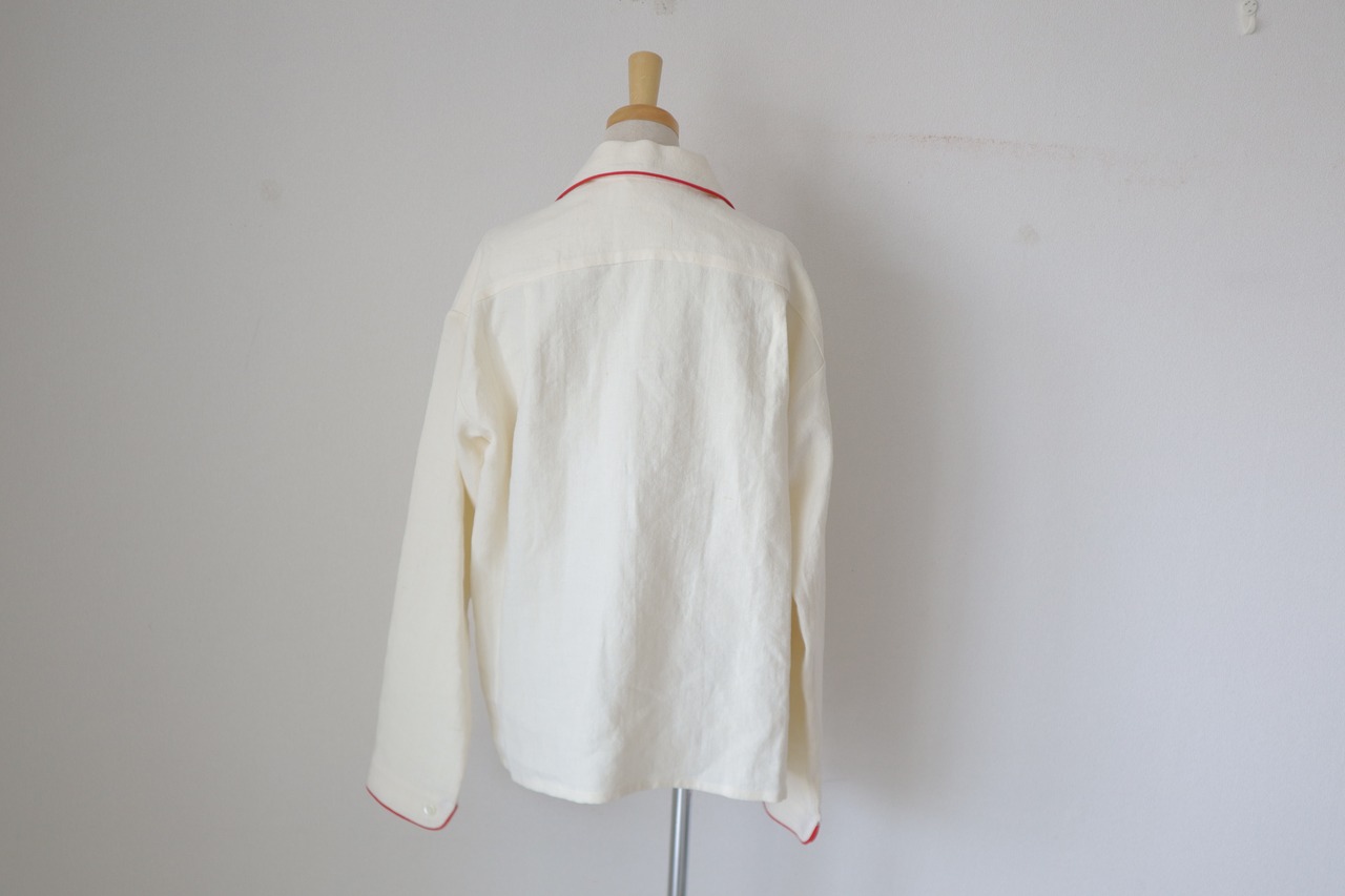 HEMP TRIMMING PAJAMAS JACKETは、上品なデザインが魅力のジャケットブラウスです。襟と袖のトリミングが施されたディテールに加え、胸元のR&D刺繍がさりげないアクセントとなっています。