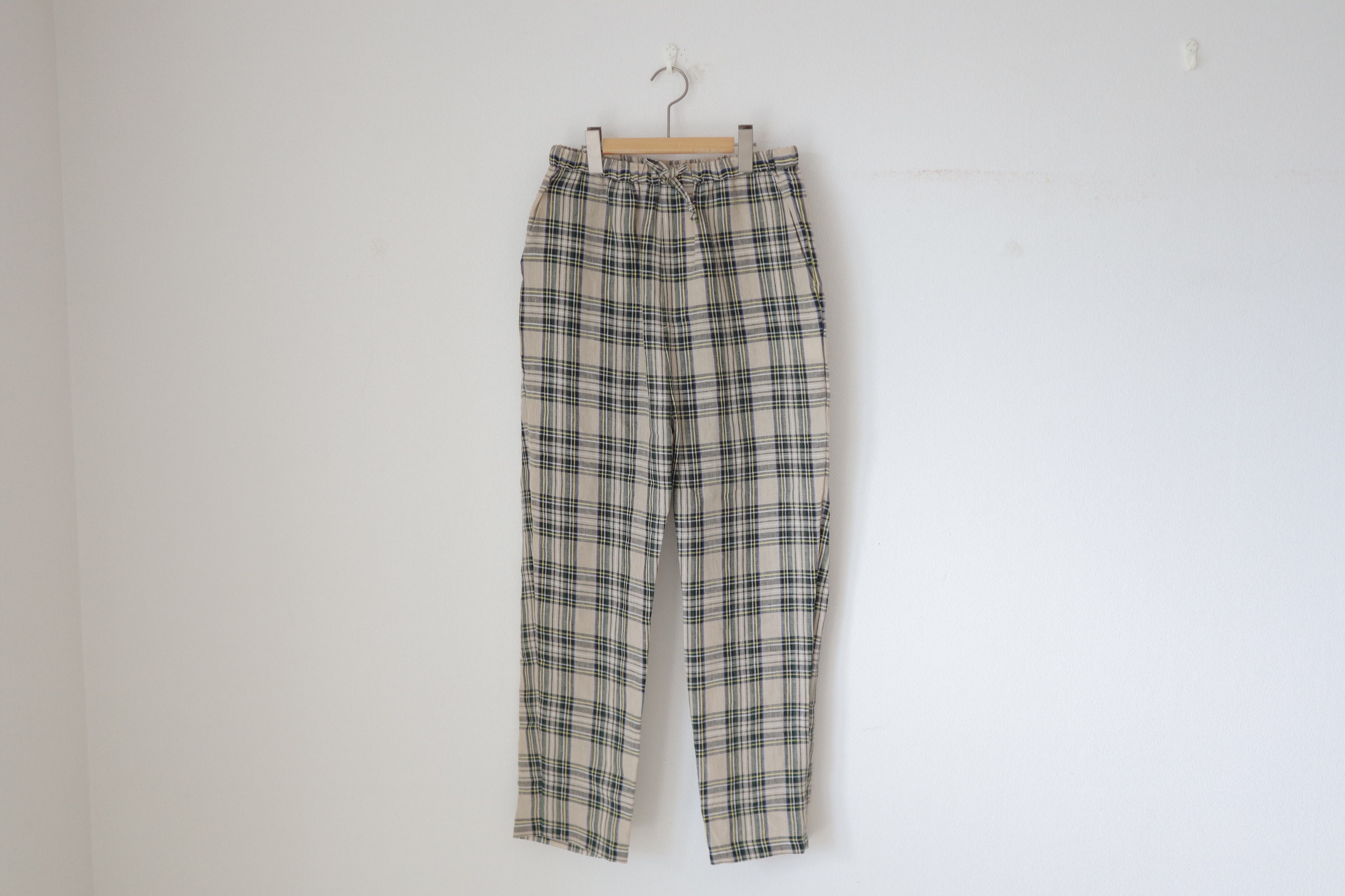 R&D.M.Co-で定評のある上品なタータンチェックシリーズのターペードパンツです。ウエスト部分には調節可能なストリングが付いており、快適なフィット感を実現します。脚に向かってテーパードがかかっており、スタイリッシュな印象を与える一本です。