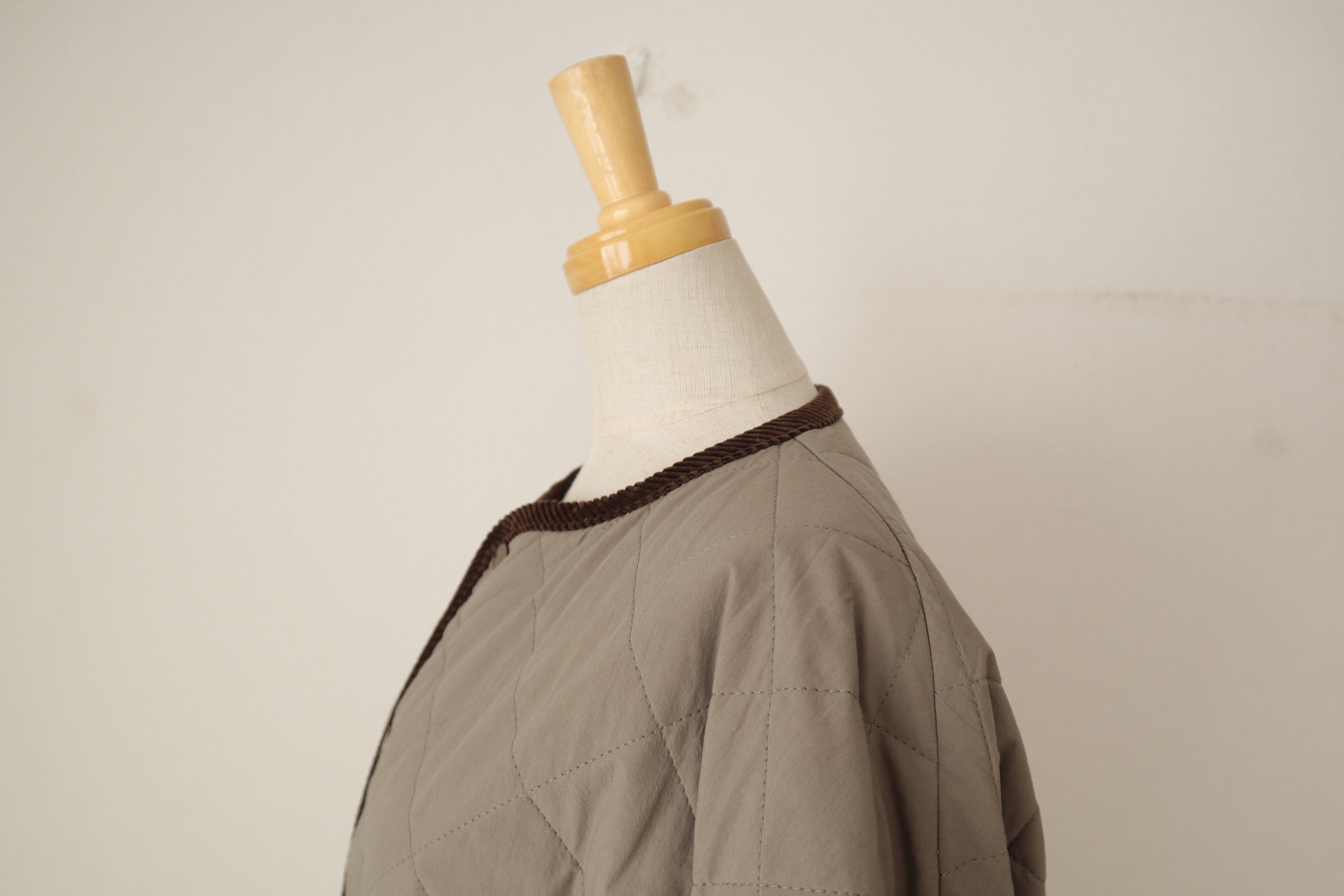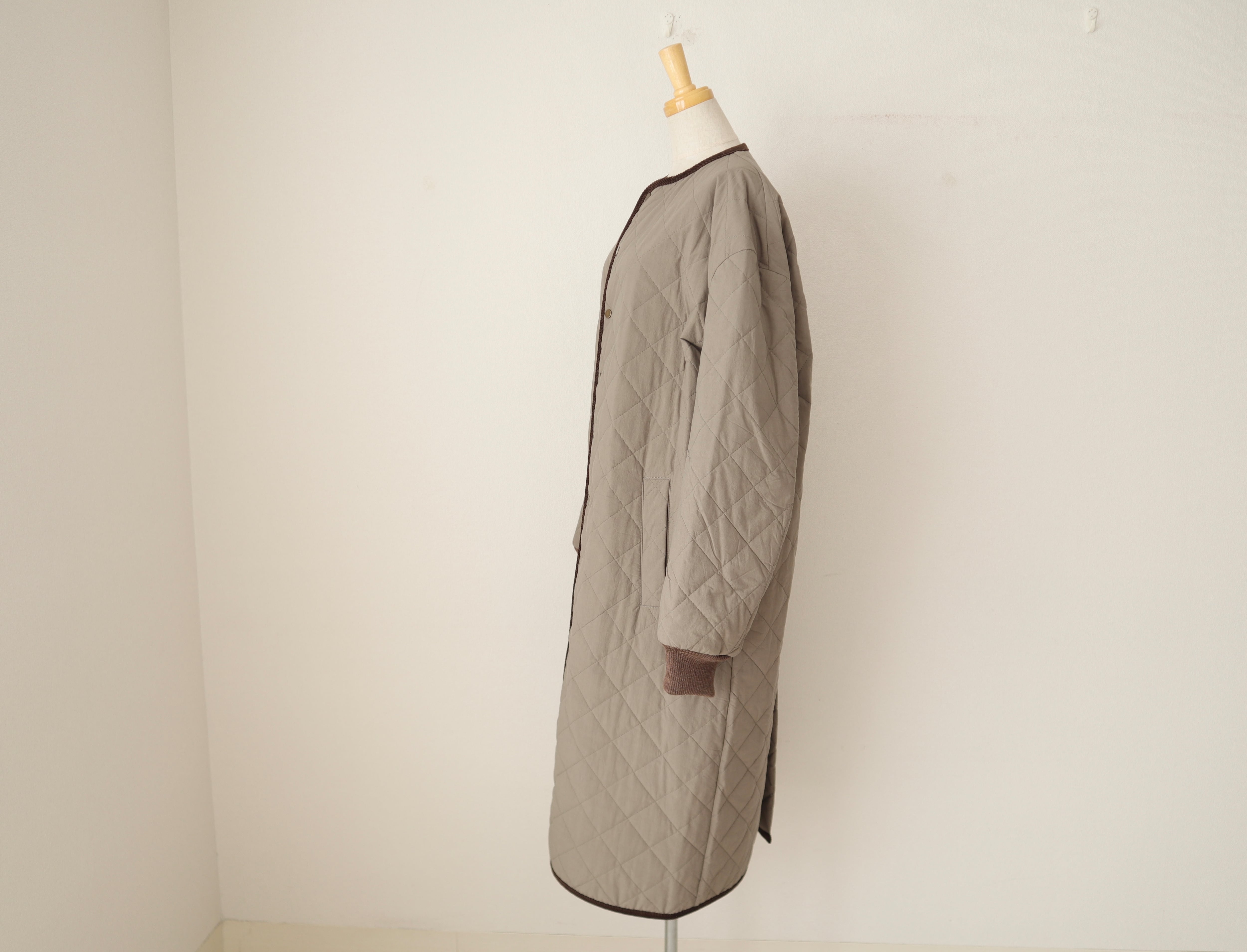 キルティング素材を使用したスタイリッシュなロングコートです。お洒落なコーデュロイのトリミングが、全体の印象を引き締めています。軽やかな素材感と長めの丈が絶妙にバランスを取り、体型を美しく見せる効果があります。カジュアルからキレイめまで幅広いスタイルにマッチするため、日常使いはもちろん、特別なお出かけシーンでも華やかさを演出します。シンプルなデザインの中にちょっとしたアクセントがあるので、コーディネートの幅も広がります。冬の必須アイテムとして重宝するコートです。